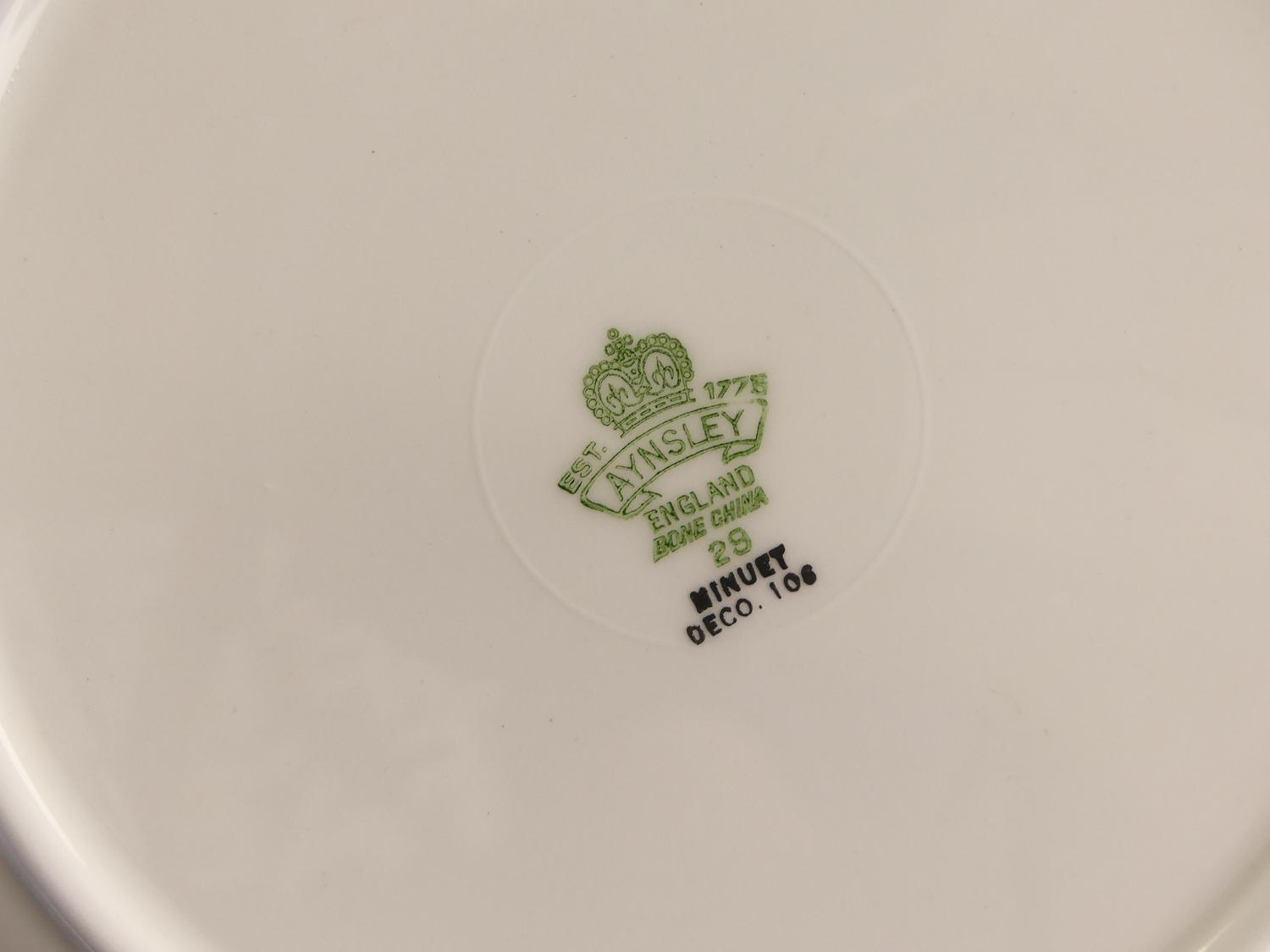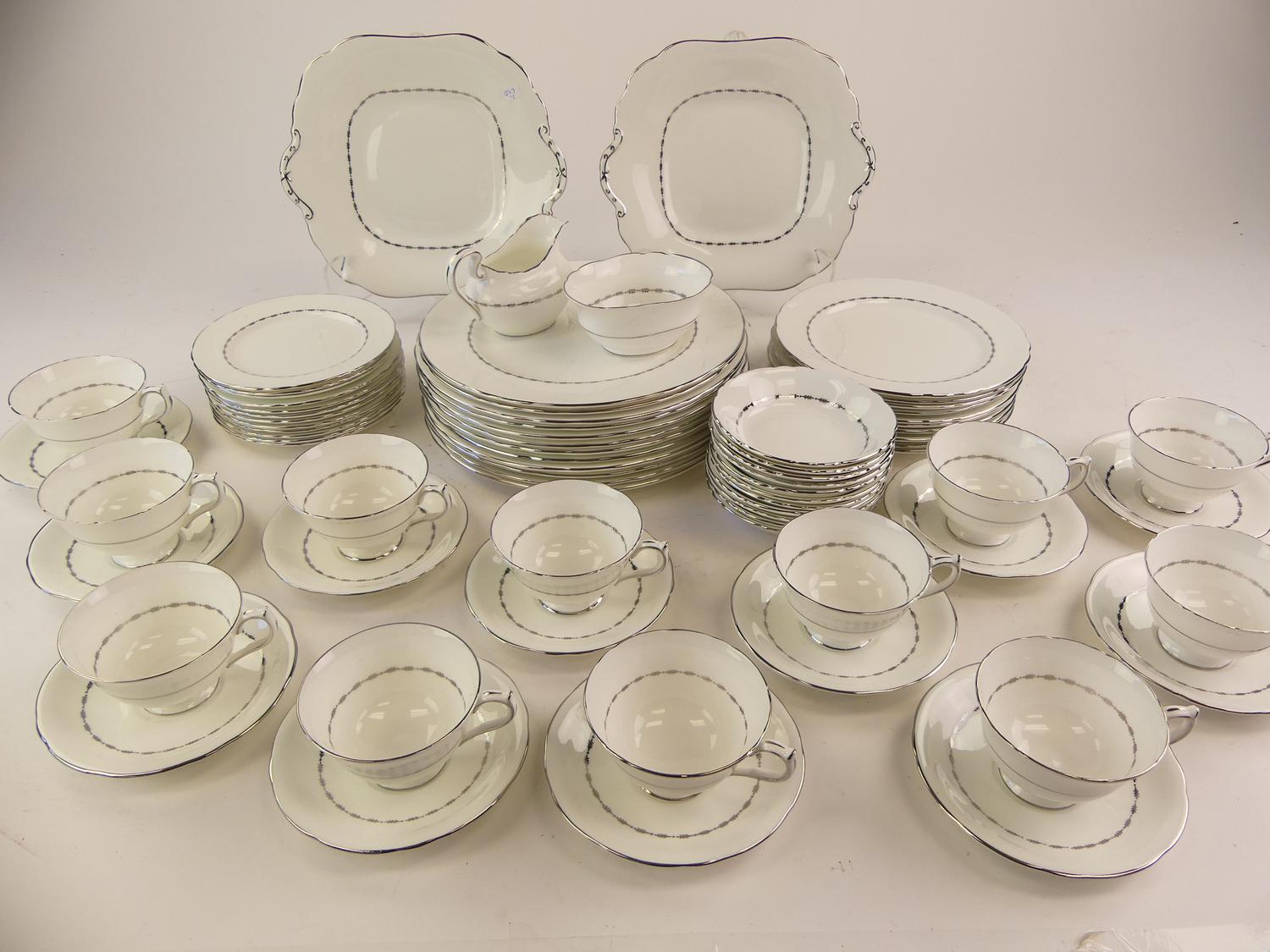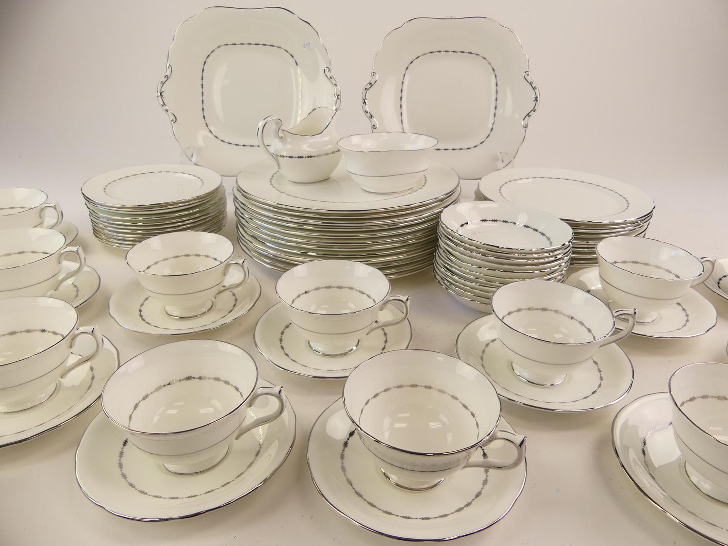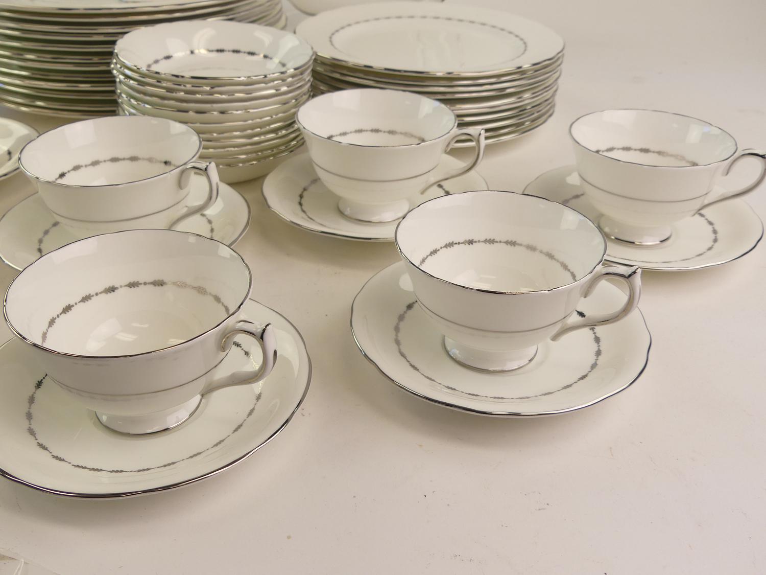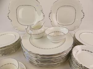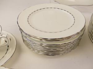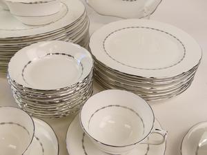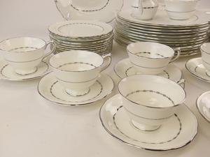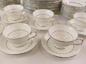 12 10" dinner plates10 8" salad plates12 6 1/4" side plates12 cups and saucers11 fruit dishes2 10" handled cake plates1 open sugar bowl1 small creamer