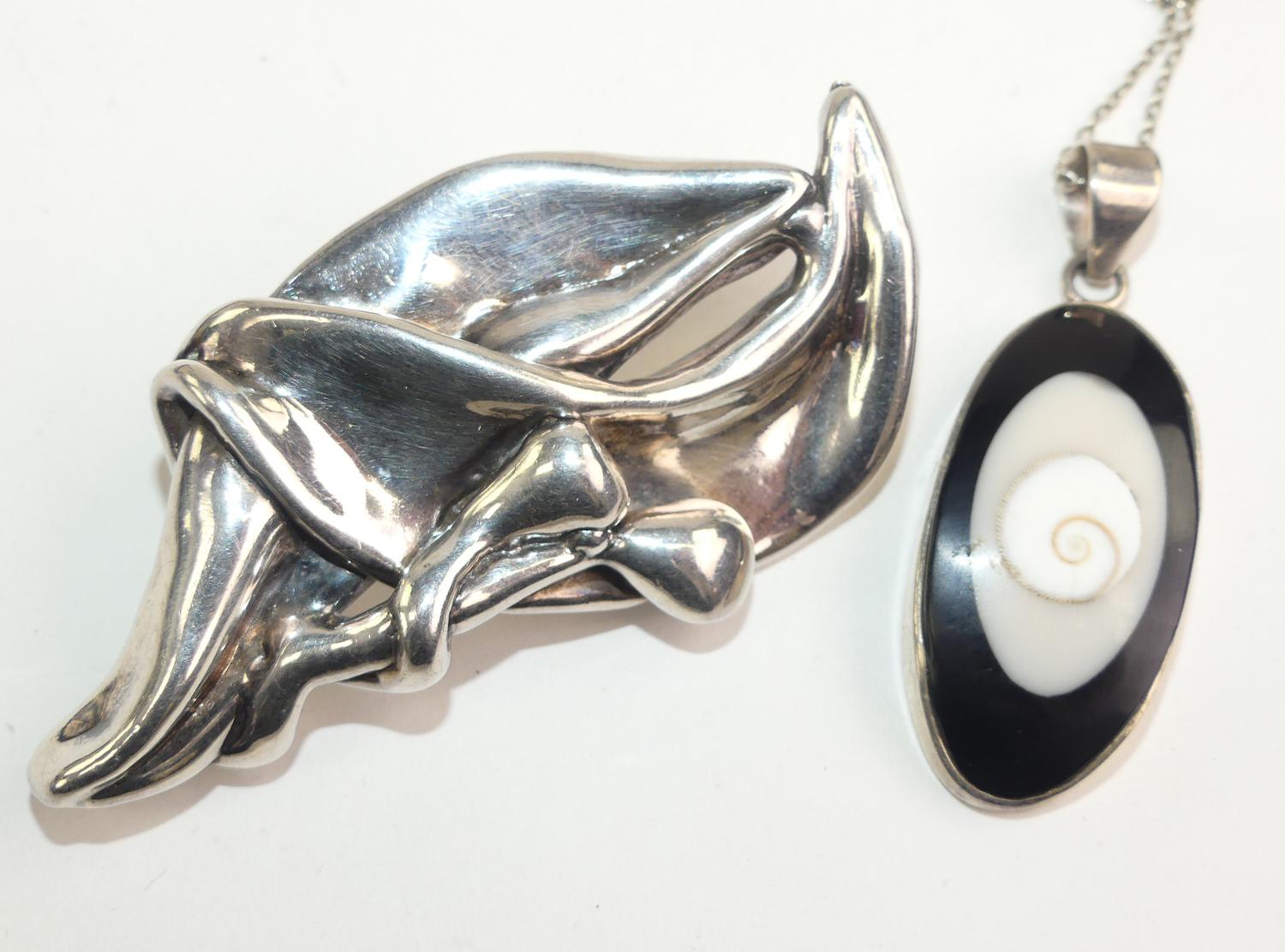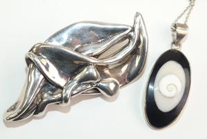 silver mod brooch and shell necklace
