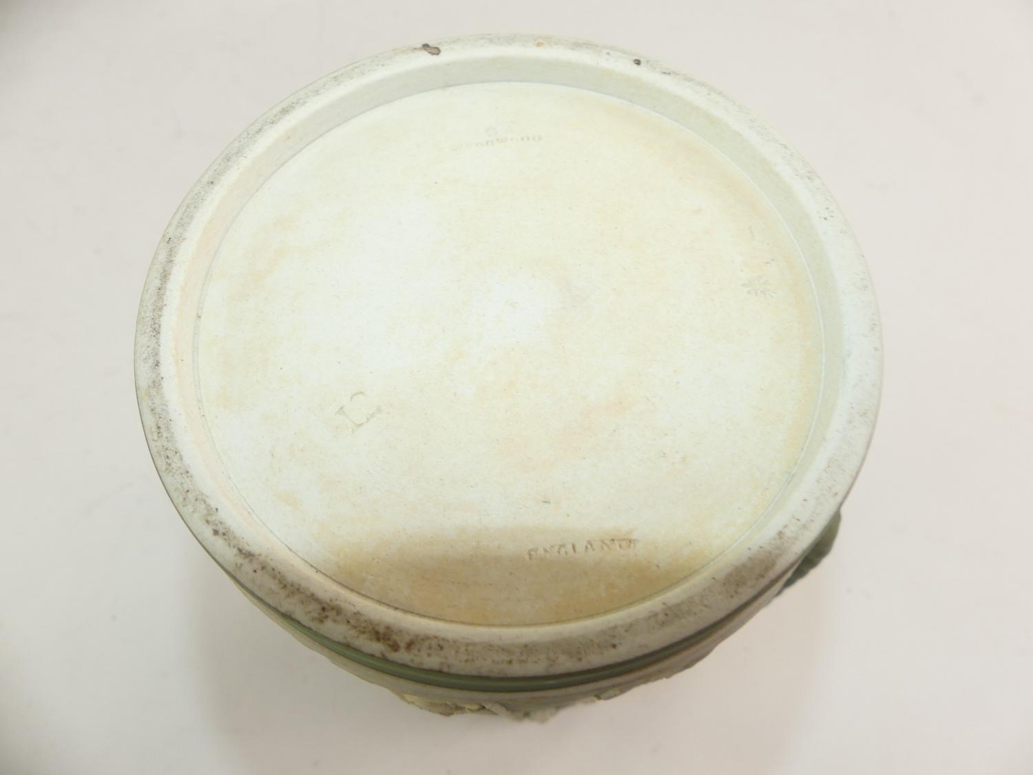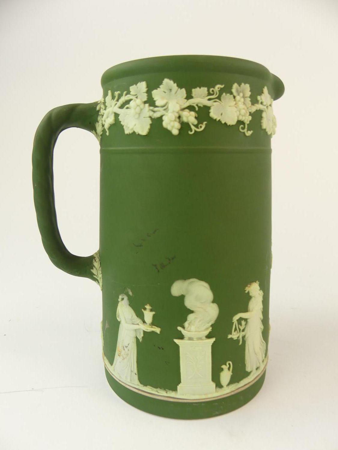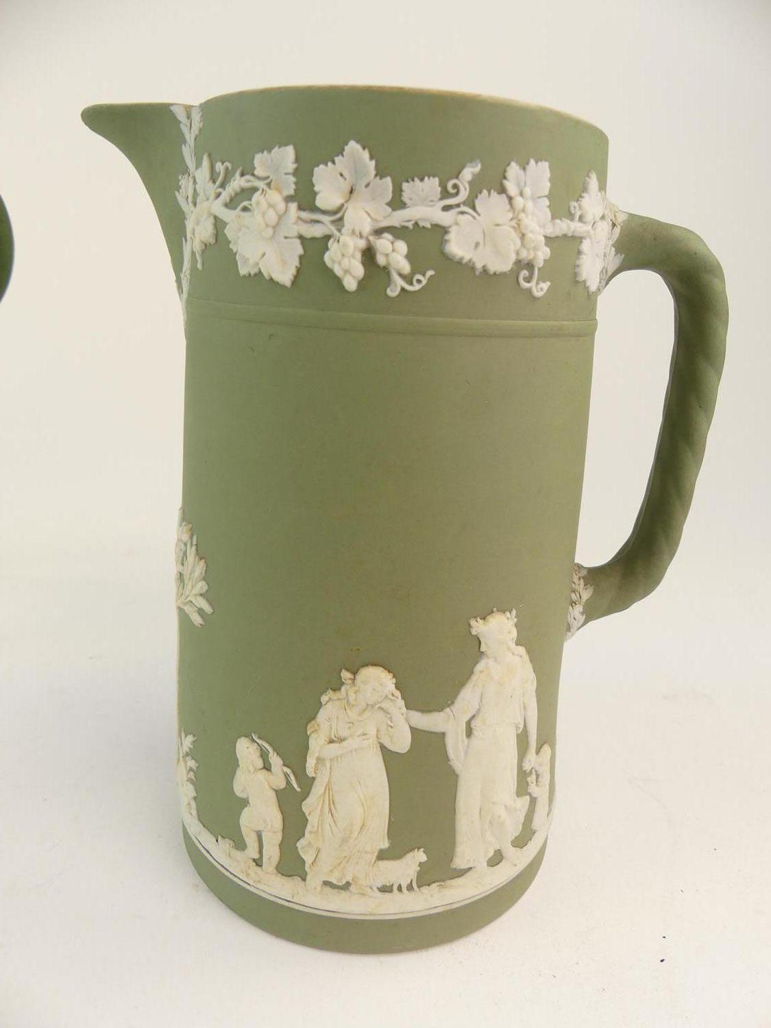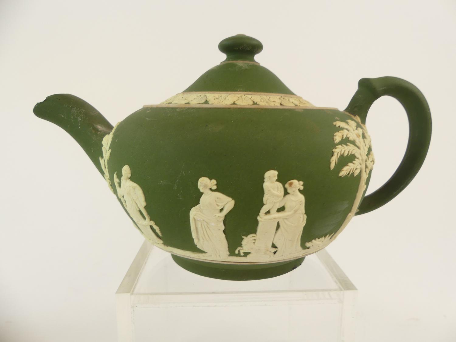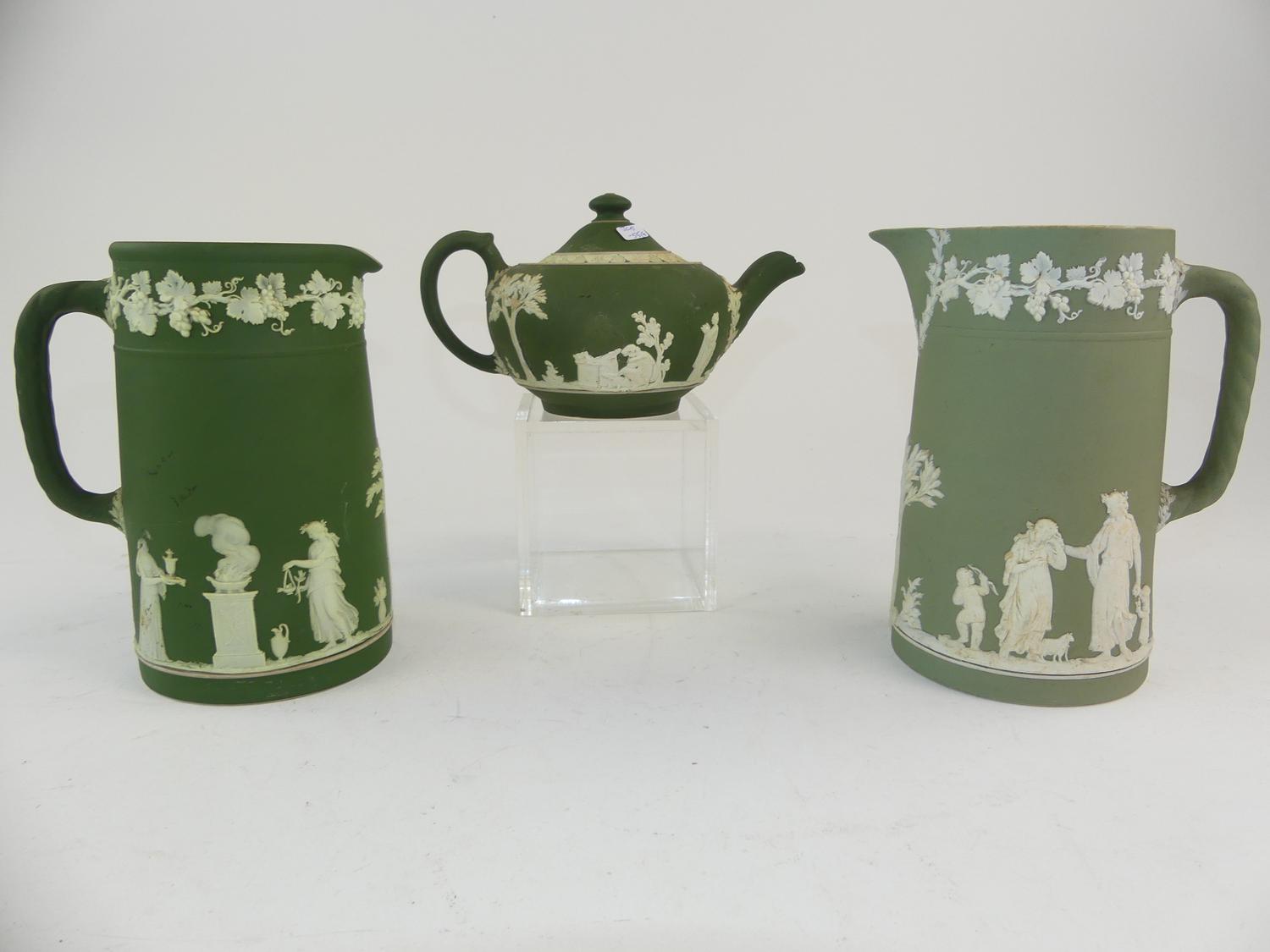 three pieces of wedgewood green jasperware, chip on spout of teapot, ht. 7 1/2" and smaller
