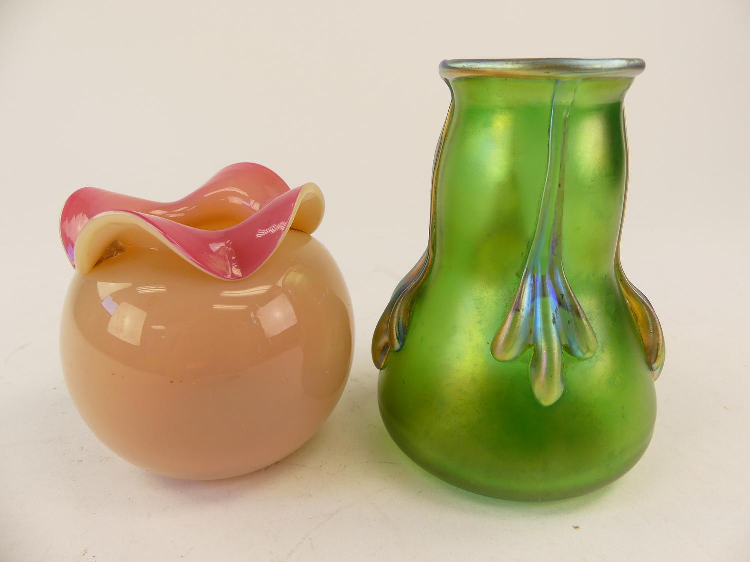 art nouveau lustre vase with a pink art glass vase, ht. 5" and smaller