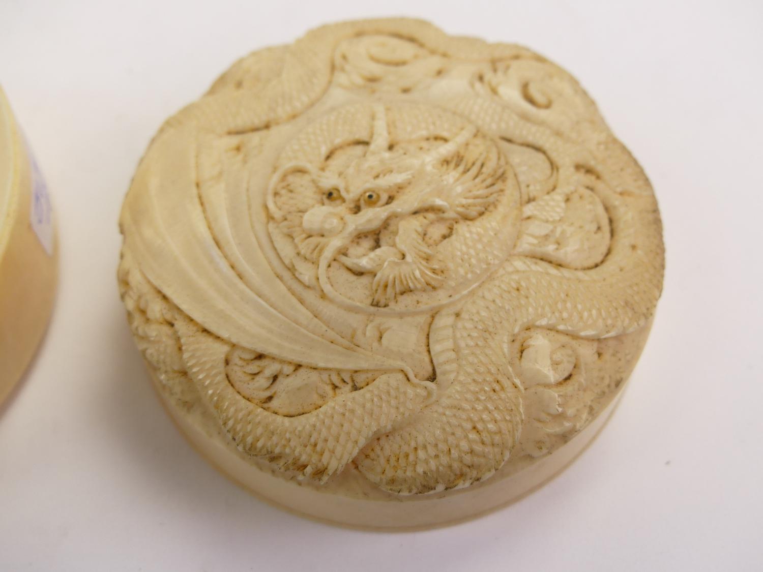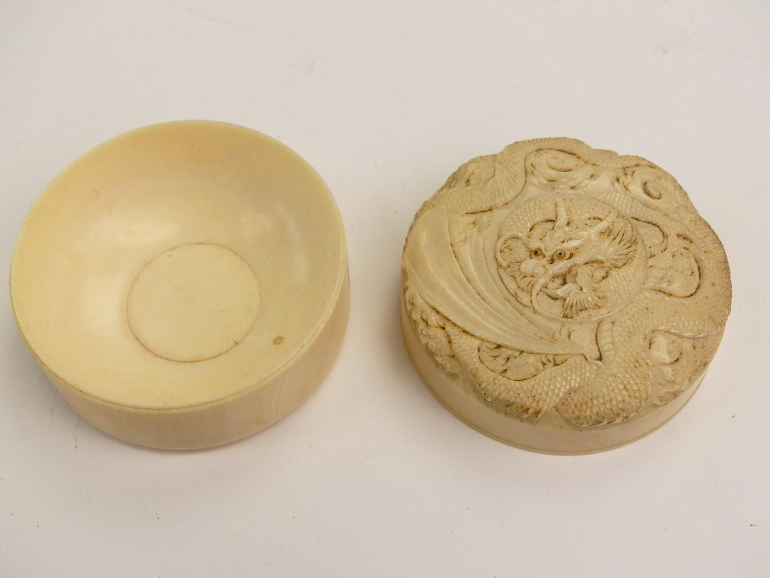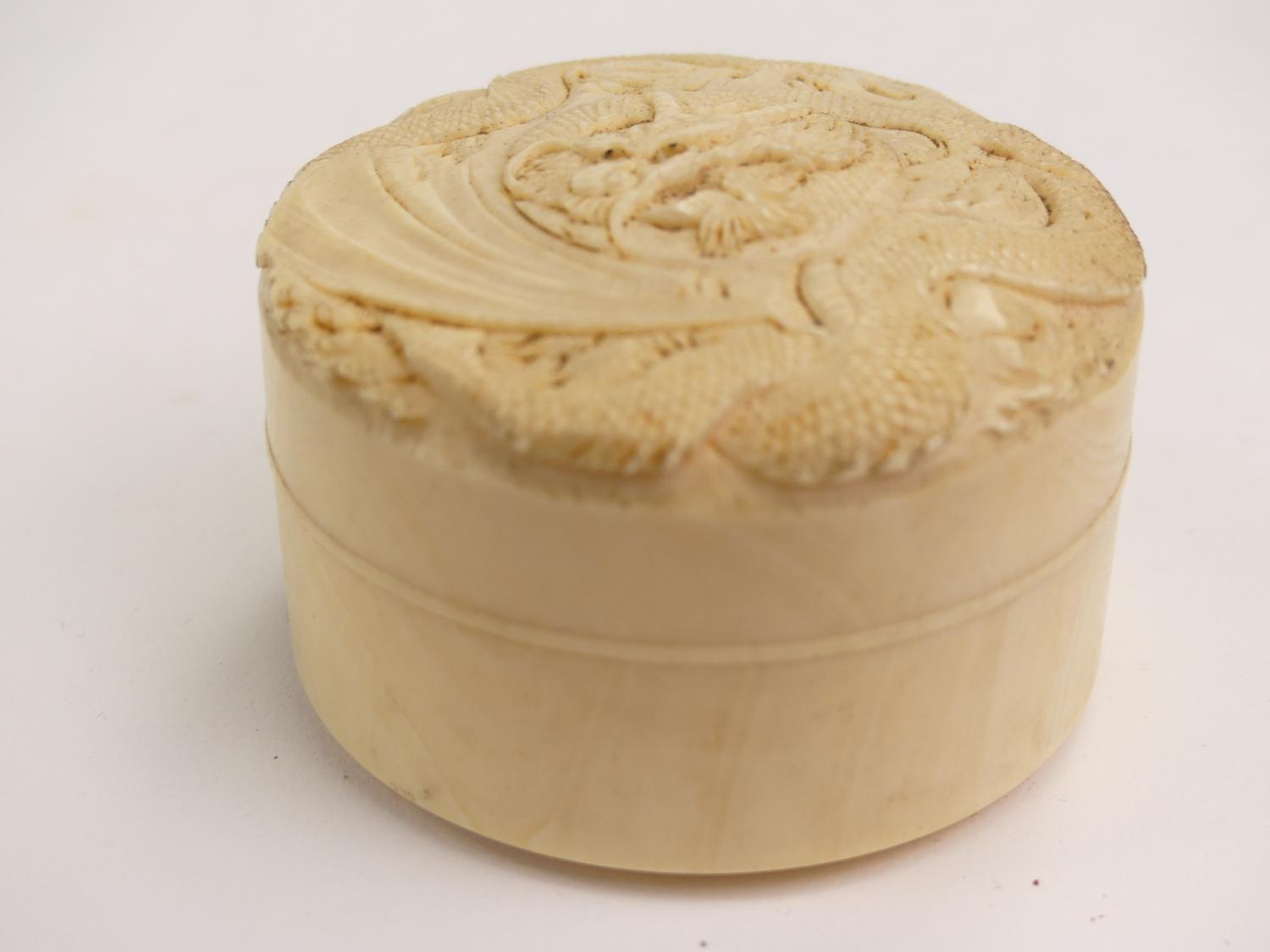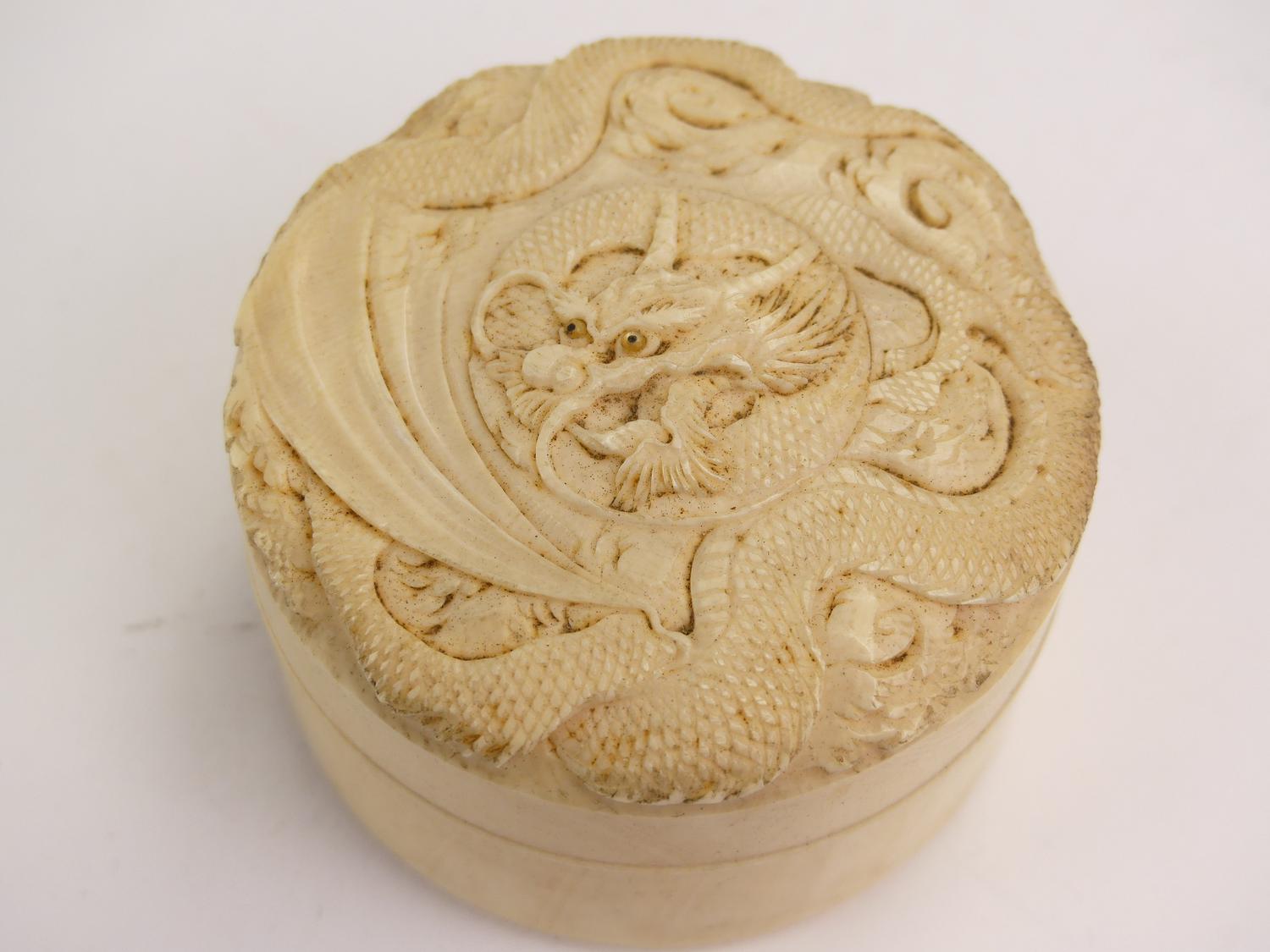 carved ivory dragon motif box, early 20th century, 1 3/4" x 2 1/2"
