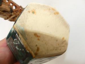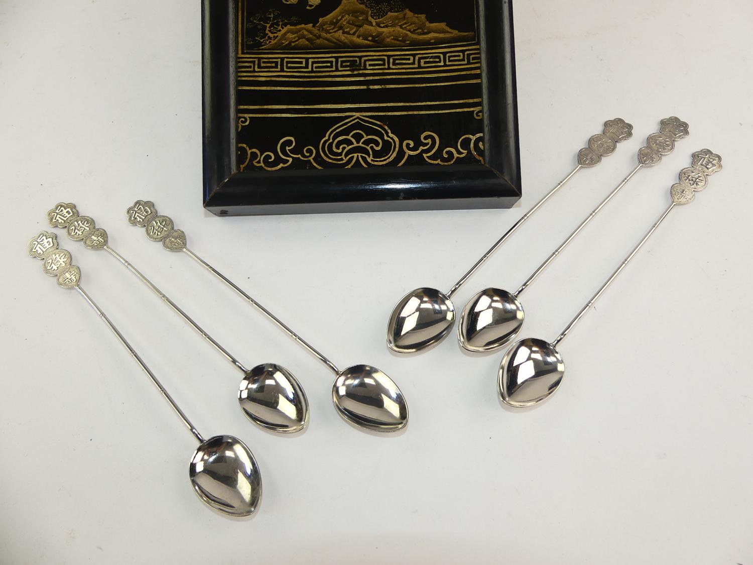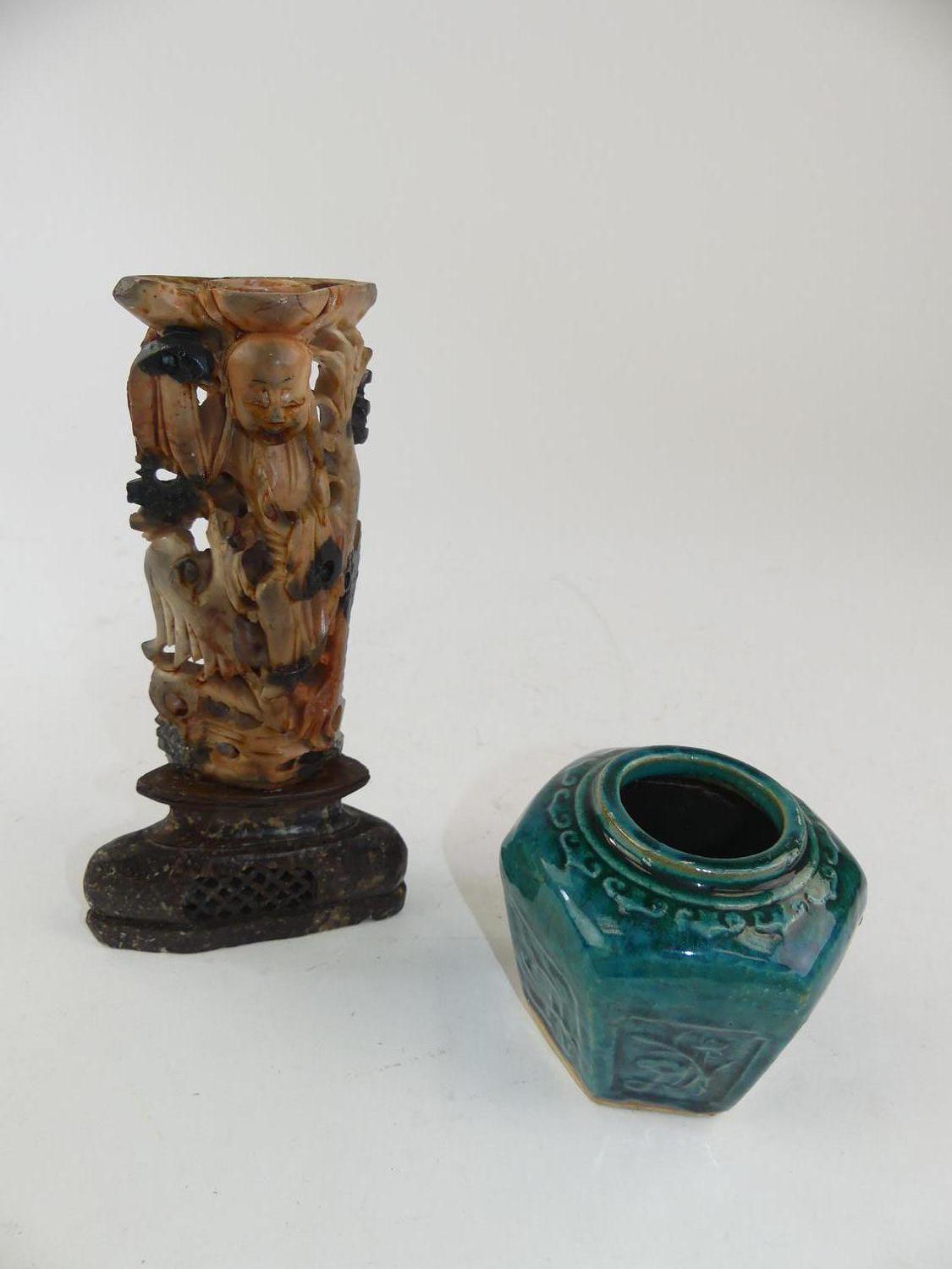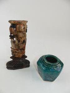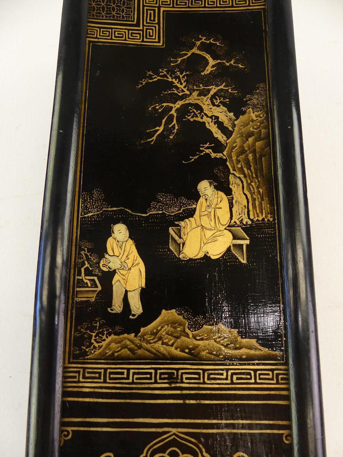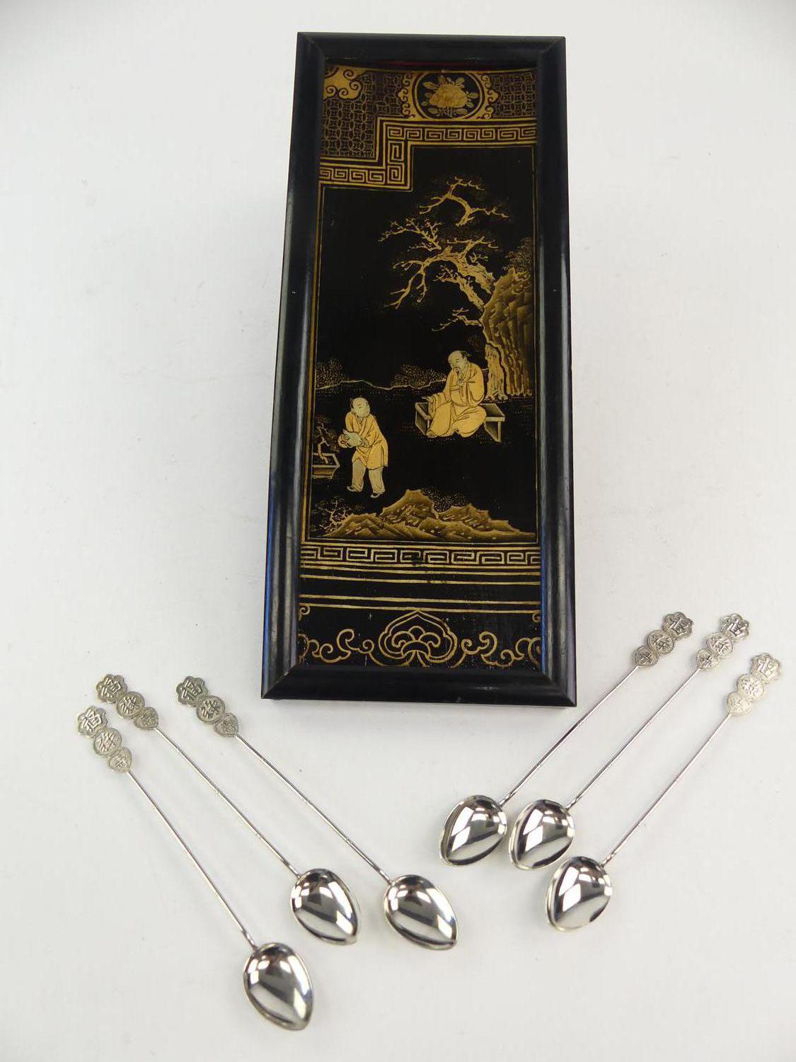 chinese lacquered panel 15" x 6" with a carved hardstone figural candlestick, ginger pot and spoons
