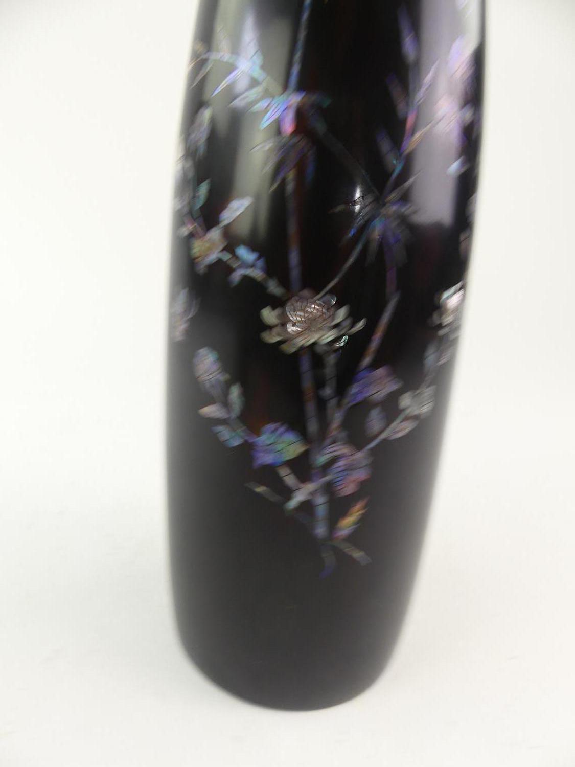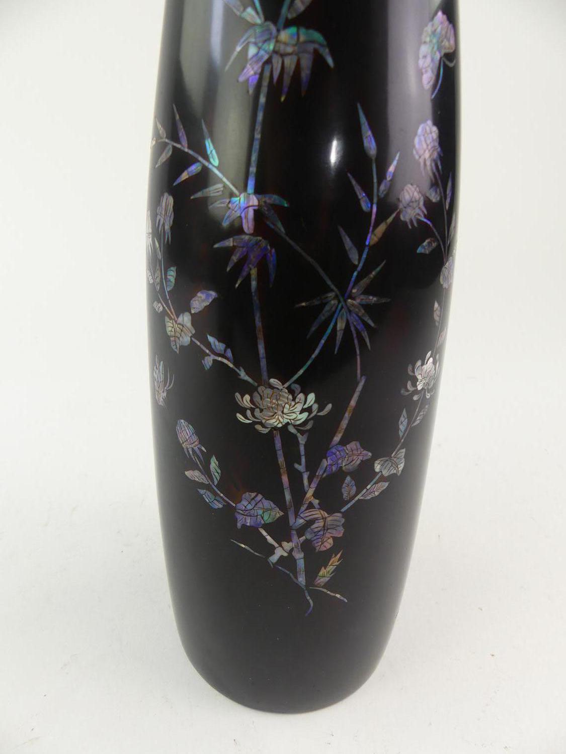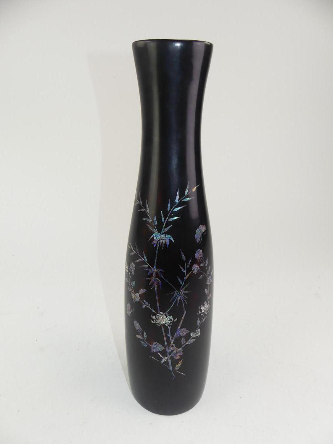 mid 20th century mother of pearl inlaid lacquered vase, ht 17 1/2"