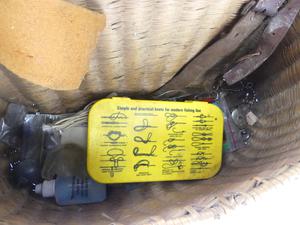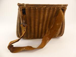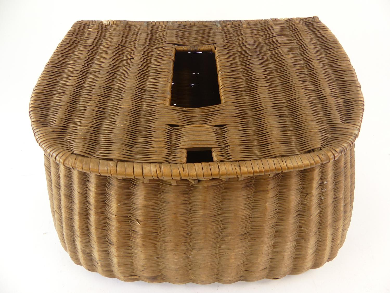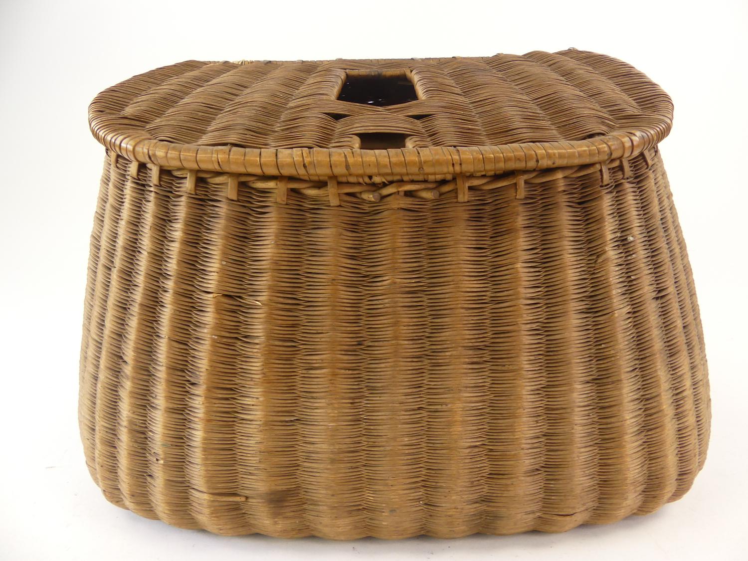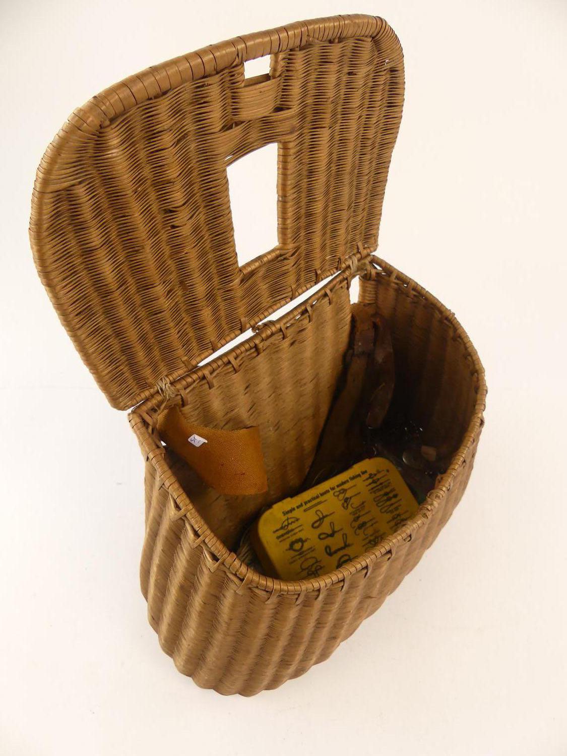 early finely woven fishing creel, with contents, 10 1/2" x 16" x 6"