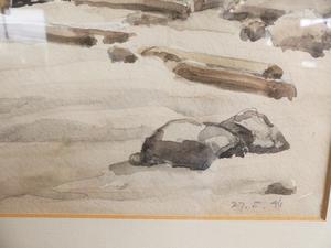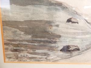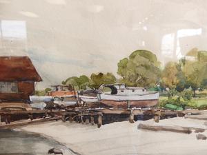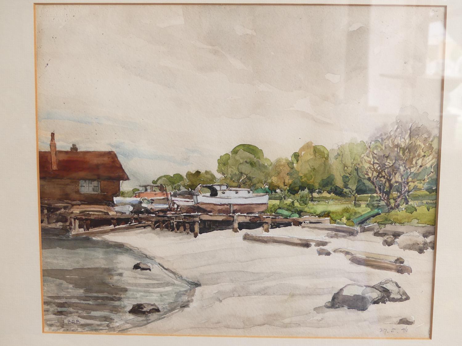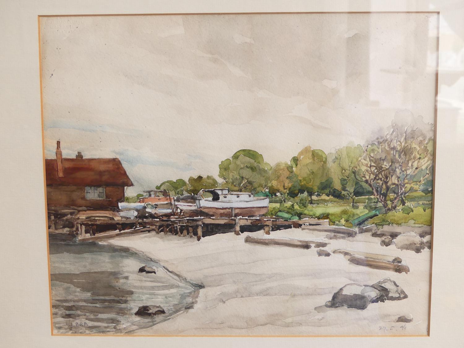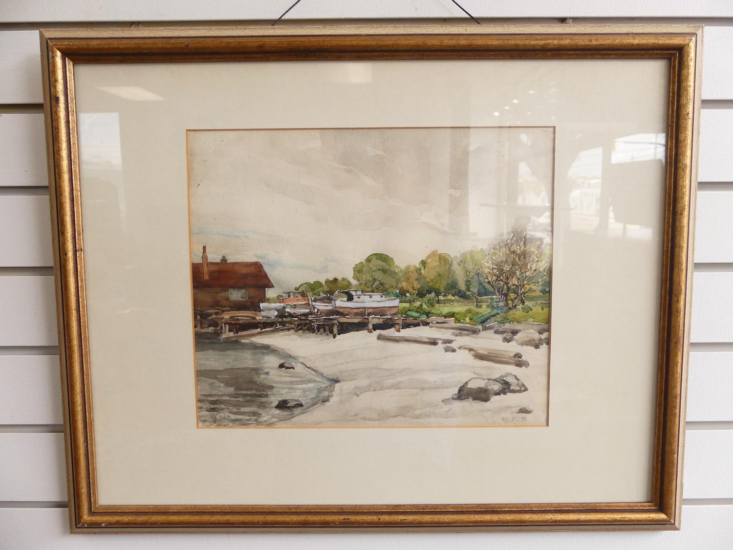 bears initials b.r.b., watercolour, d.1946, 10 1/2" x 12 1/2", "untitled-shoreline with boats"