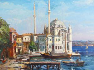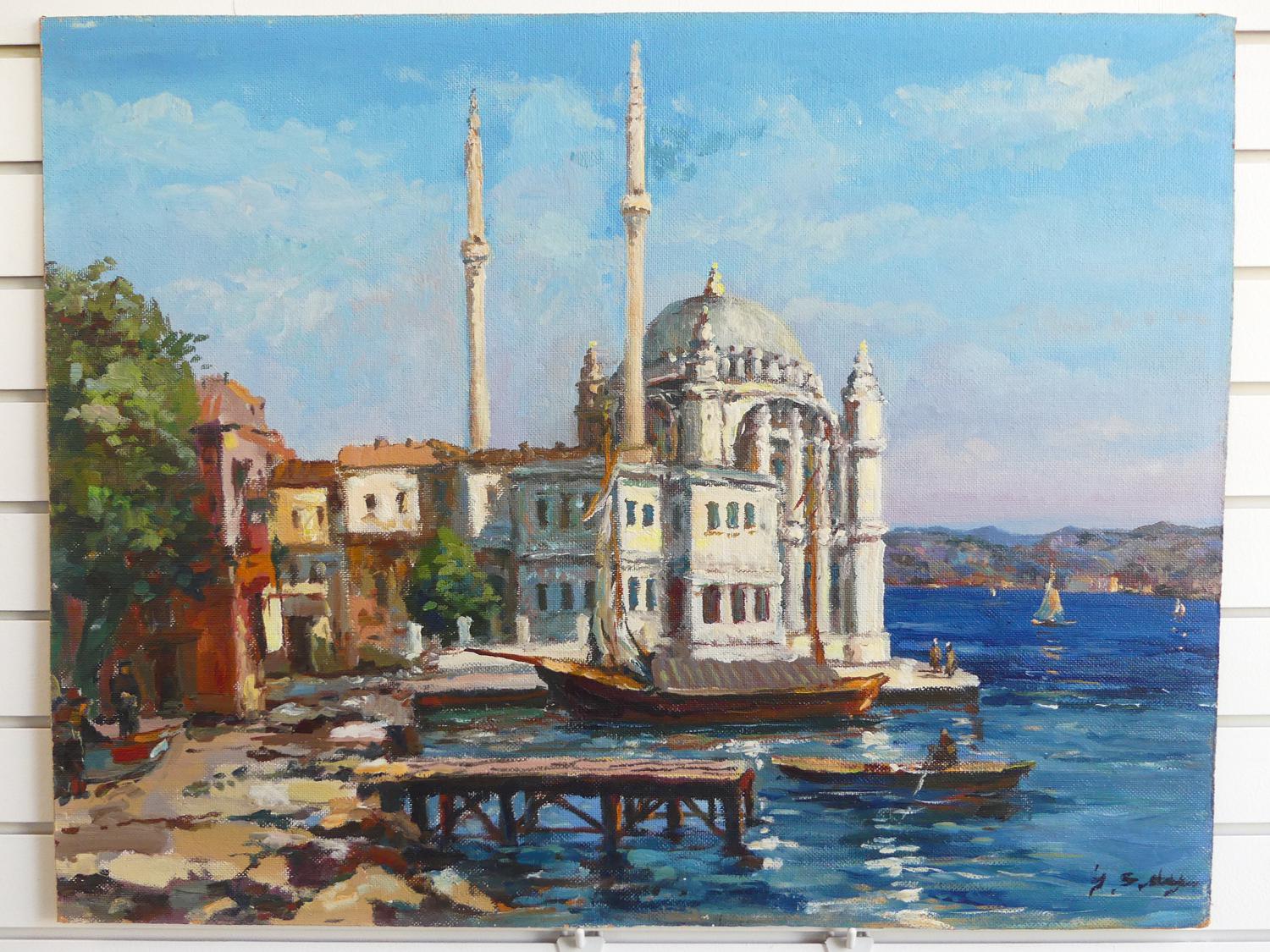 early 20th century turkish school, oil on board, 24" x 31", indistinctly signed, "ortakoy mosque, istanbul"