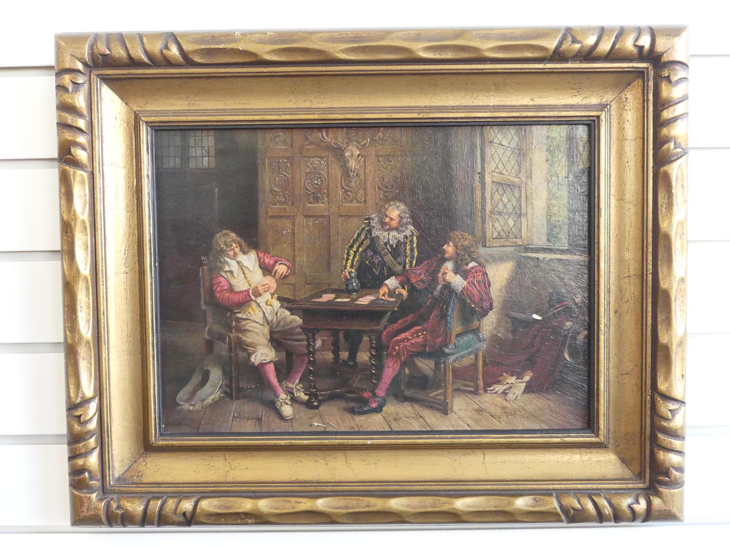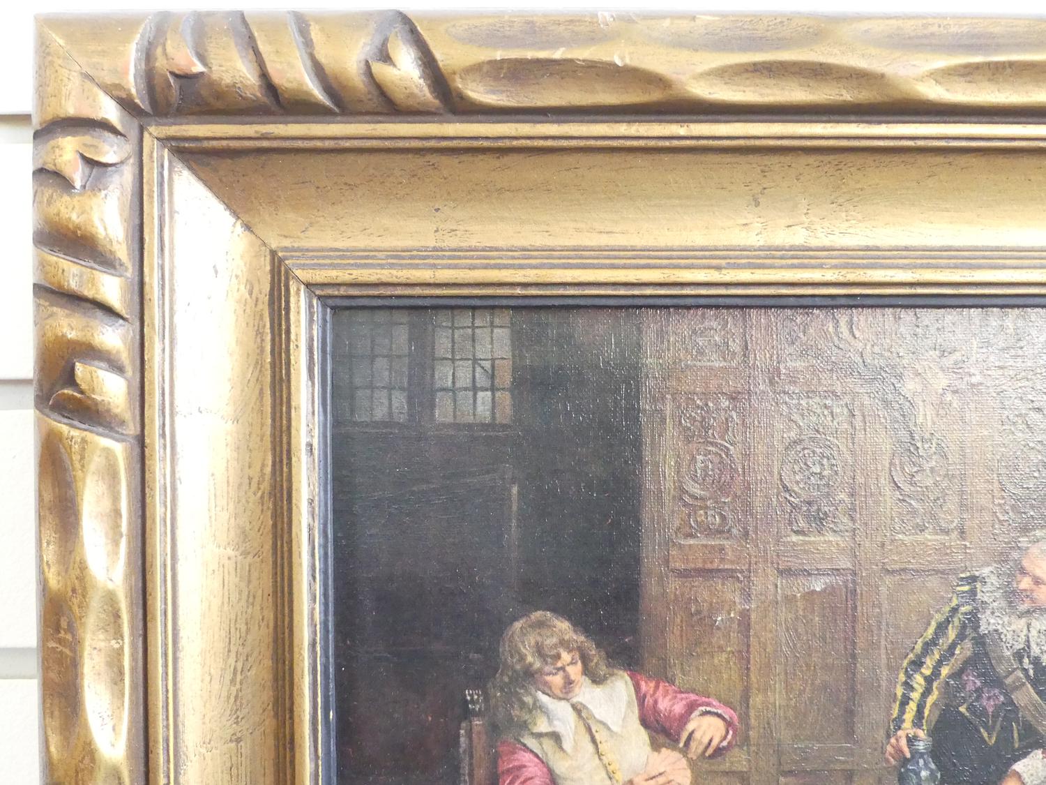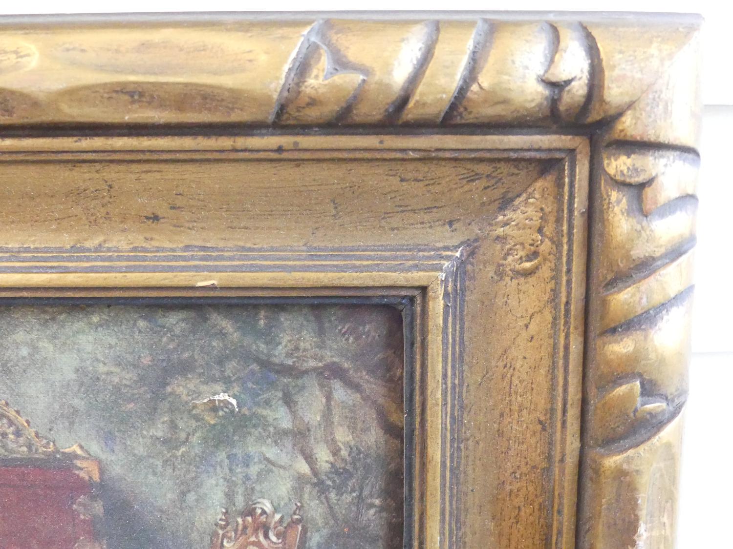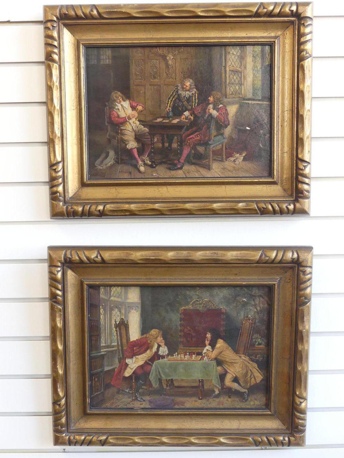 pair of gilt framed canvas prints of 17th century interior scenes, overall 15 1/2" x 19"