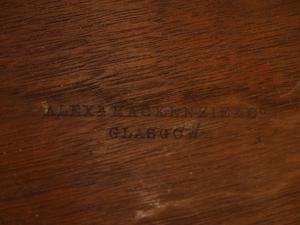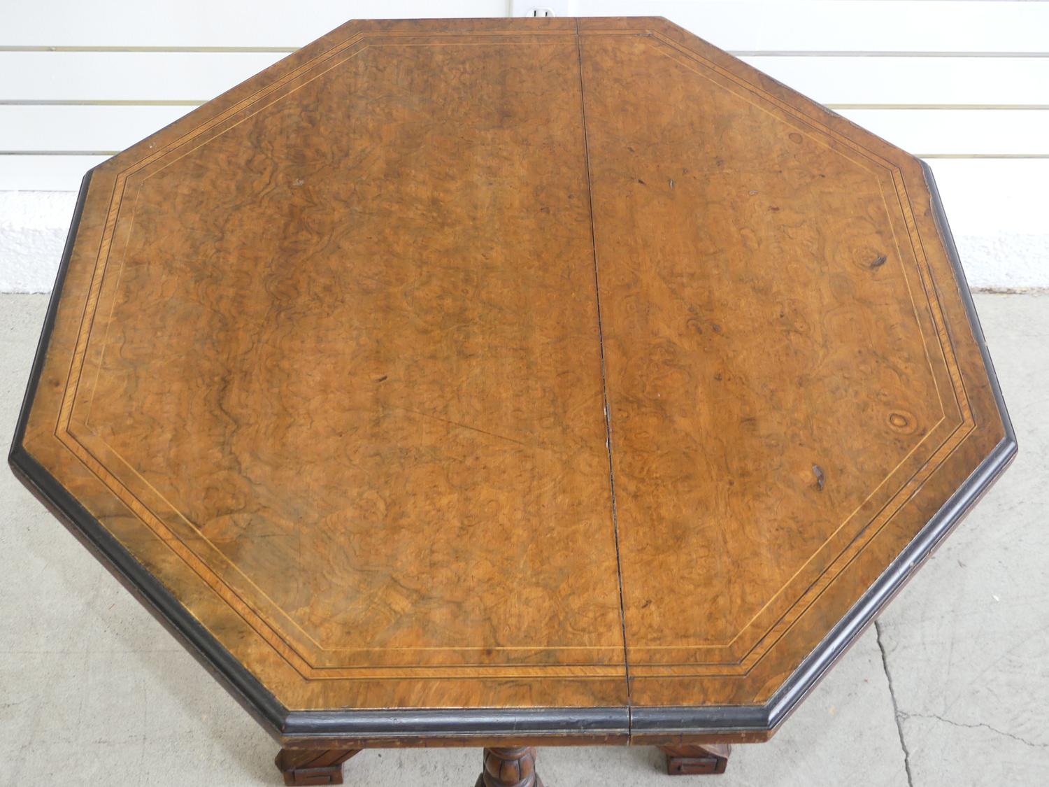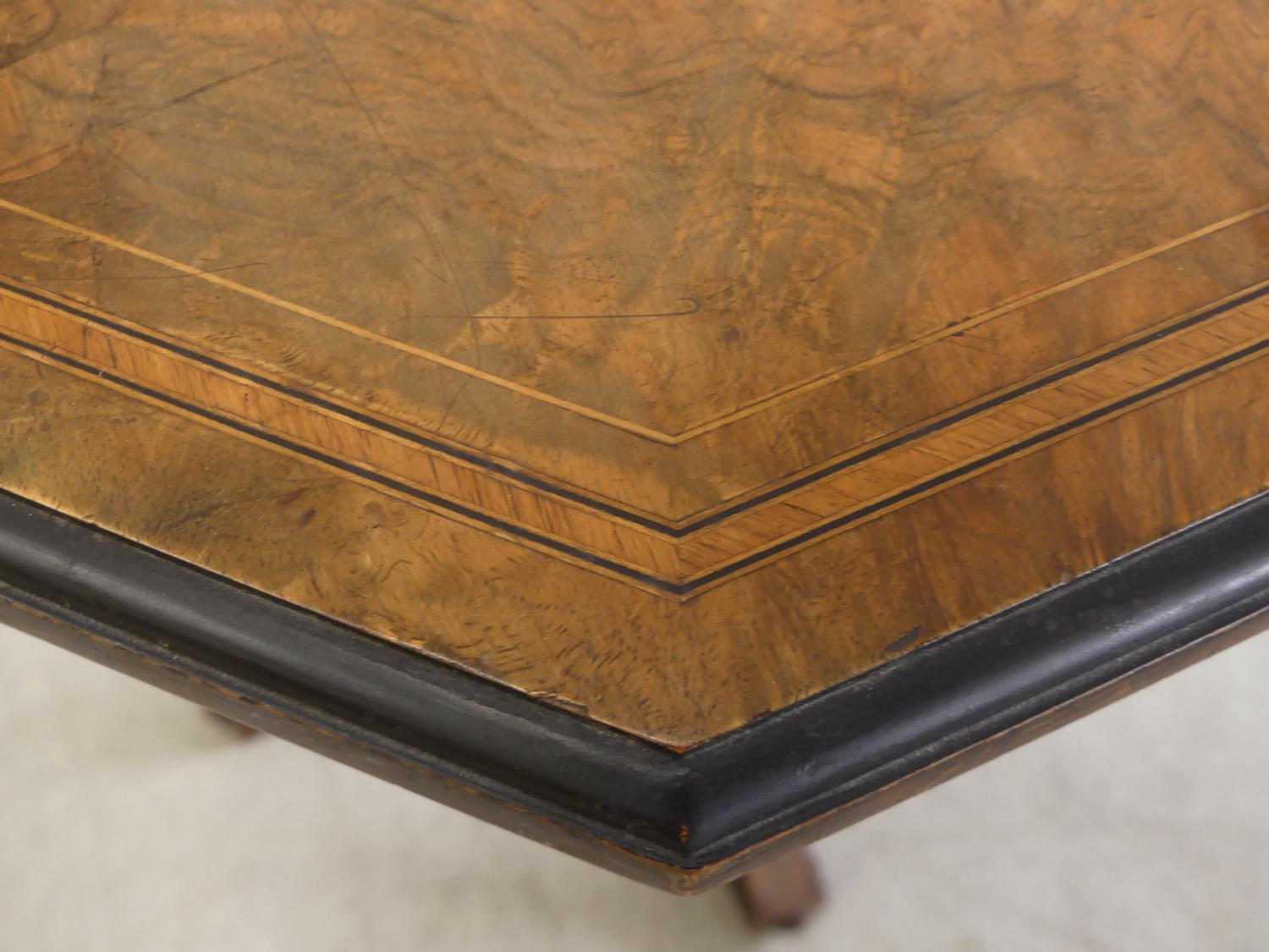 19th century inlaid burl walnut pedestal table, bearing makers mark of alex mackenzie & co., glasgow, c.1870, 26" x 23"