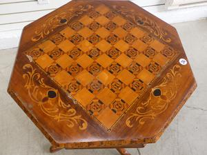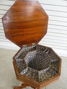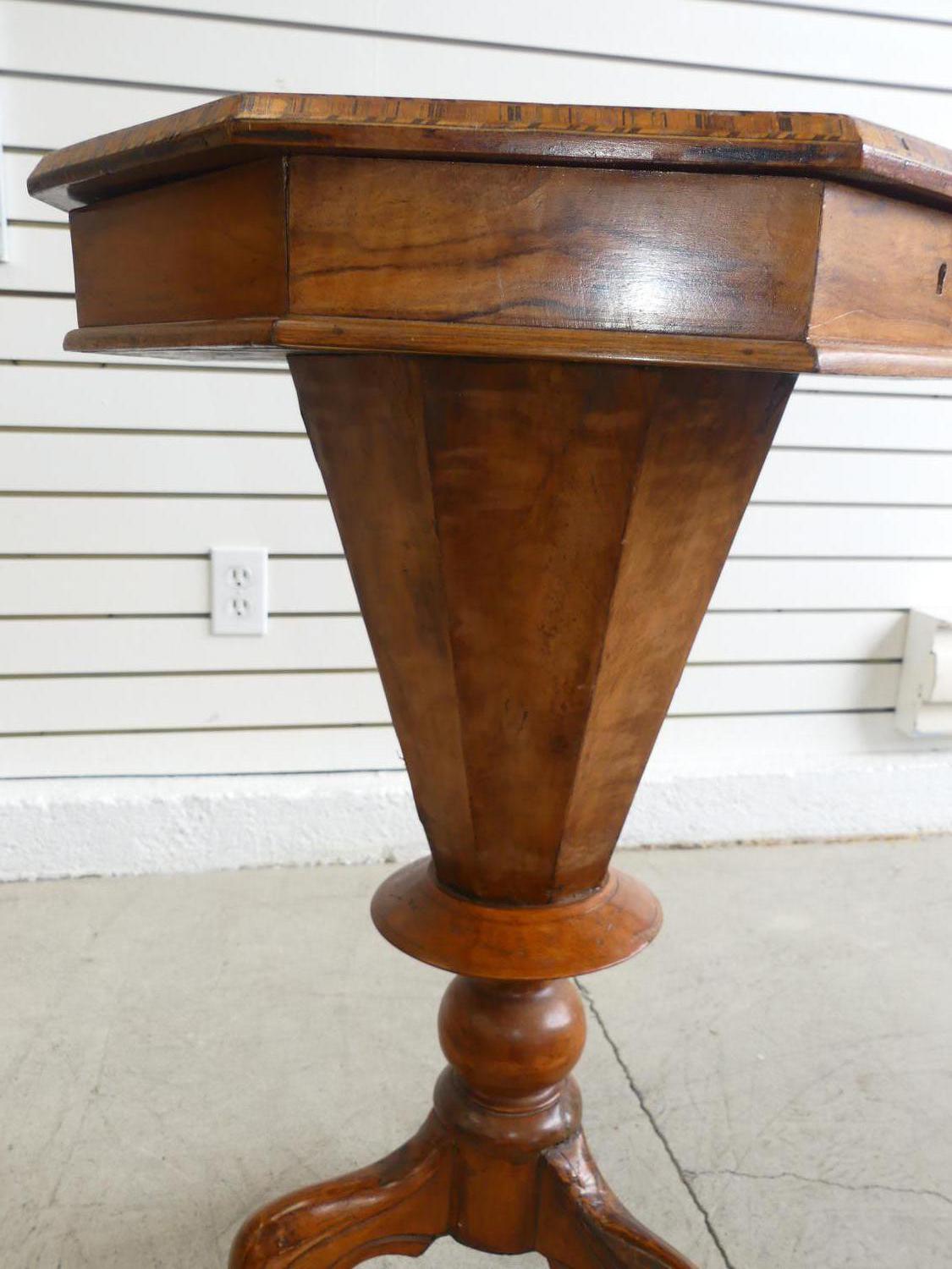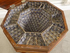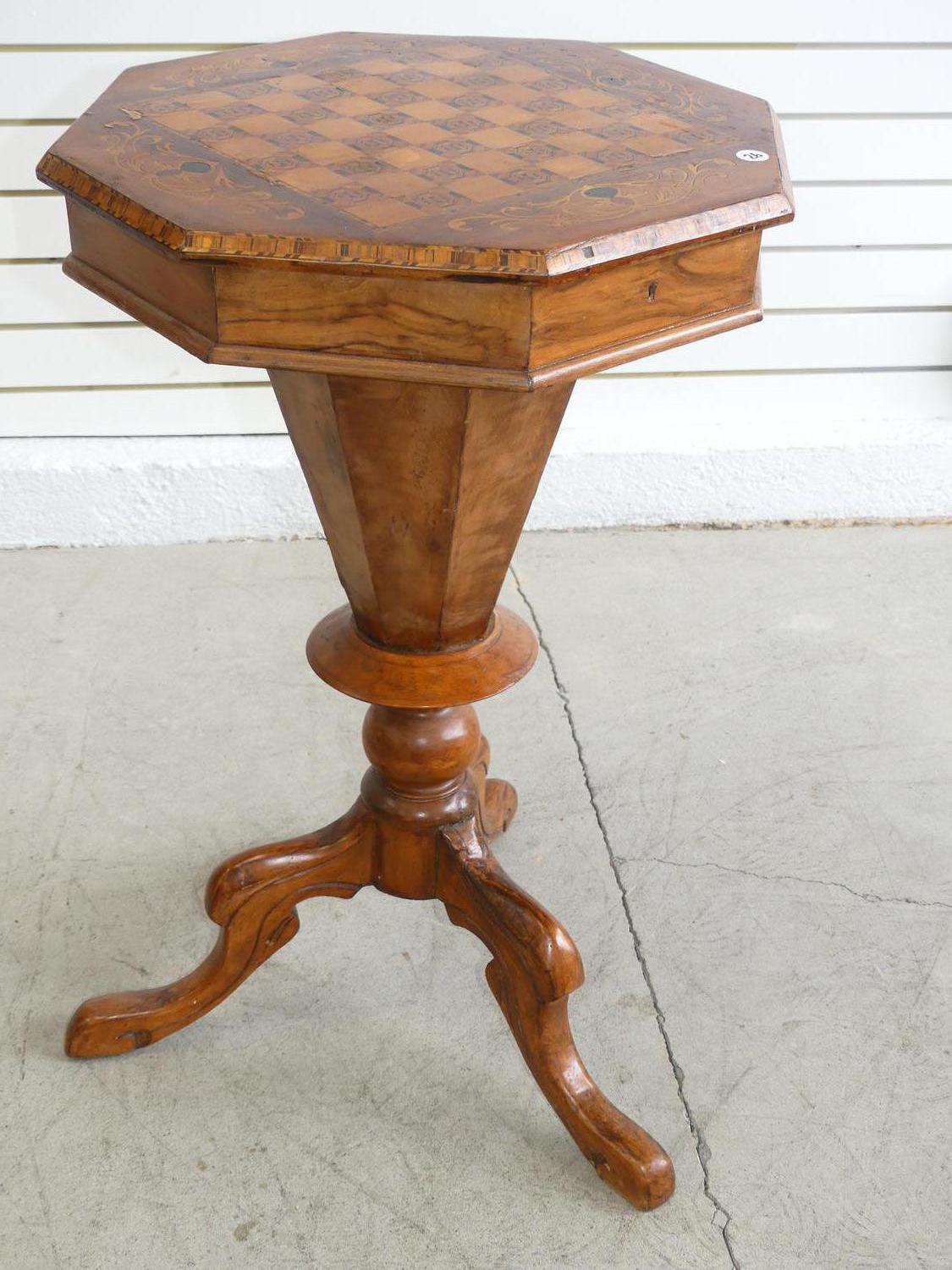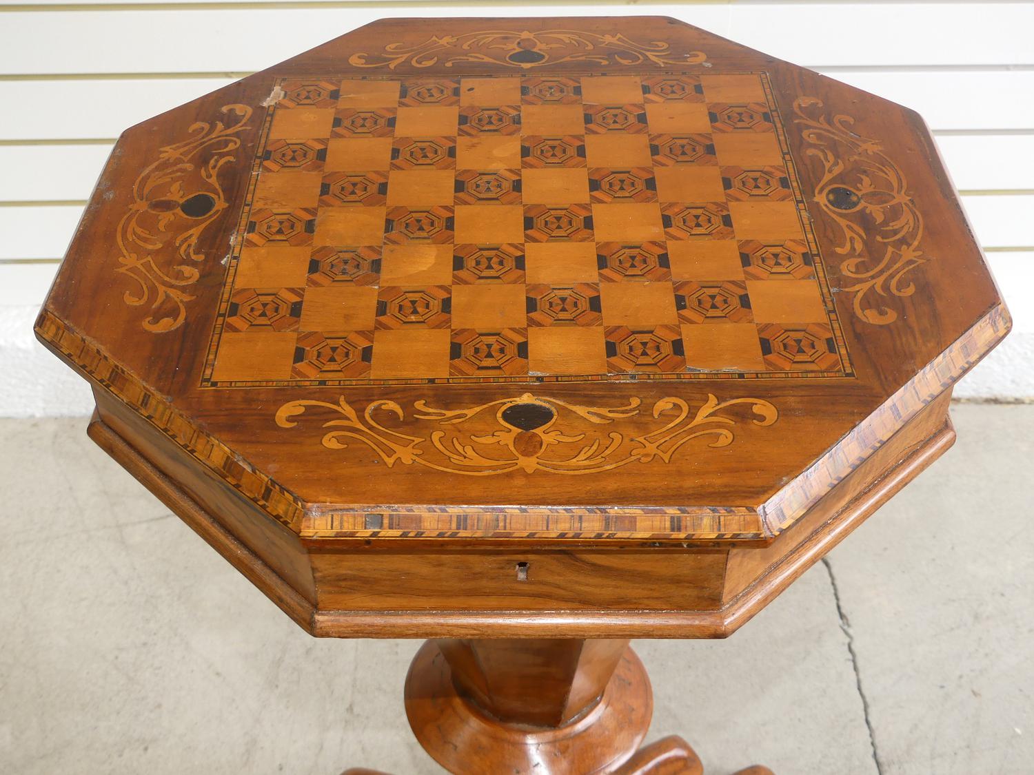 early victorian inlaid burl walnut pedestal sewing table, with games top, english c.1870, 28 1/4" x 19"