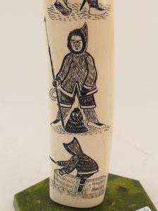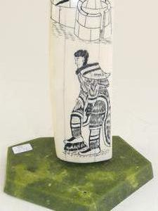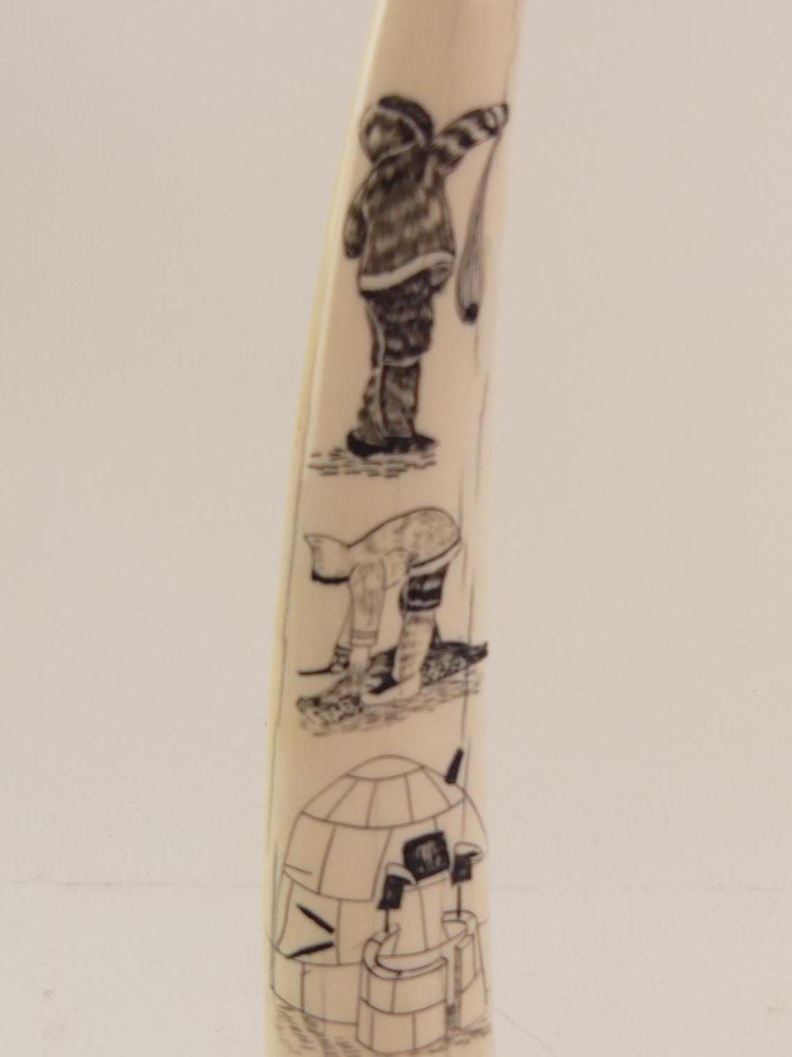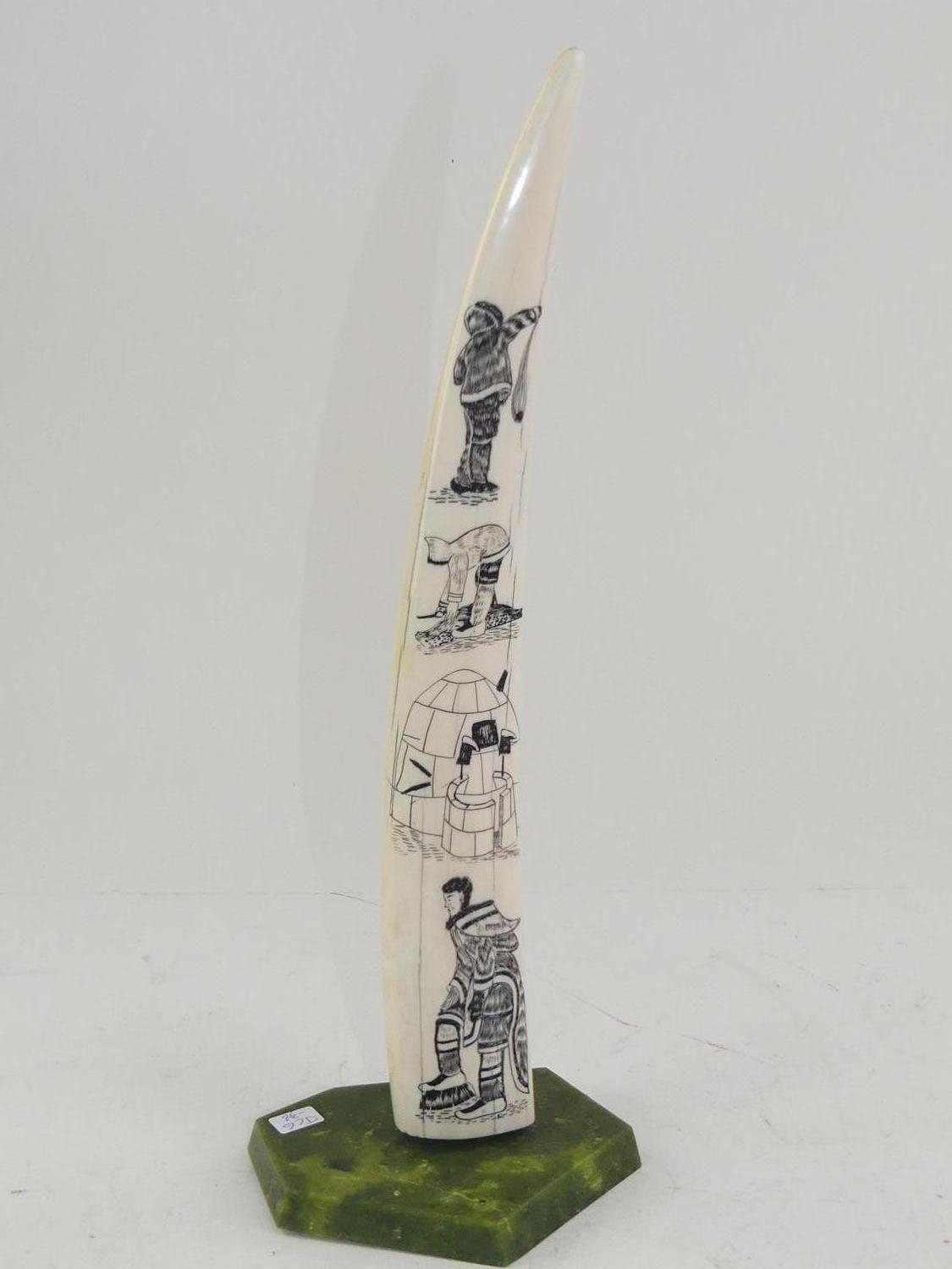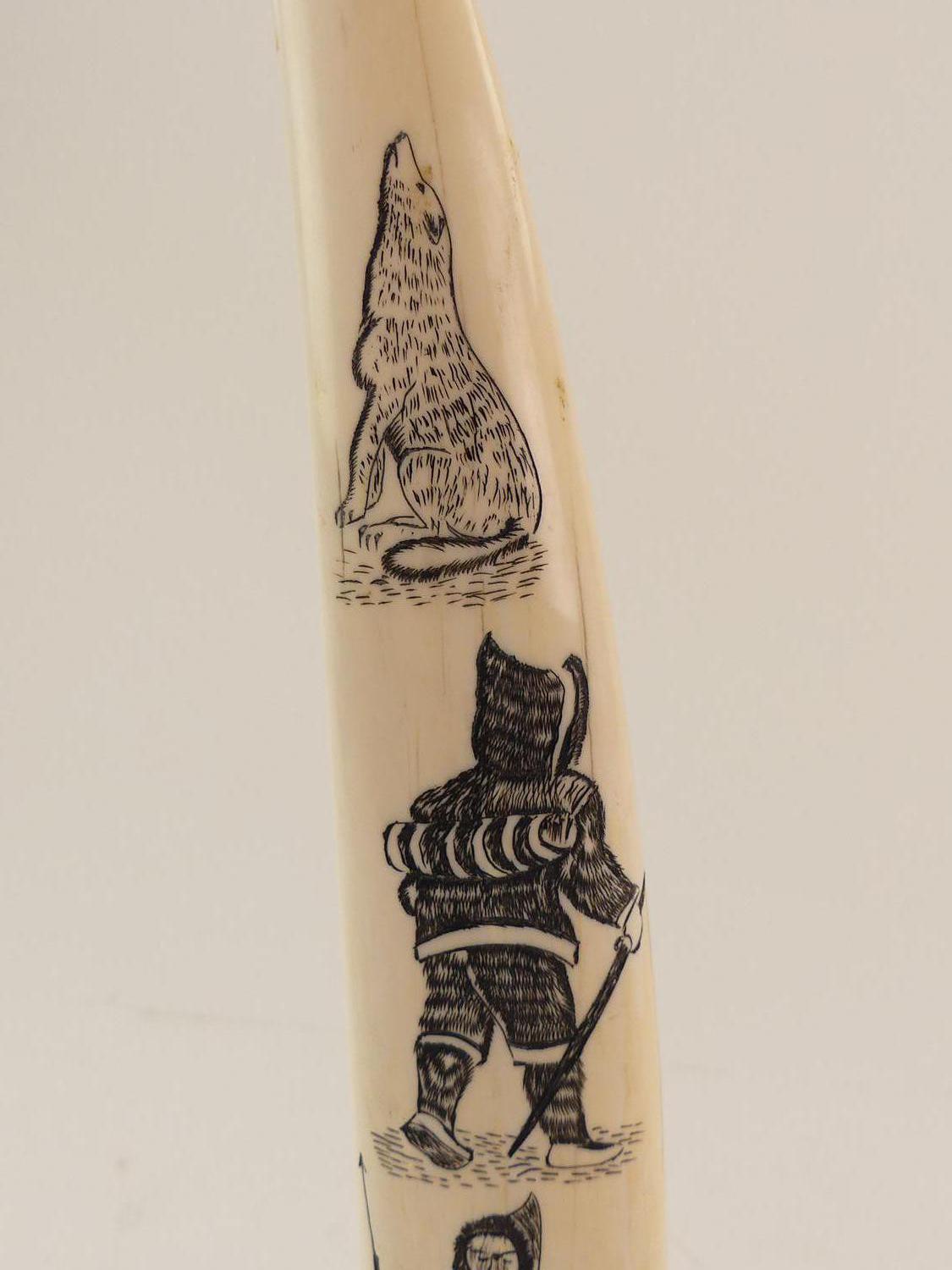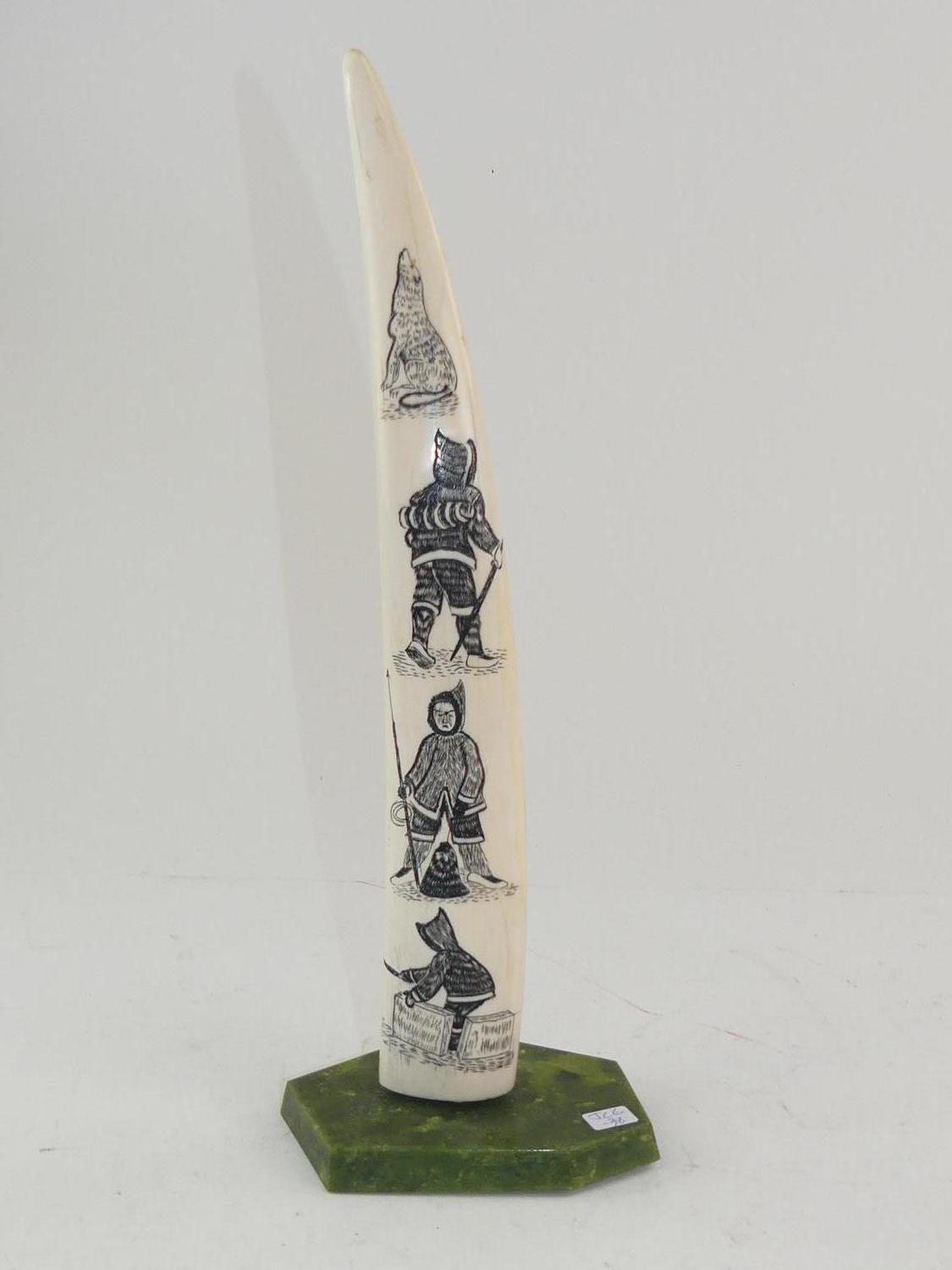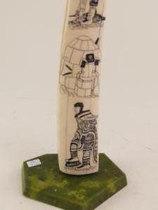inuit carved walrus tusk on stand, ht 16 1/2"