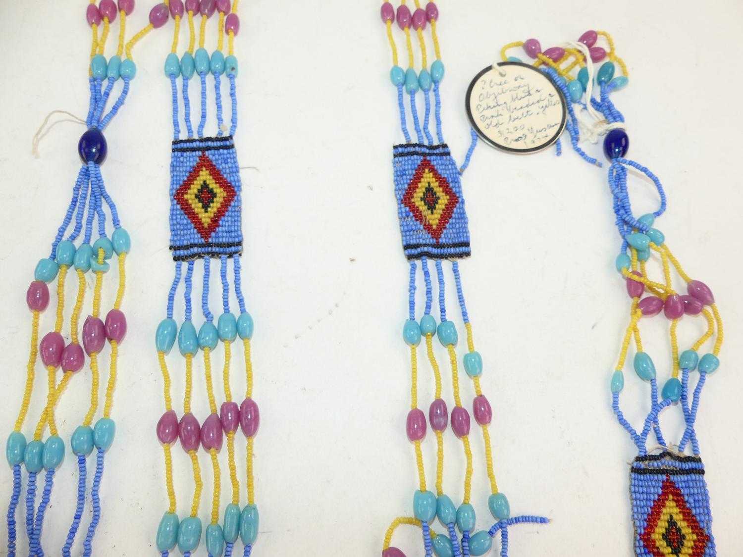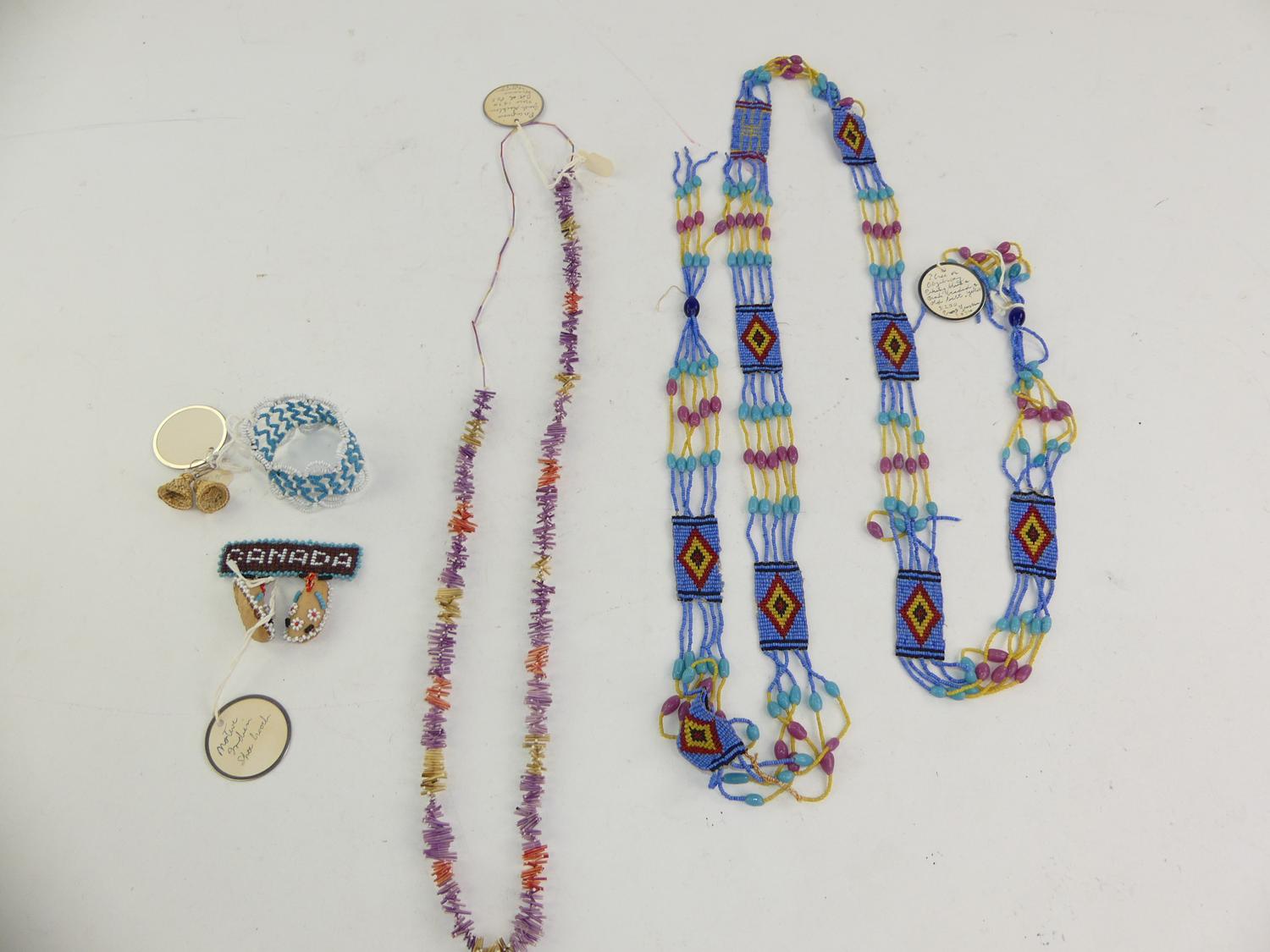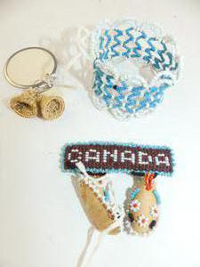 beaded belt, porcupine quill necklace, beaded napkin ring, woven cedar earrings, and a beaded canada moccasin pin