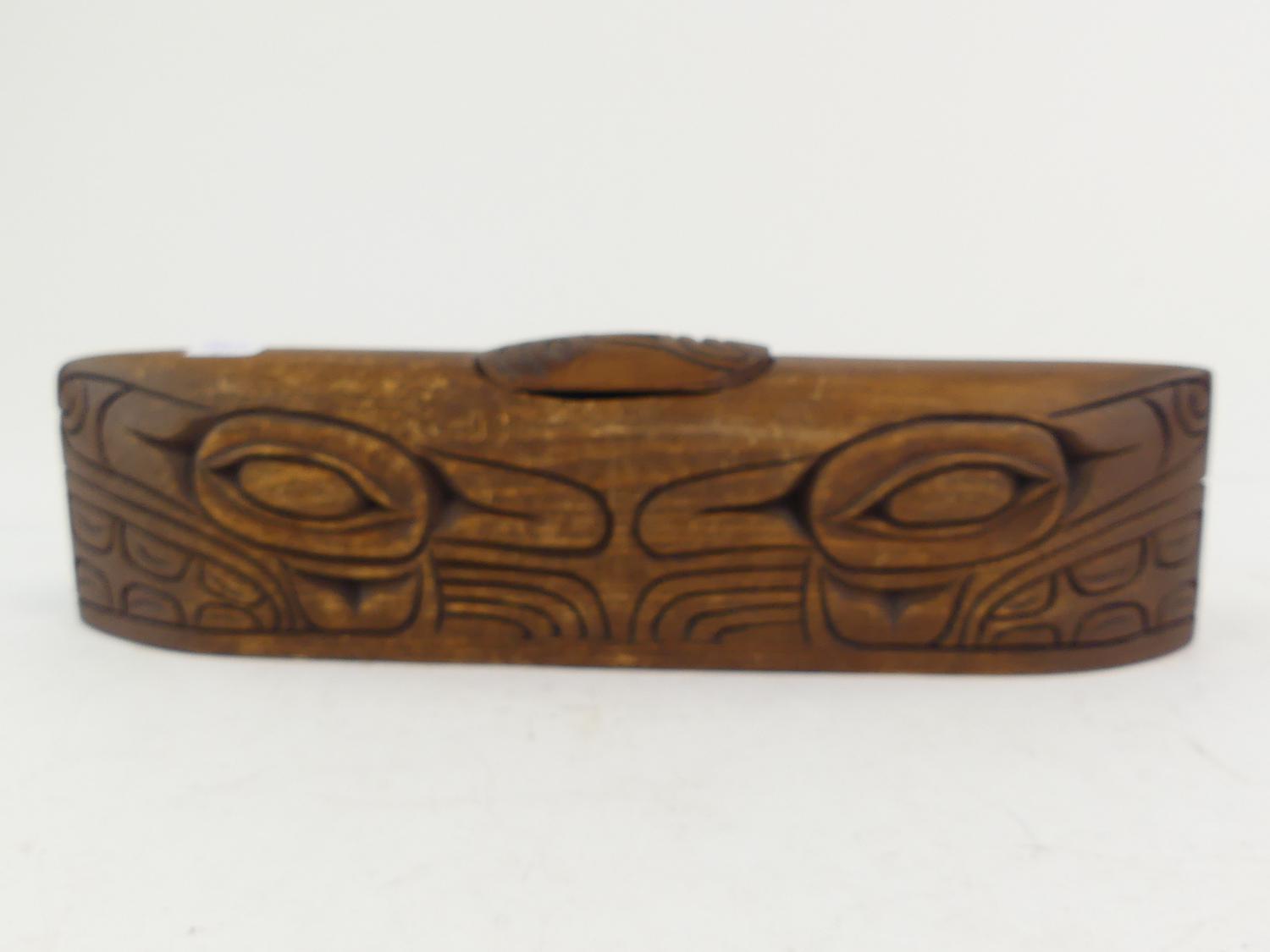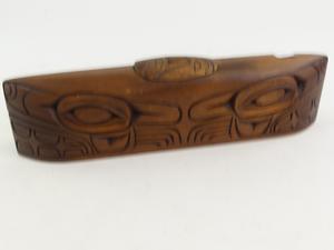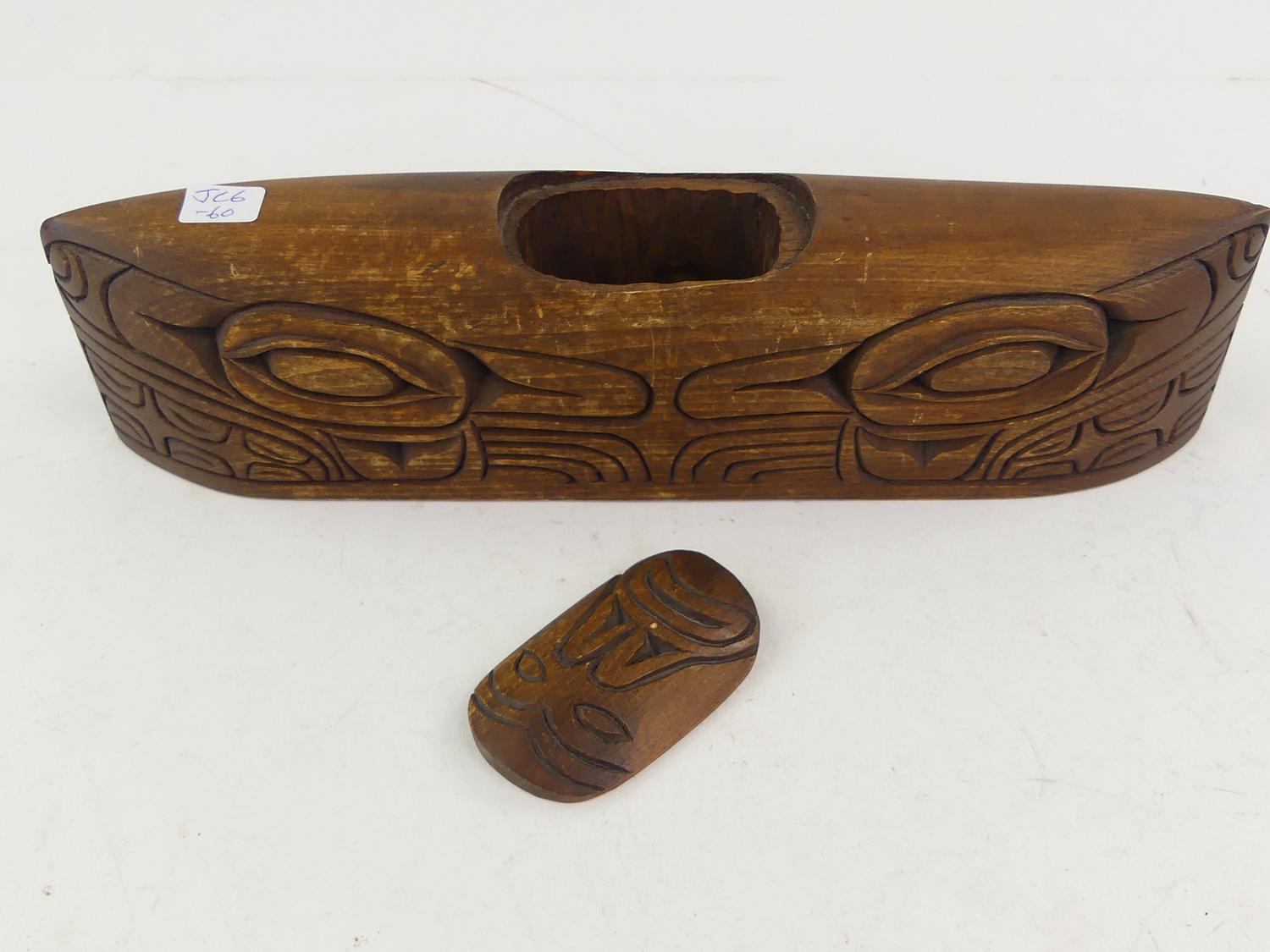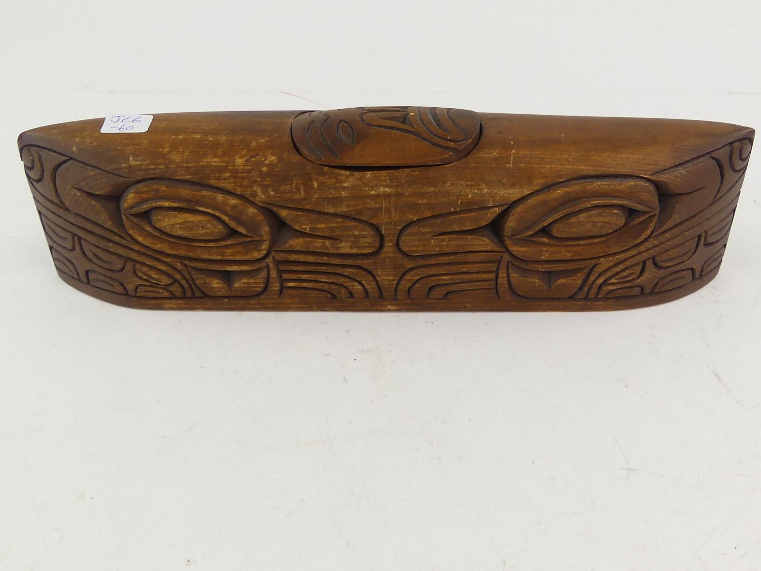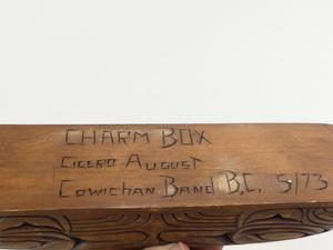 carved charm box, cicero august, cowichan band, may 1973, length 12"