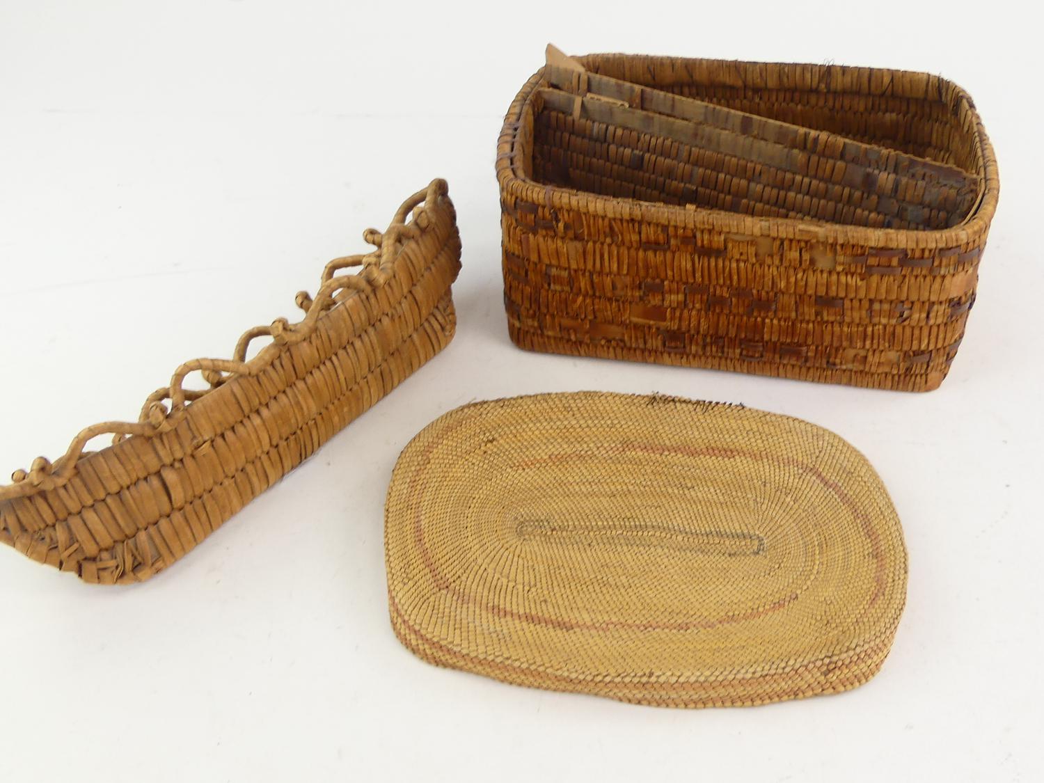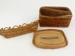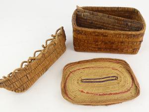 native woven cedar basket, canoe and lid, 11 1/2" and smaller