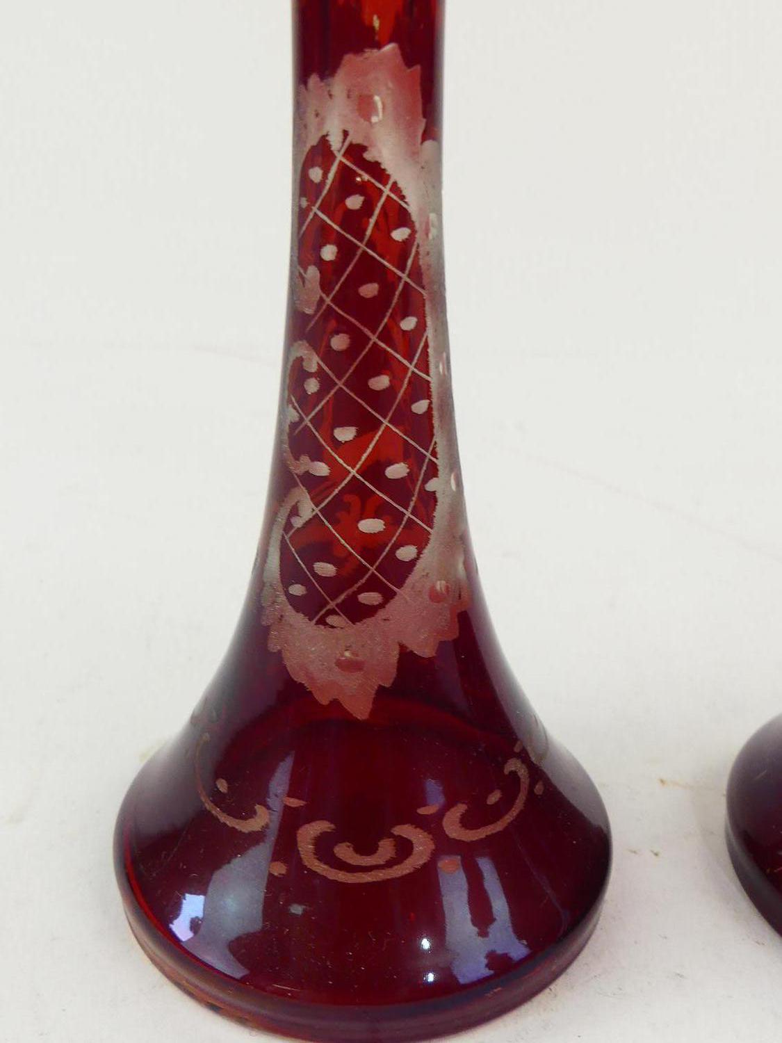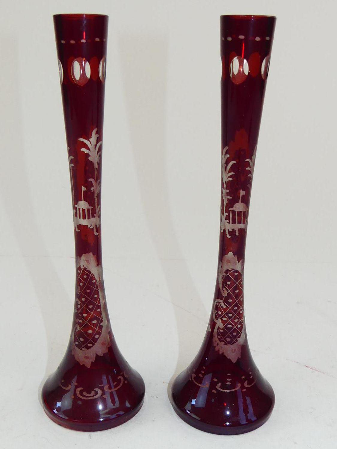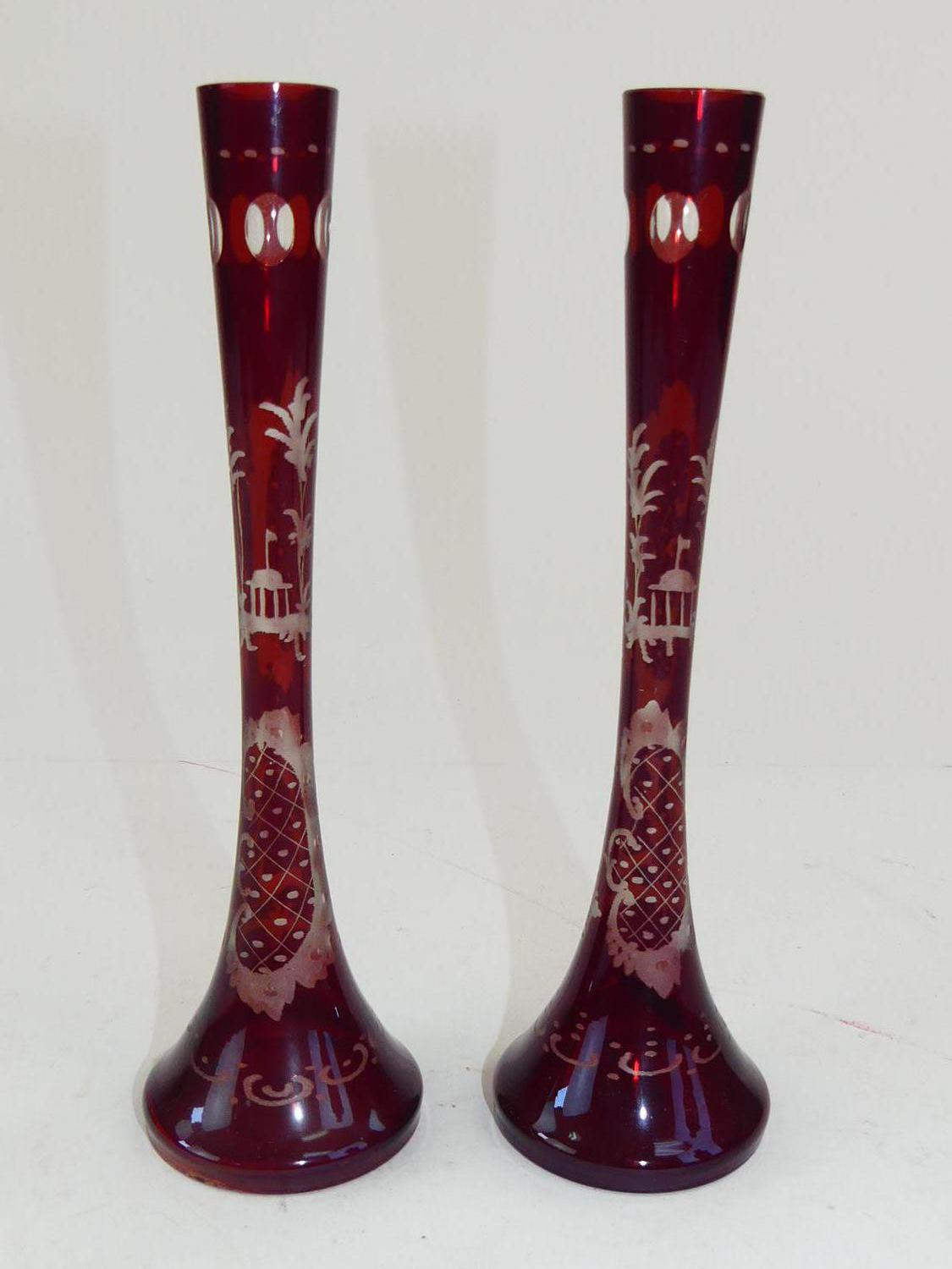 pair of bohemian etched ruby flash glass vases, ht 8 3/4"