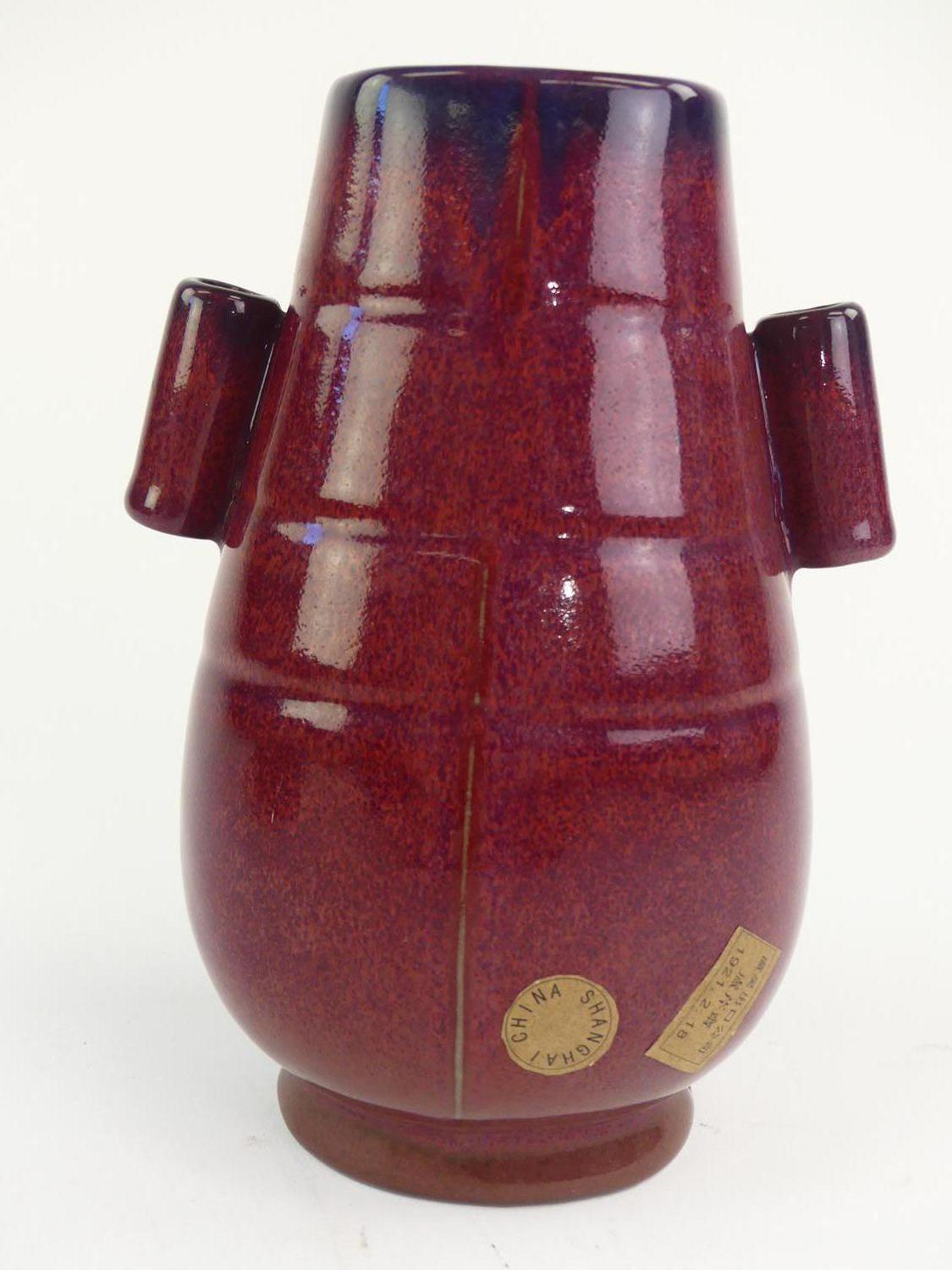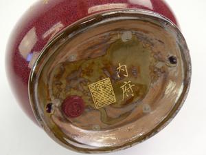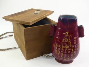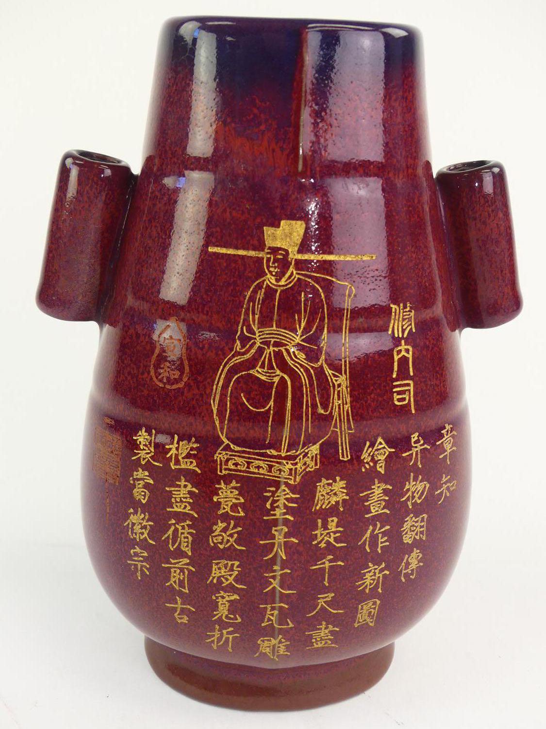 chinese red scholar vase with script decoration, 19th century, cased, ht. 9"