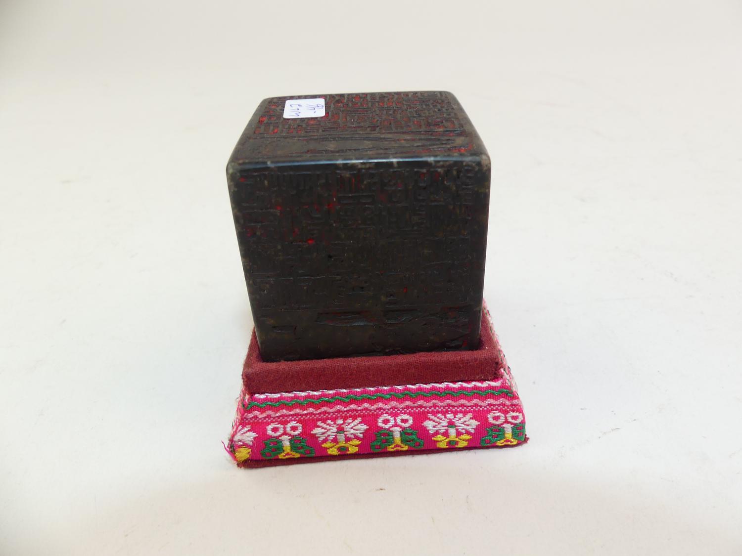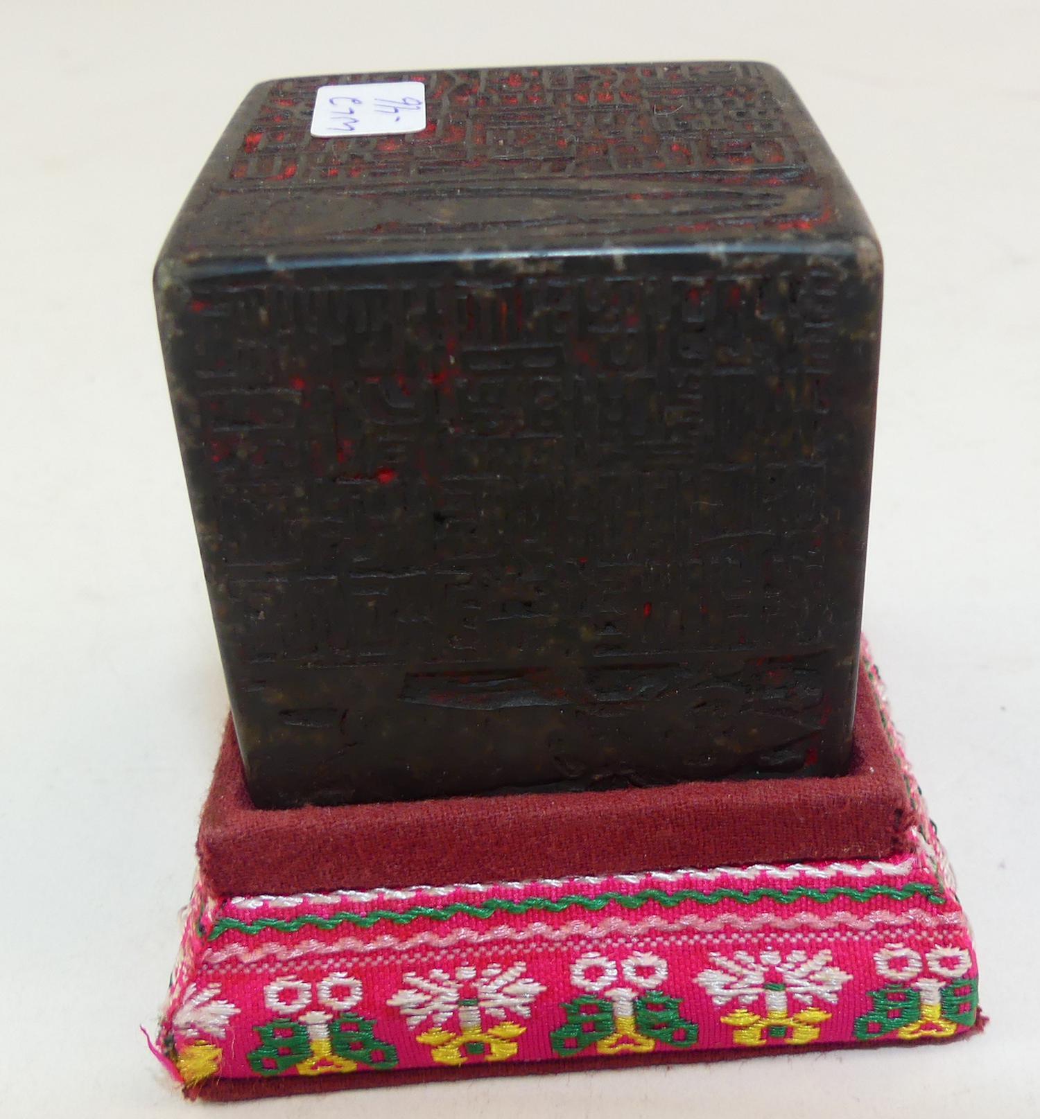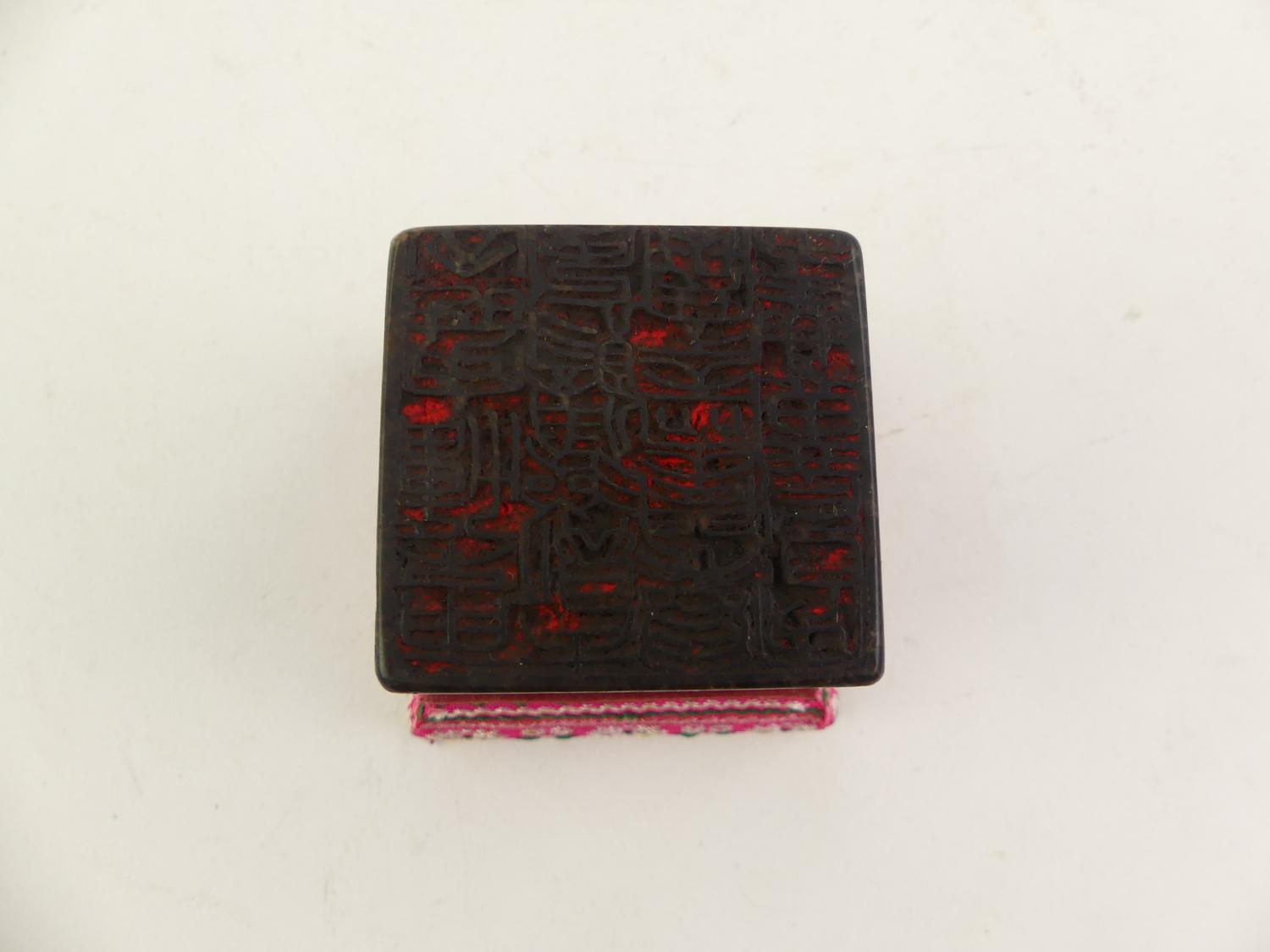 chinese rectangular twan stone inkwell in case, late 19th century, 2" x 2" plus stand