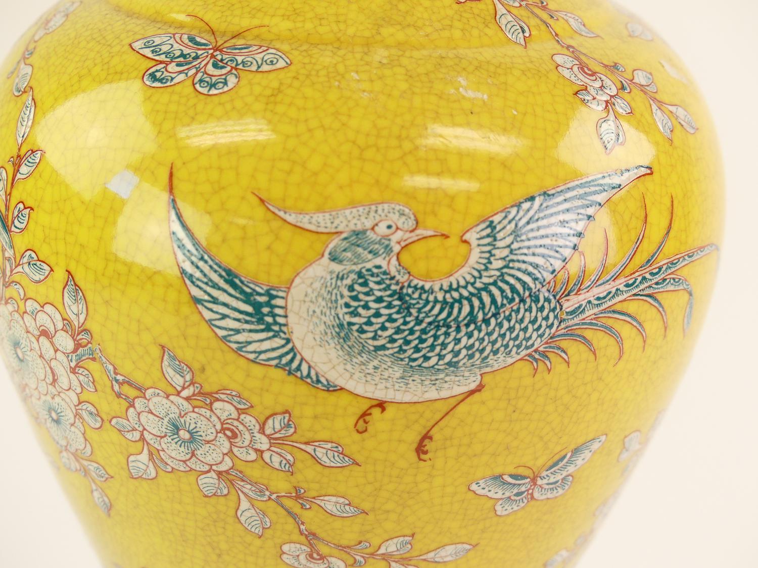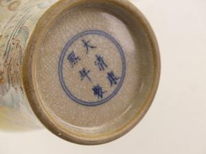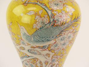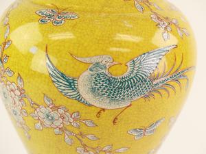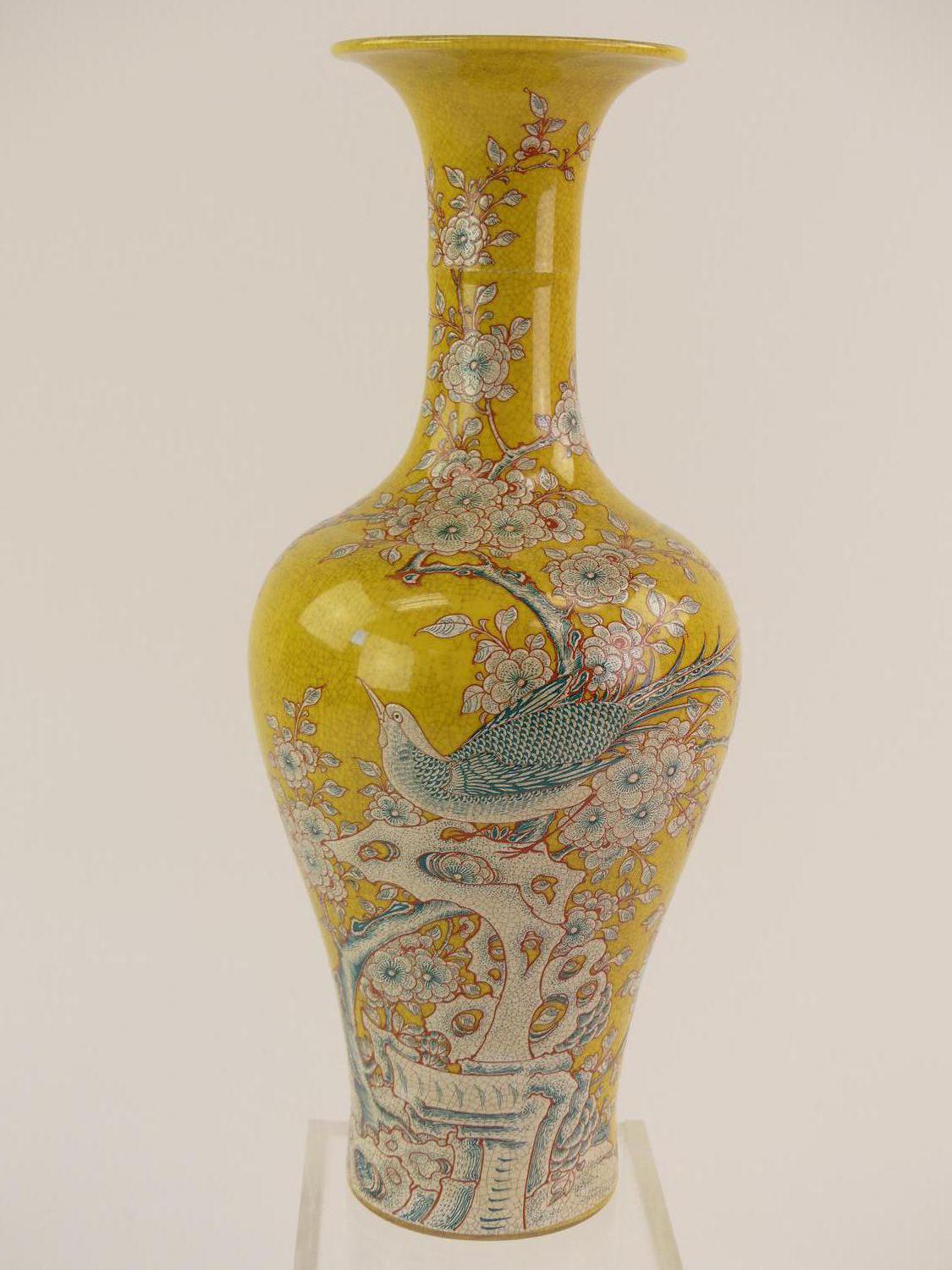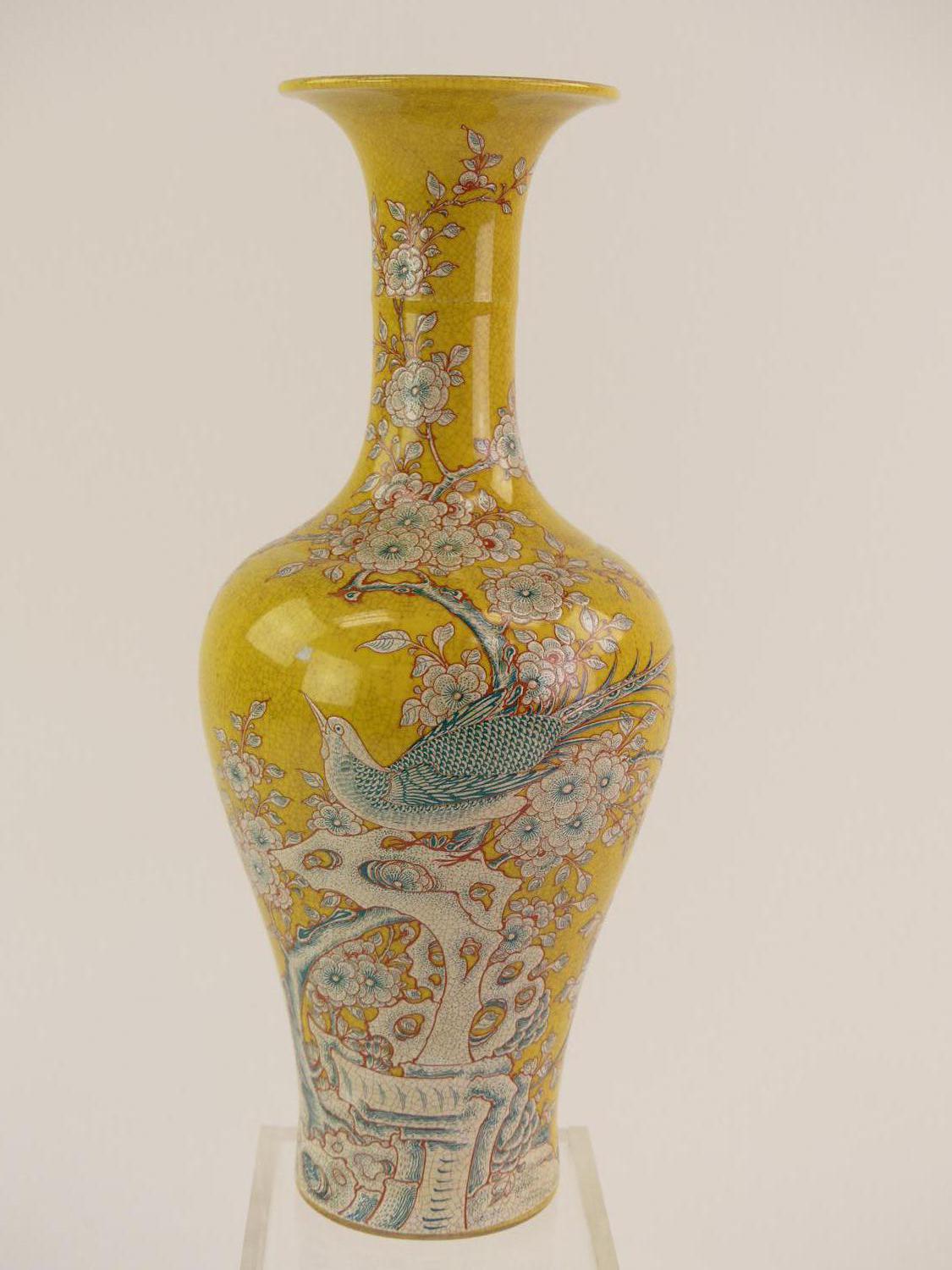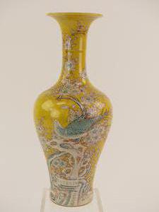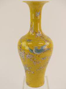chinese yellow ground color enamelled scholar vase, k'ang-hsi mark, ht 12"