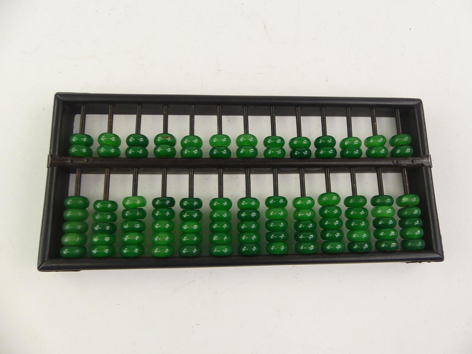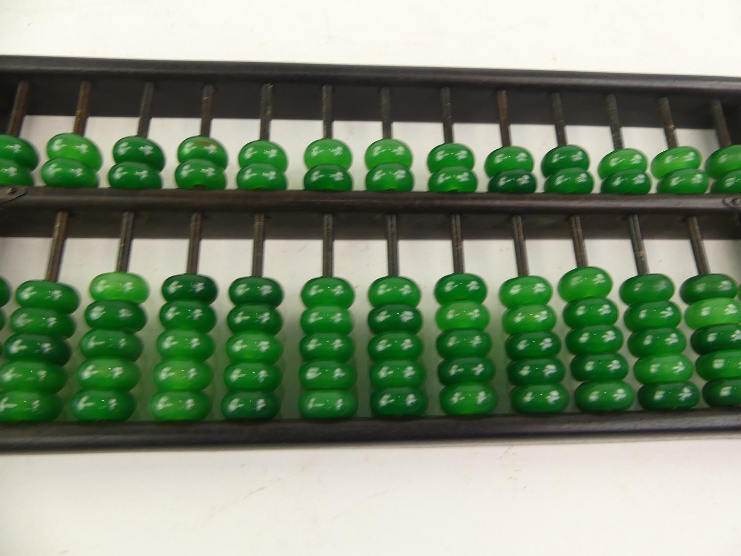 chinese spinach green(dyed) jadeite bead abacus, 19th century, 12" x 5 1/2"