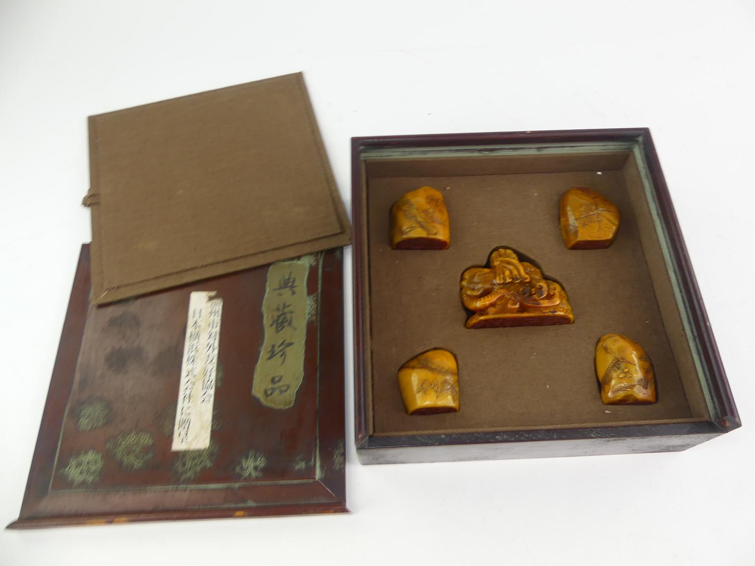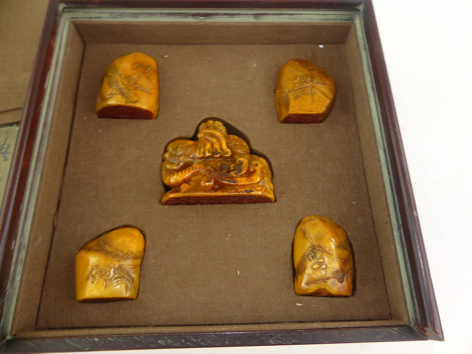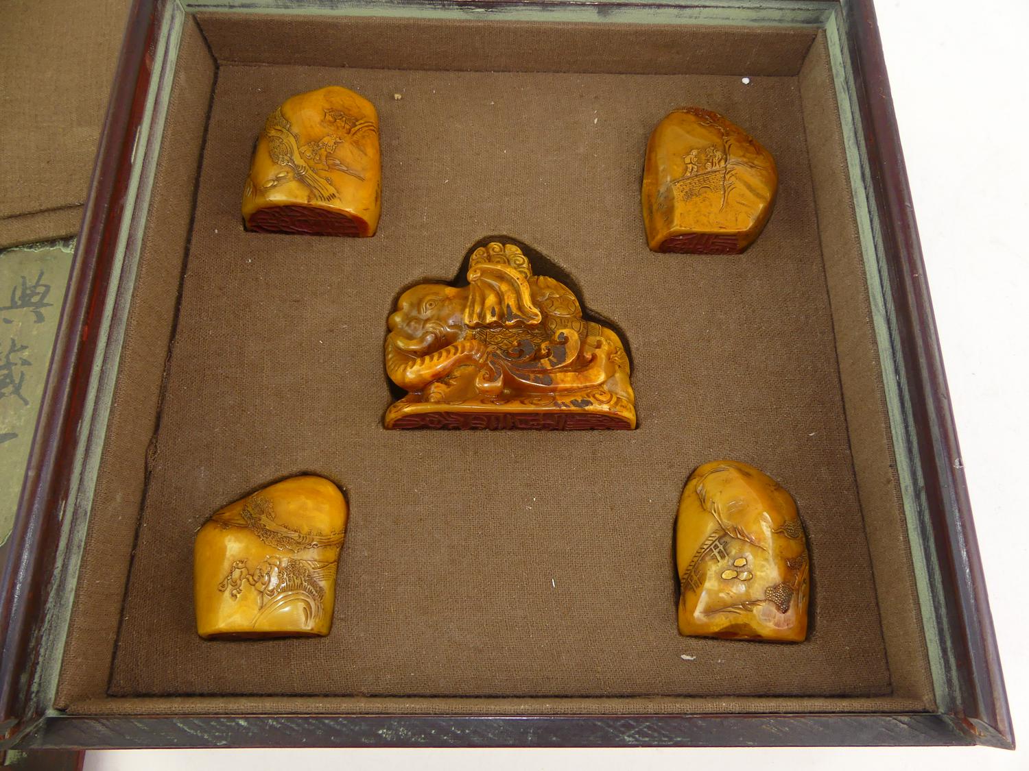 cased set of chinese carved soap stone seals, 19th century, 11" x 11"