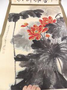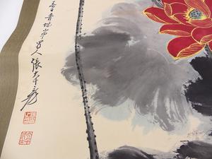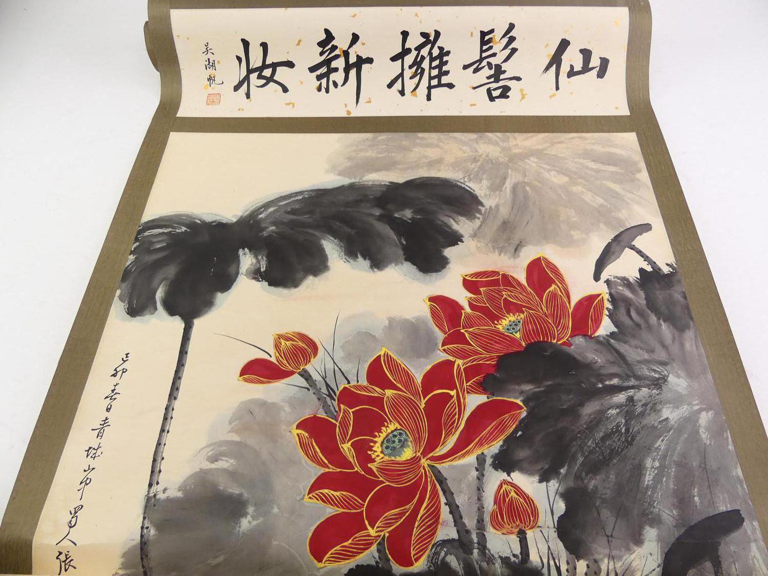 chiense ink color on paper painting of lotus and calligraphy, early 20th century, 90" x 33"