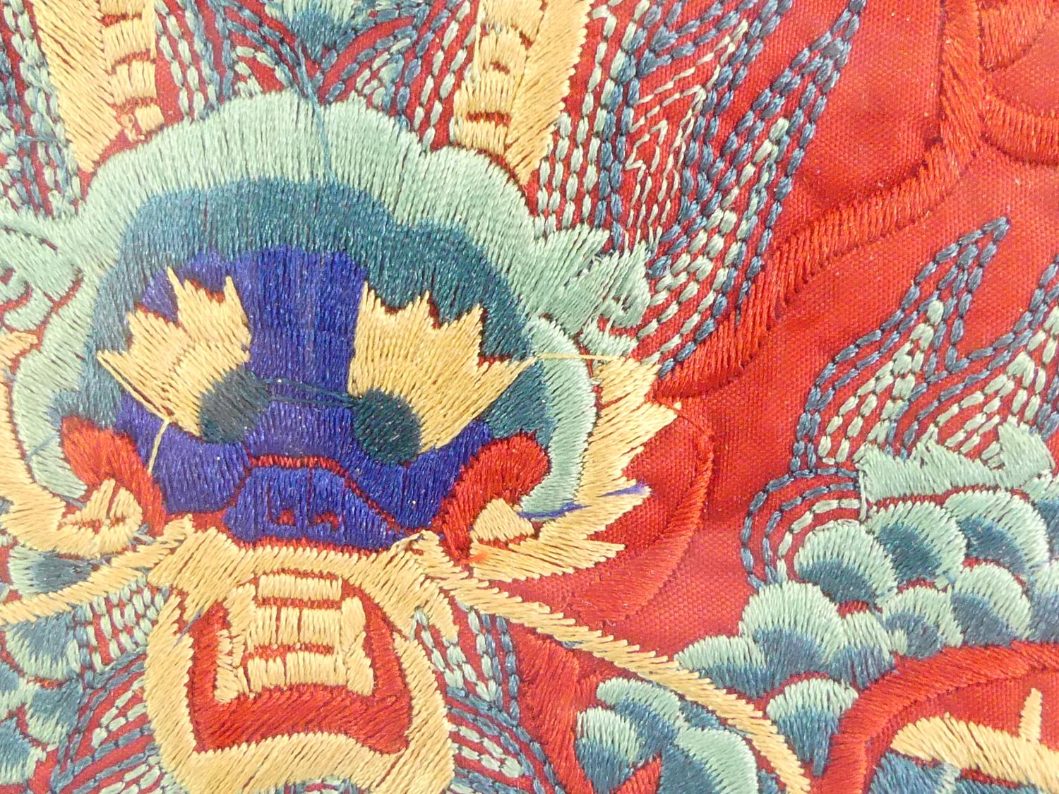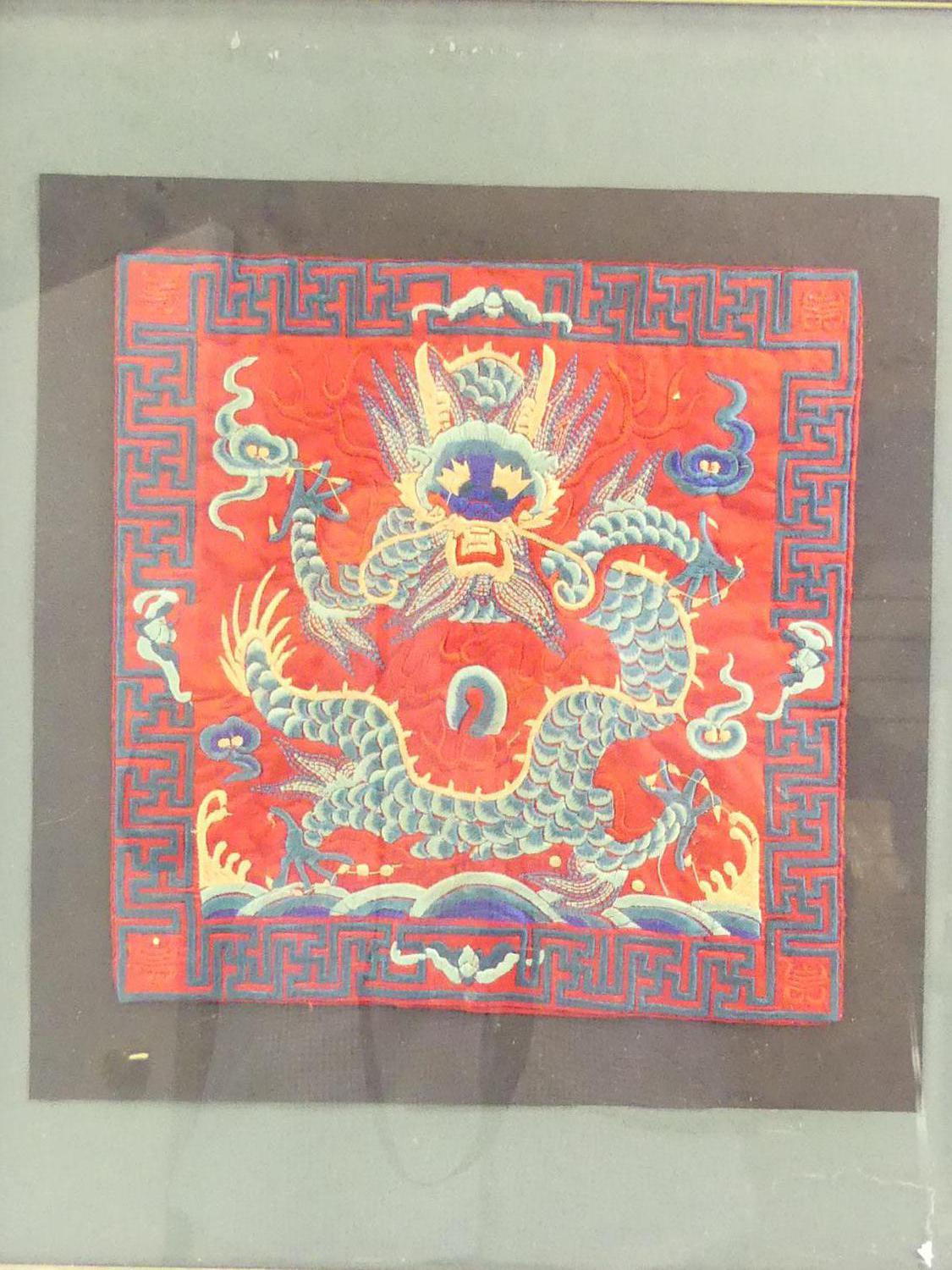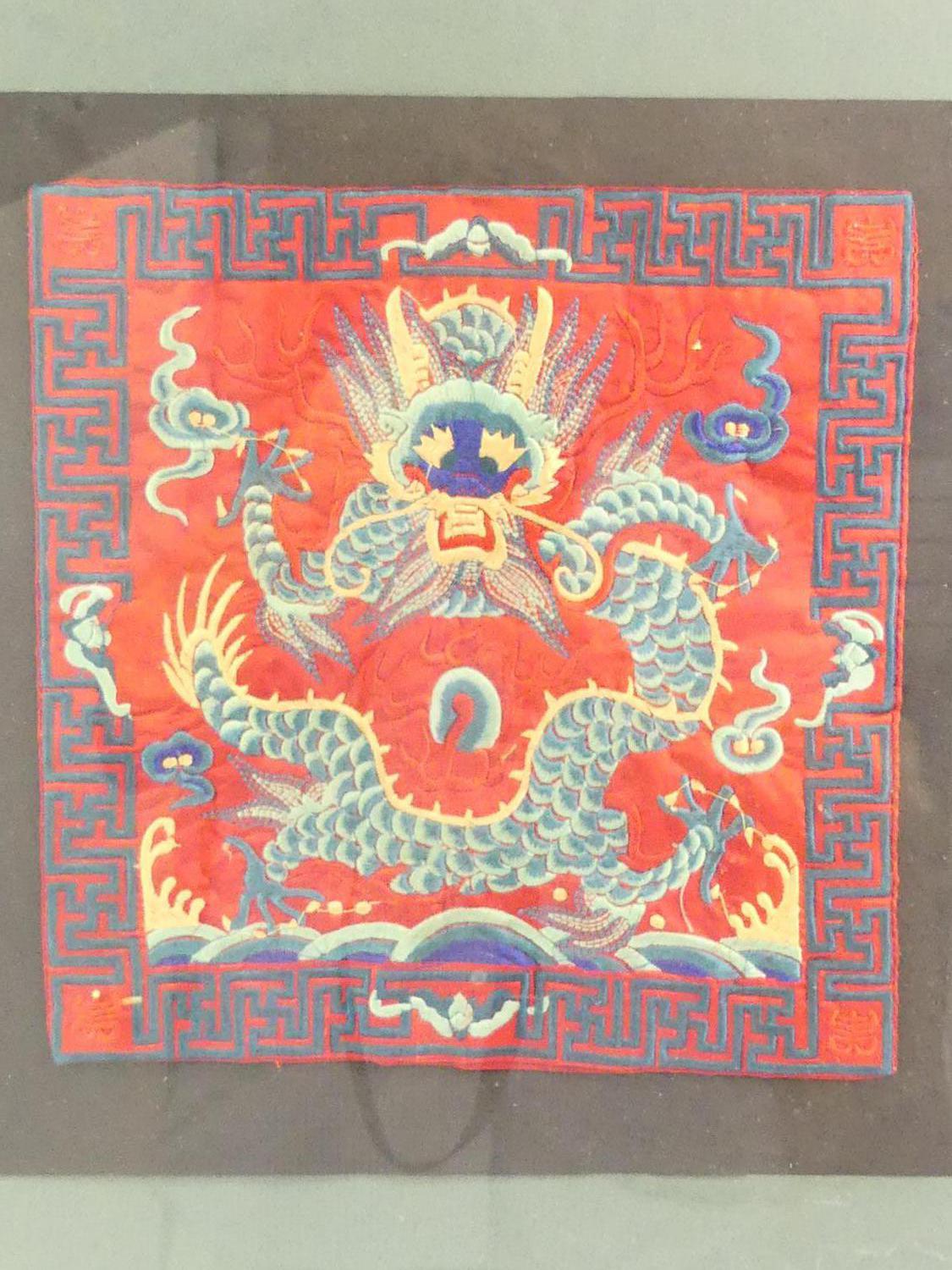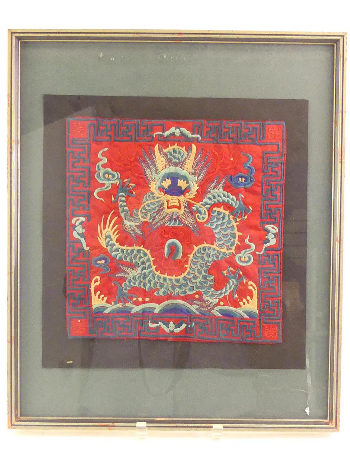 chinese imperial dragon embroidery in frame, early 20th century, overall 18 1/2" x 15 1/2"