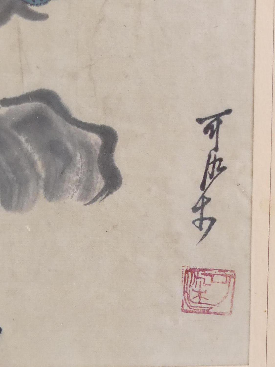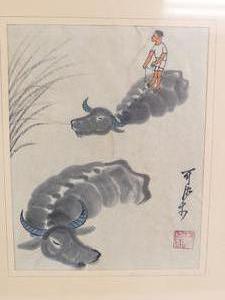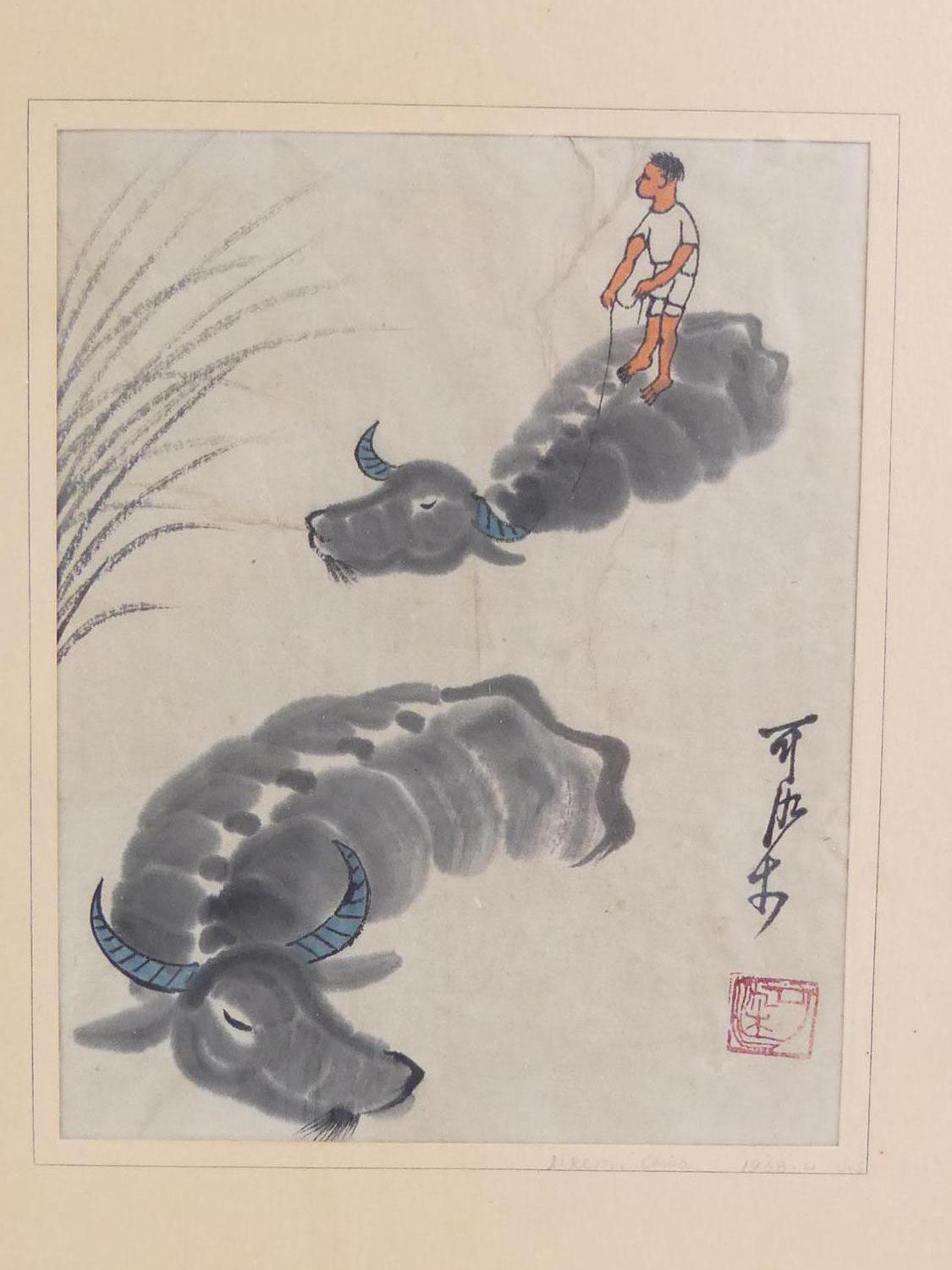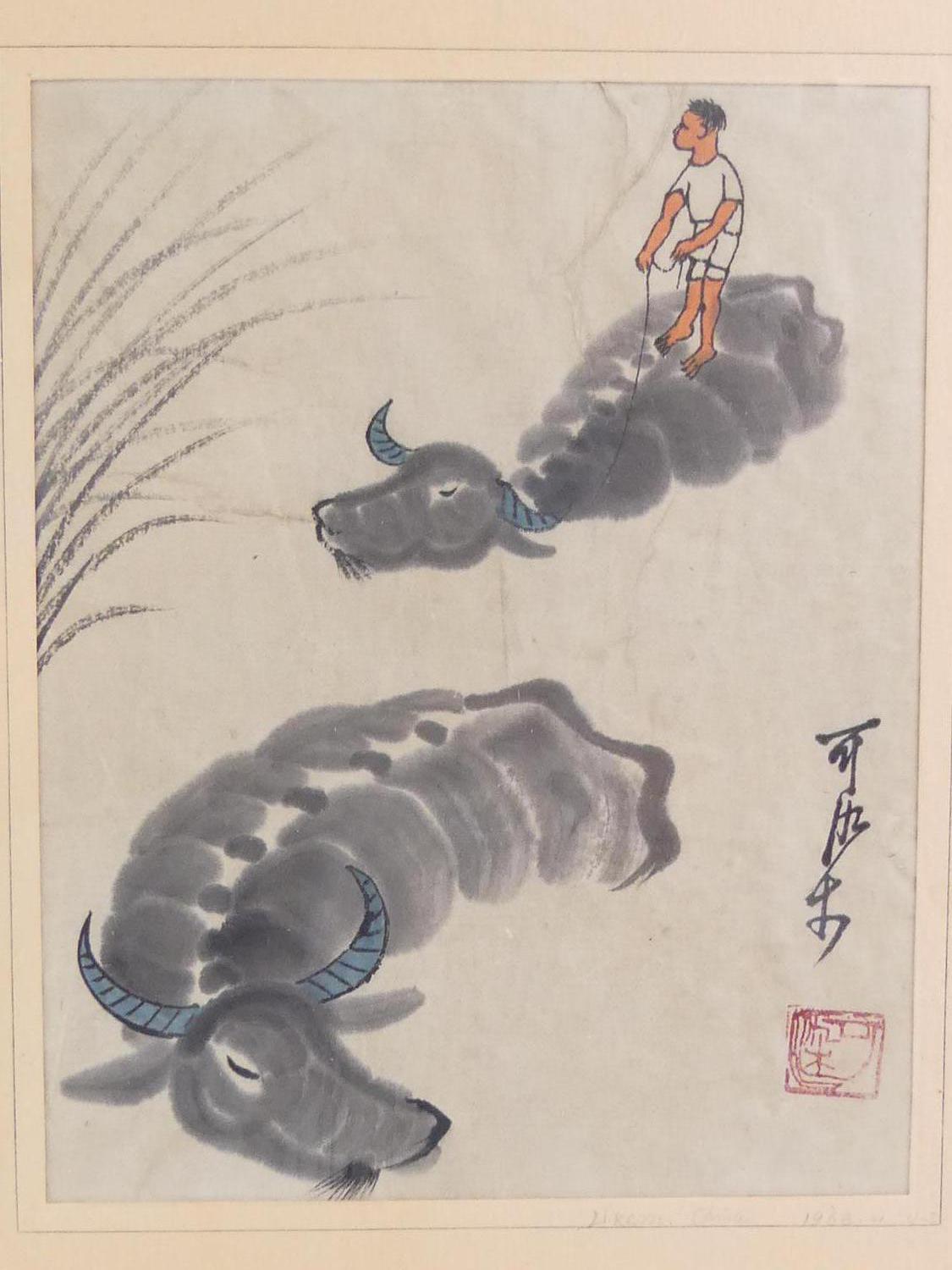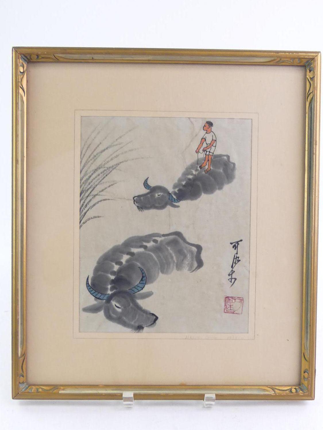 chinese ink and color on paper painting of buffalo, overall 15 1/2" x 13 1/4"