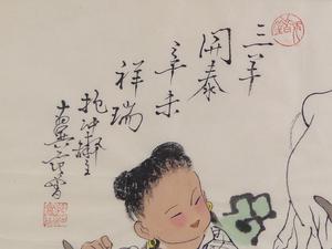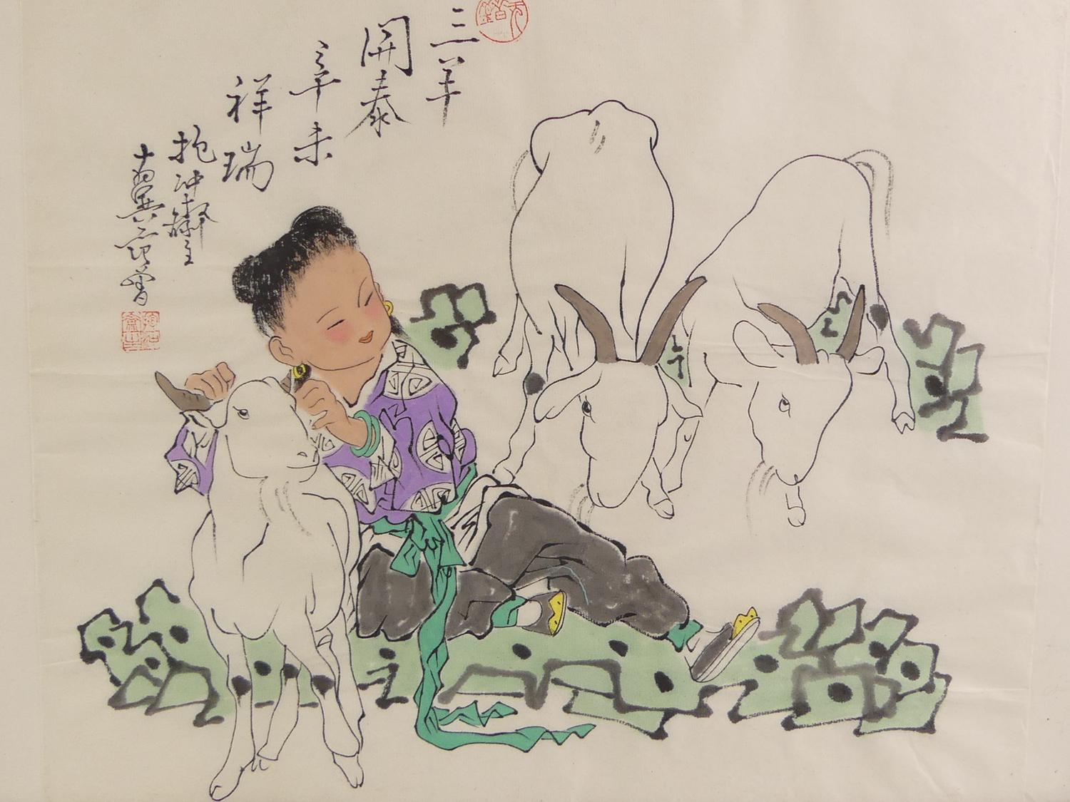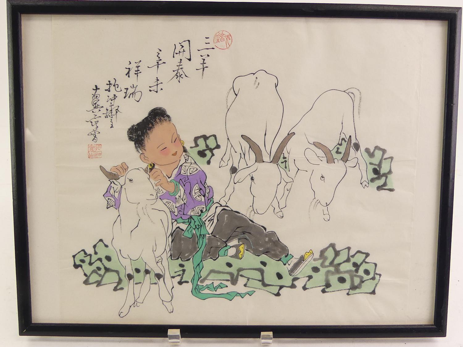 chinese ink and color paper painting of goat, early 20th , overall 13" x 17"