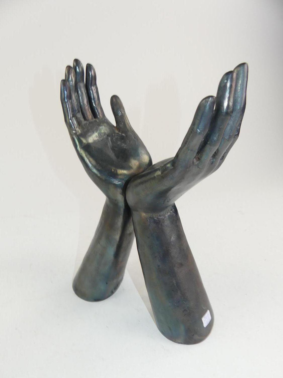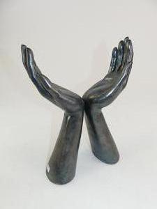 steel sculpture of hands, signed s. o. c. d. 1988, 12 1/2" x 9"