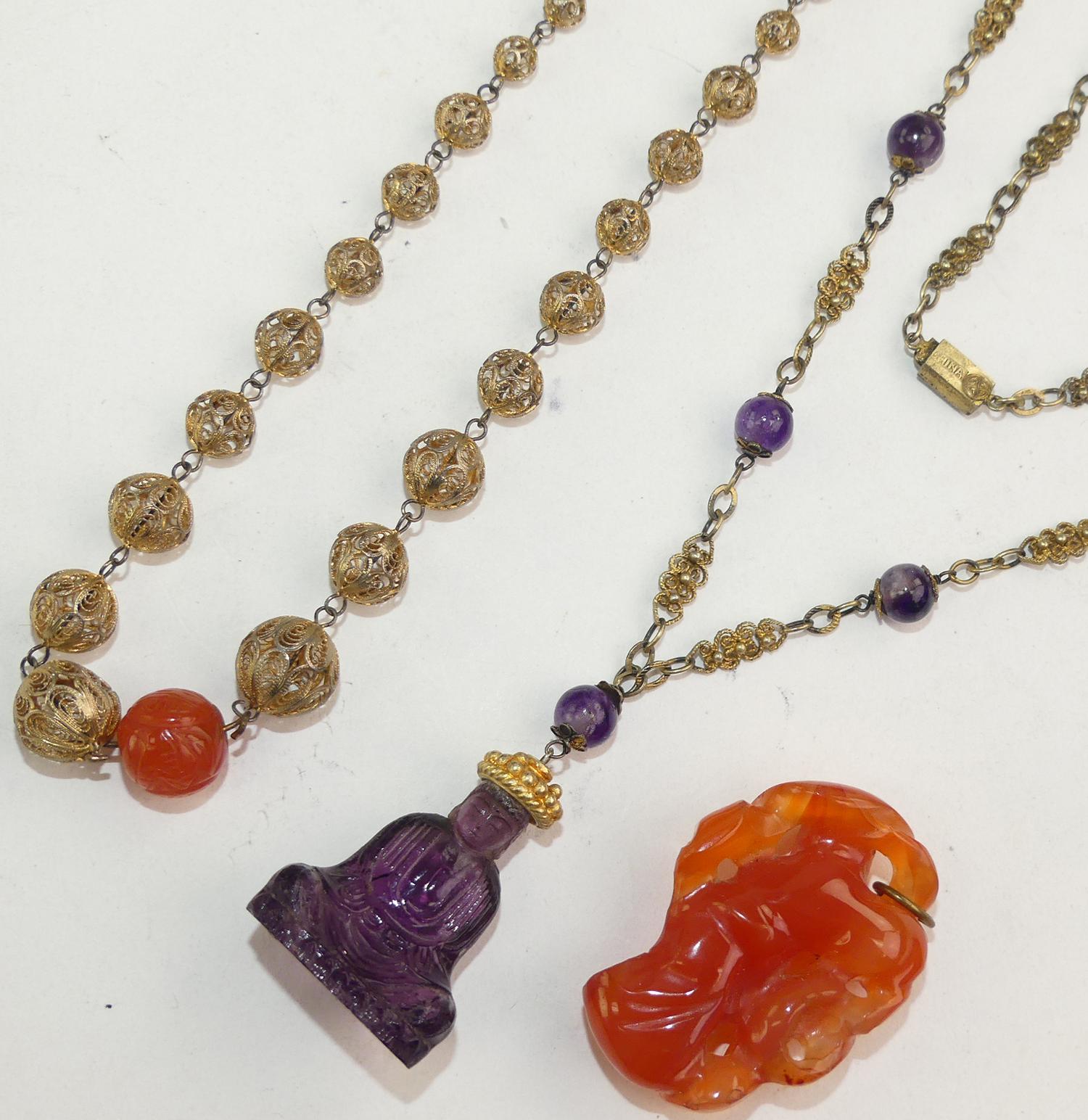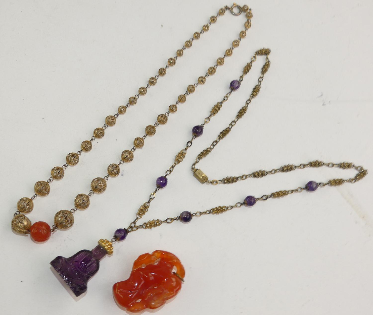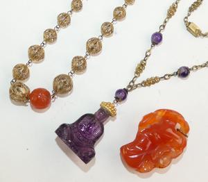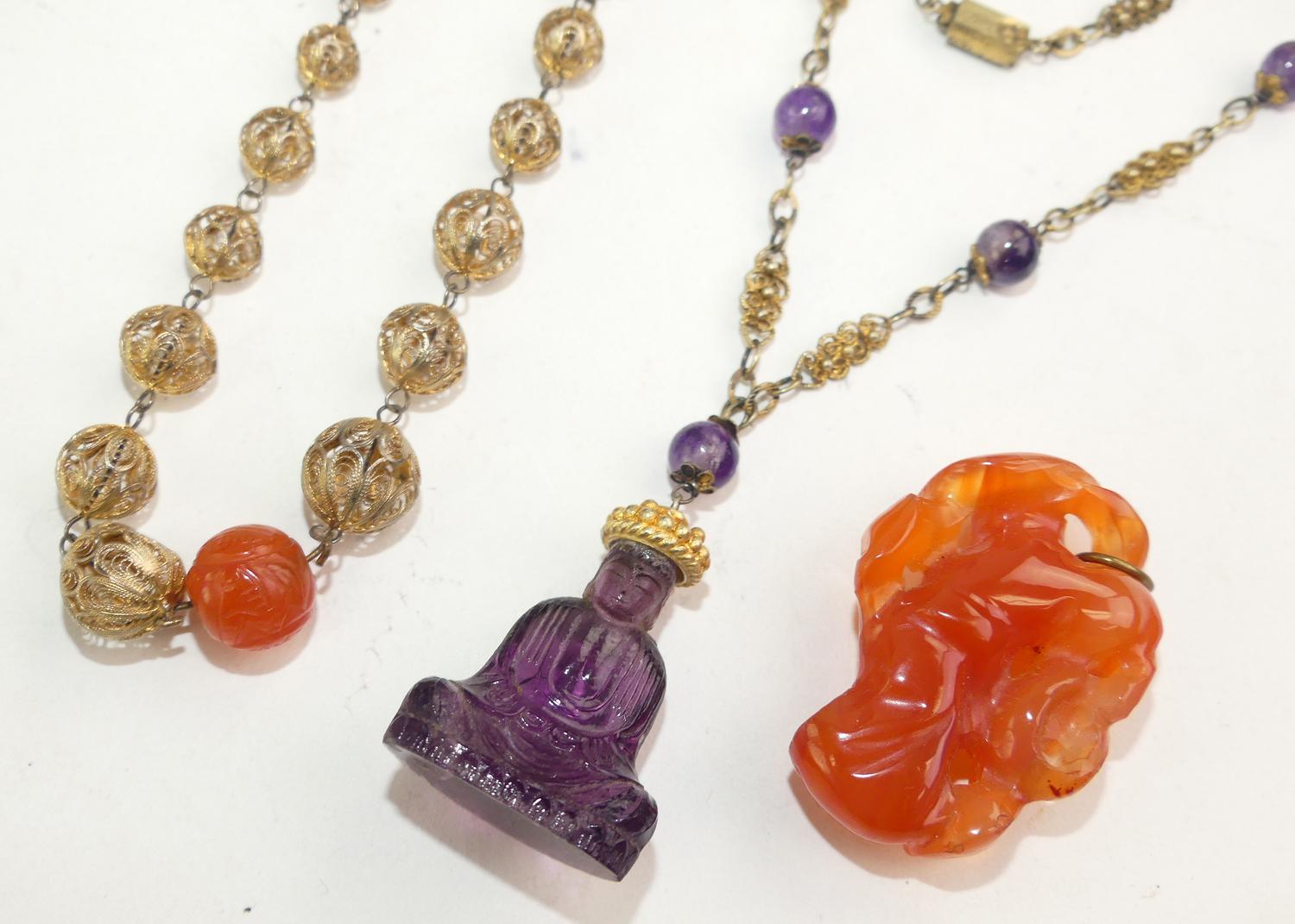 two asian necklaces, one with carved carnelian