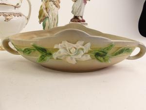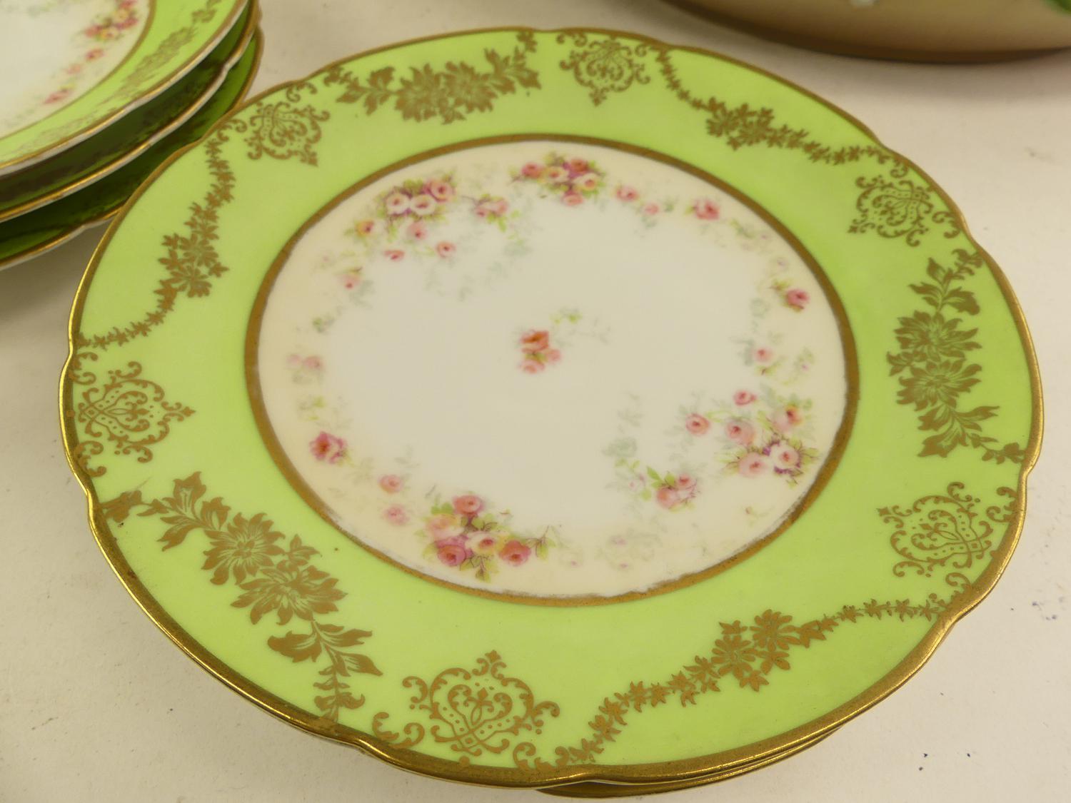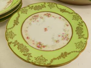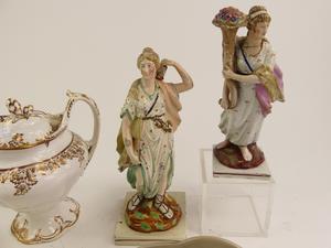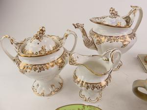 two 19th century staffordshire figurines, 3pc rockingham tea set, set of dessert plates