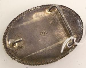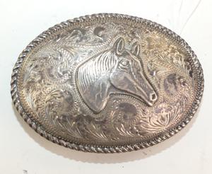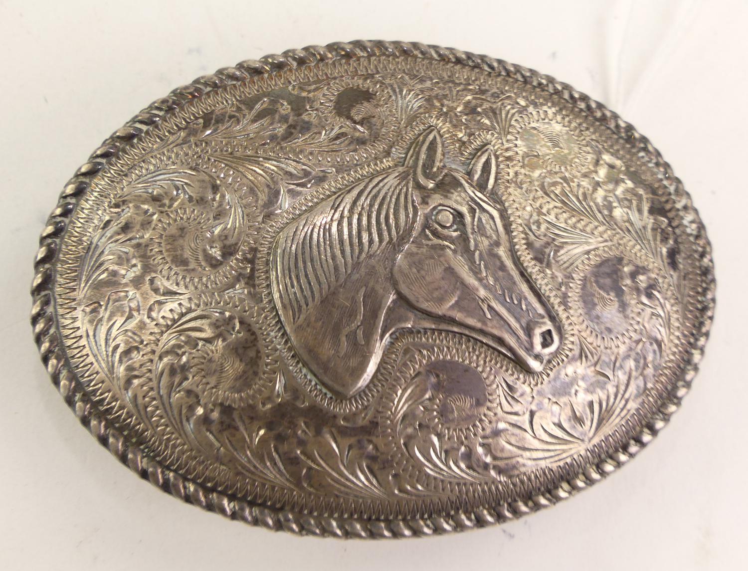 vintage mexican sterling silver horse motif belt buckle, signed, w/a 52grams, 3" across