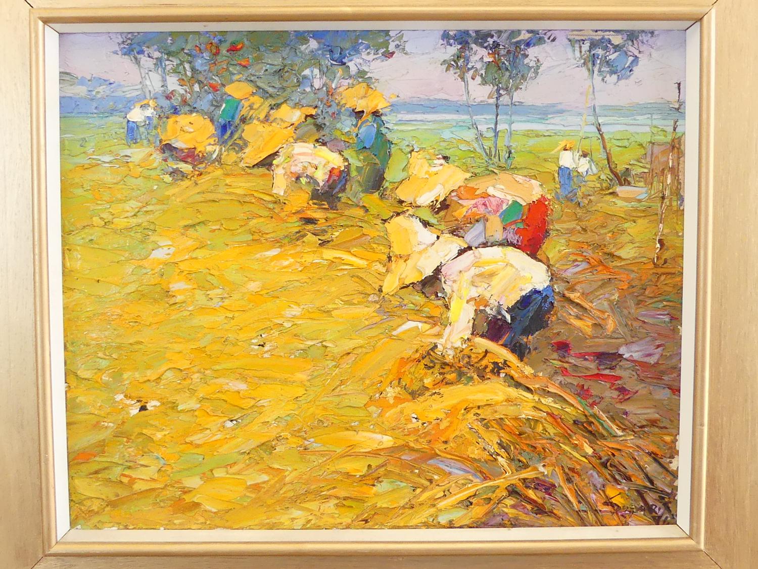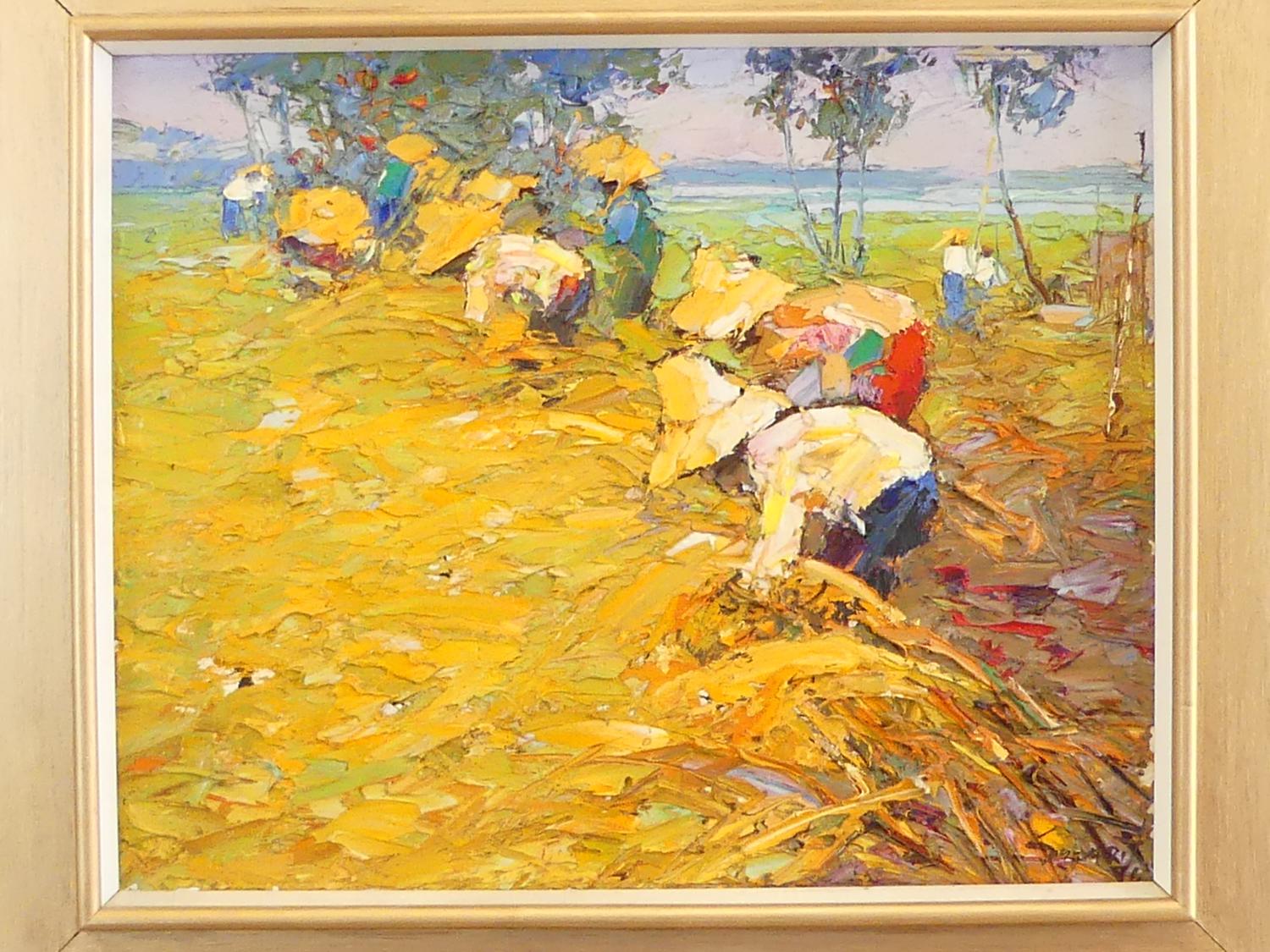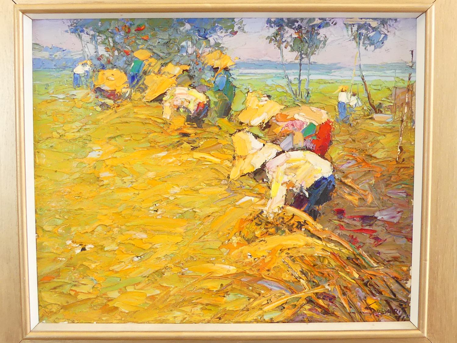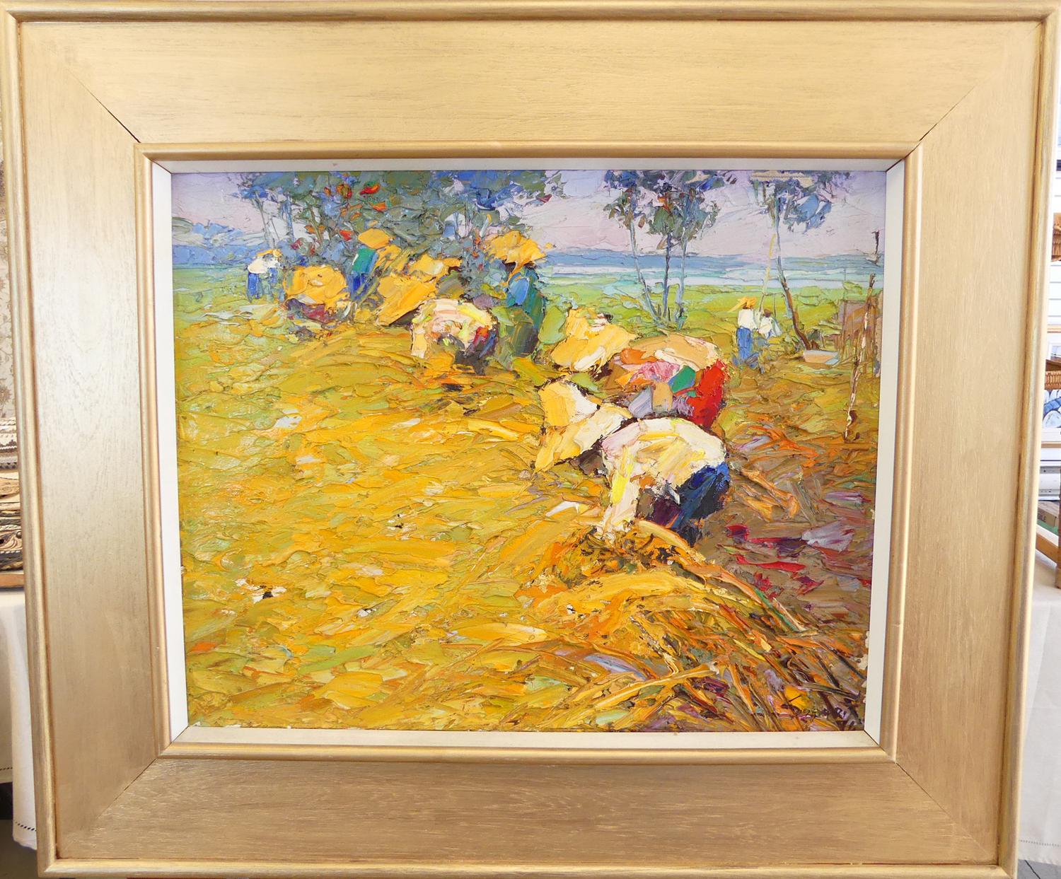 sujarit hirankul (1946-1982), oil on canvas, d.1971, 16" x 20", figures in field"