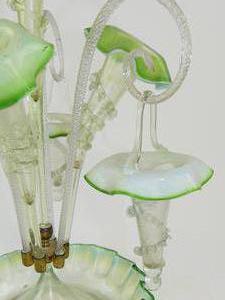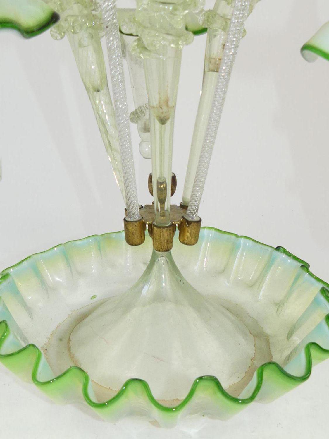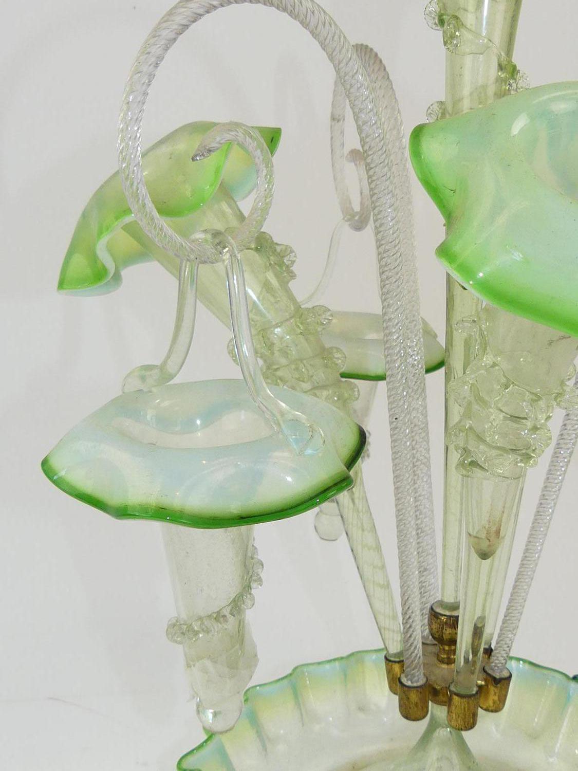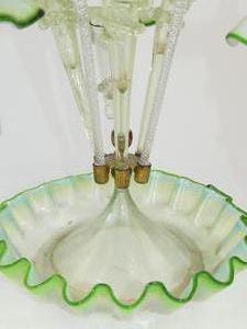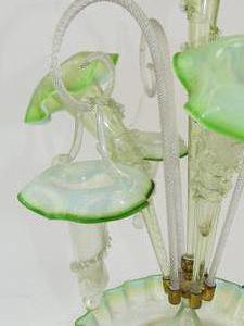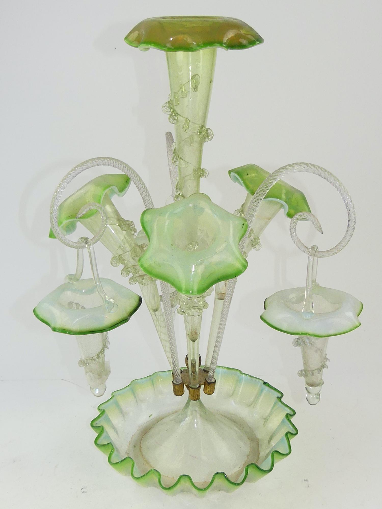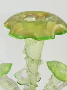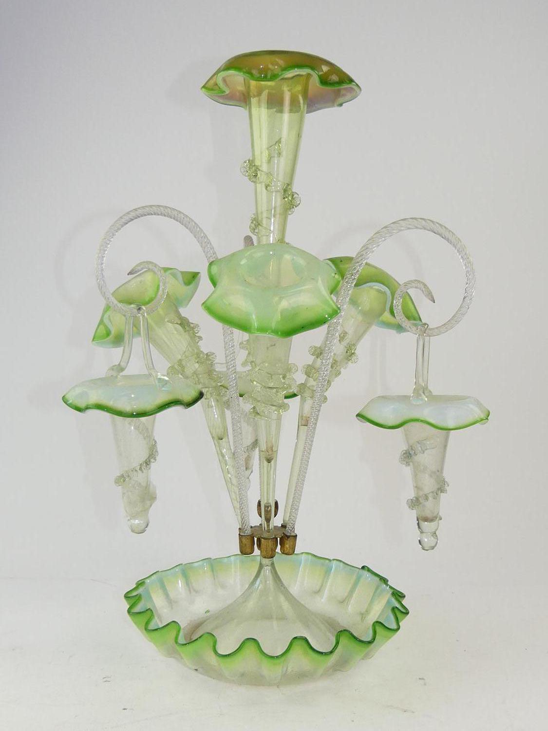 art nouveau green glass epergne, ht. 20 1/2" (repair to one basket)