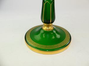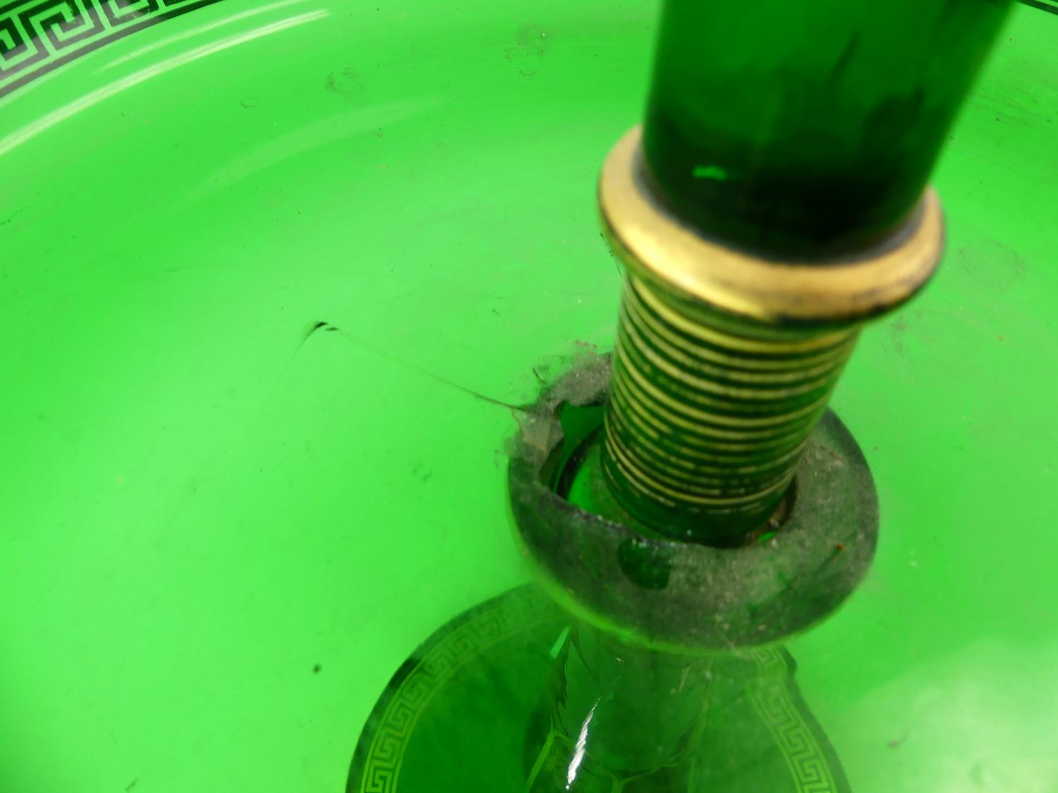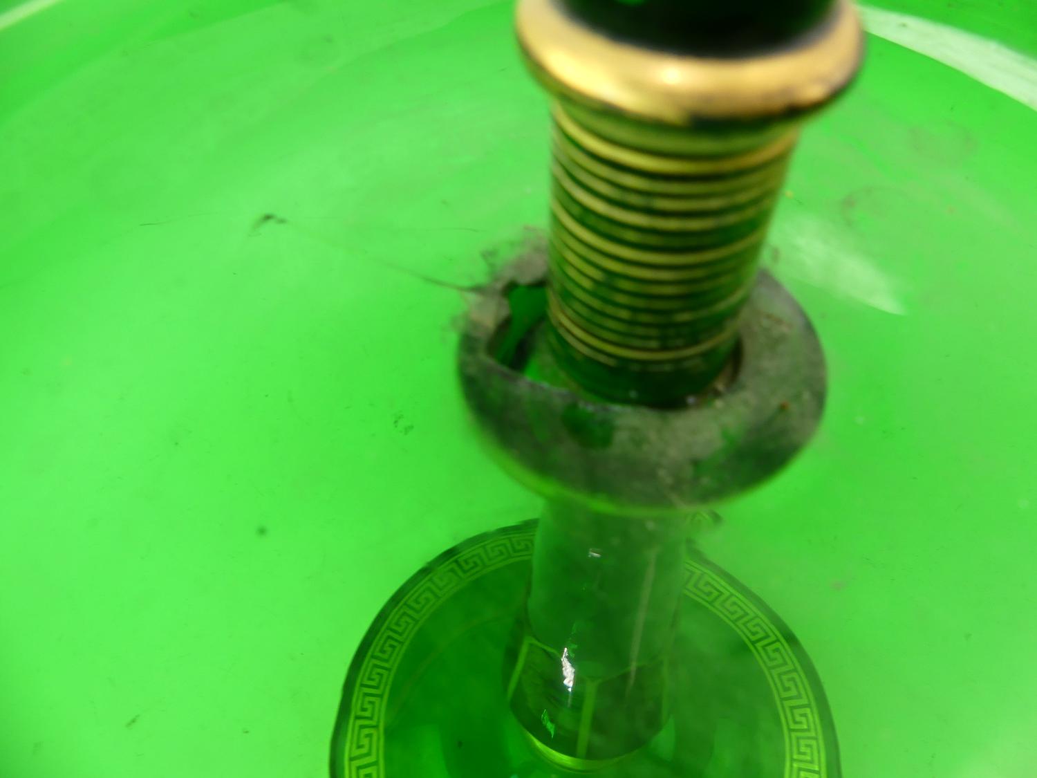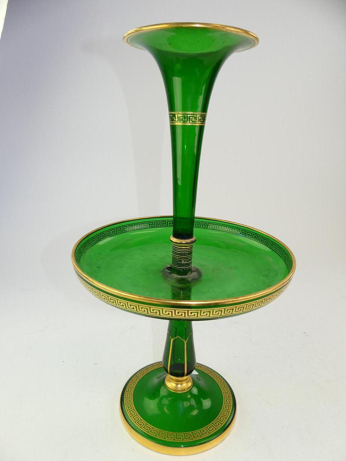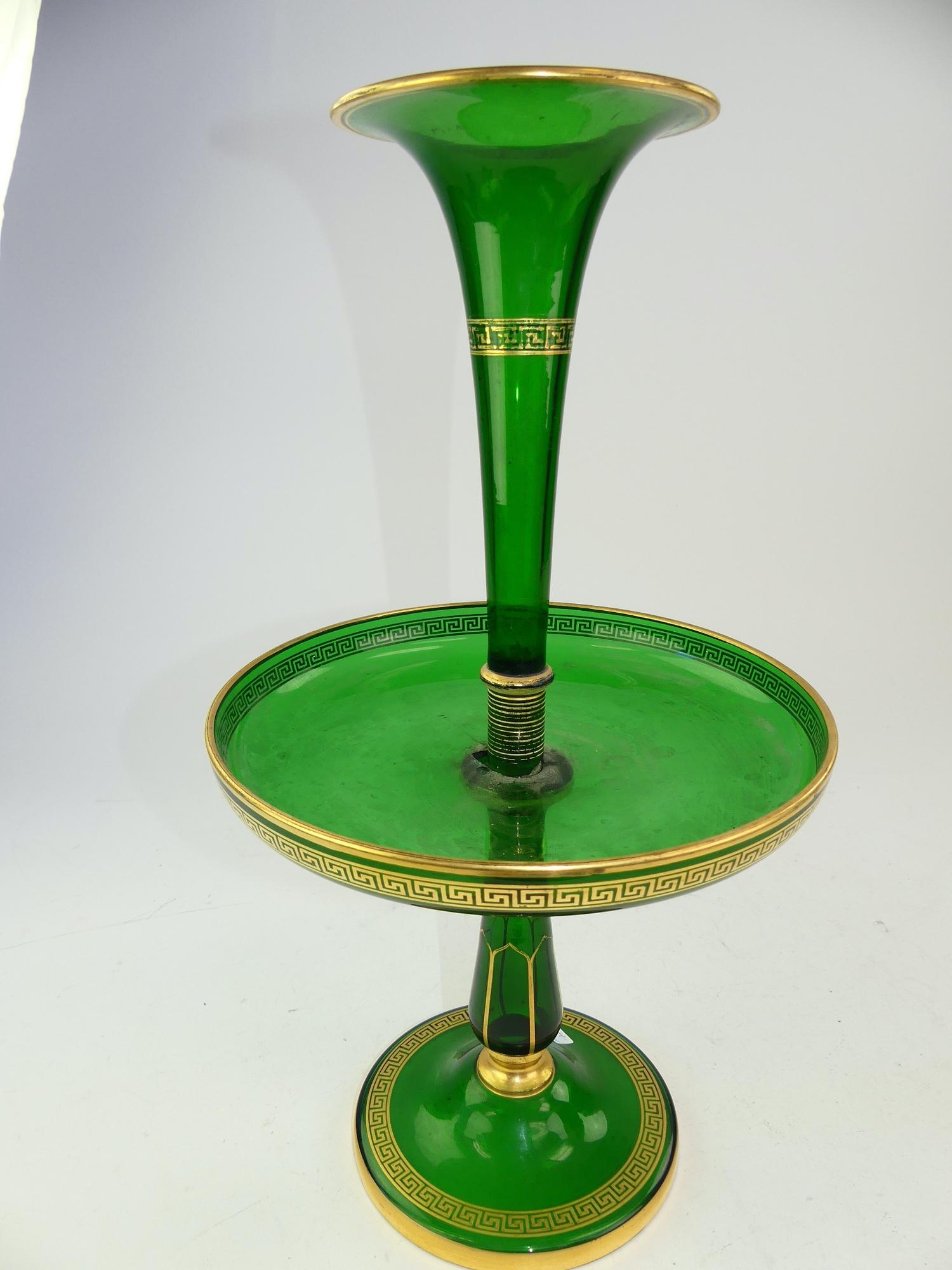 bohemian green glass epergne with gilt greek-key decoration, circa 1900, ht 19 1/2" (losses at joint)