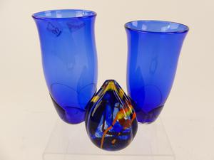 jon sawyer (1955-2012), two cobalt blue glass cups, ht. 6 1/4" with an art glass paper weight
