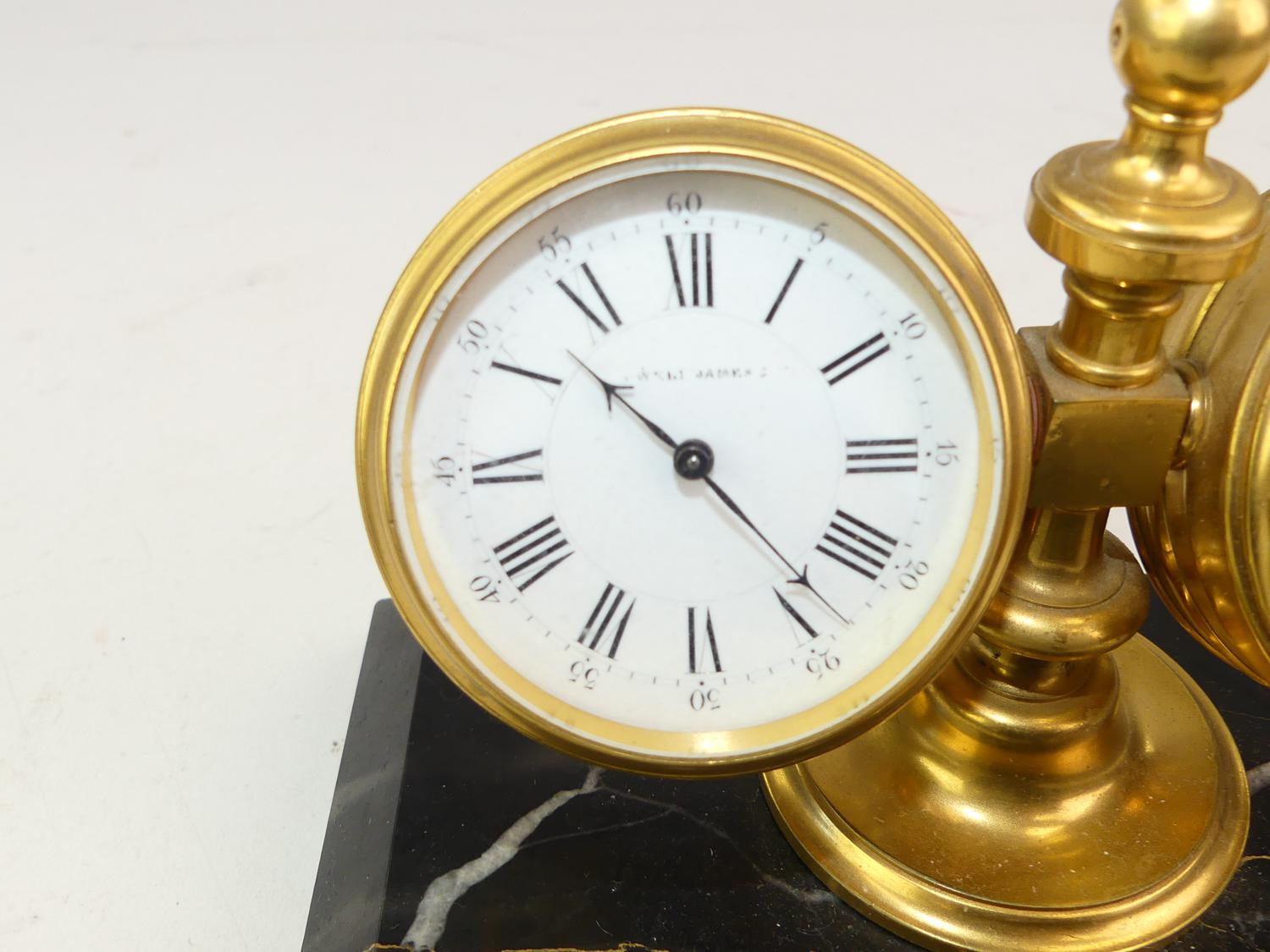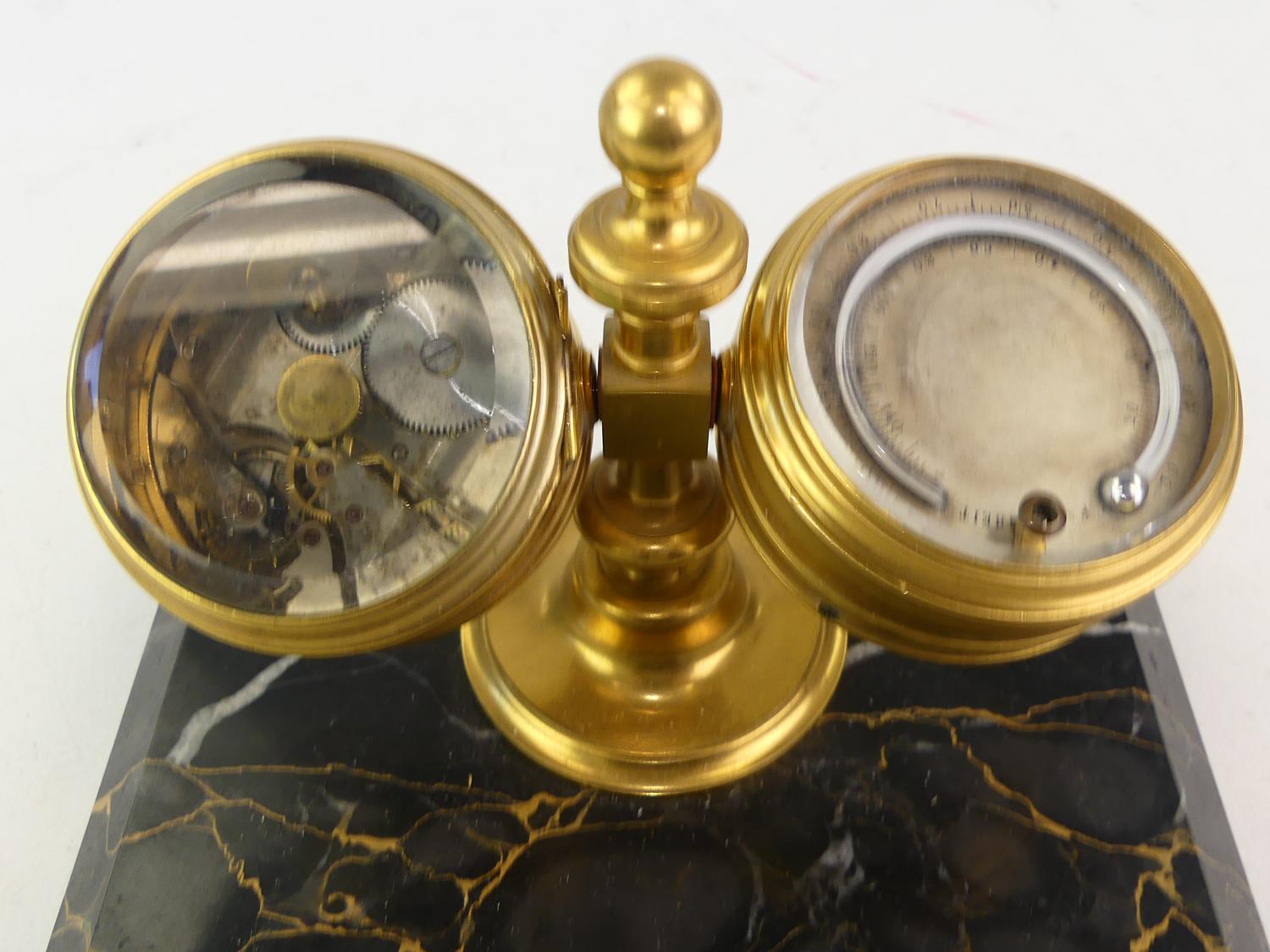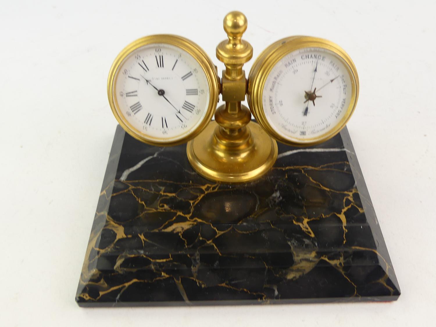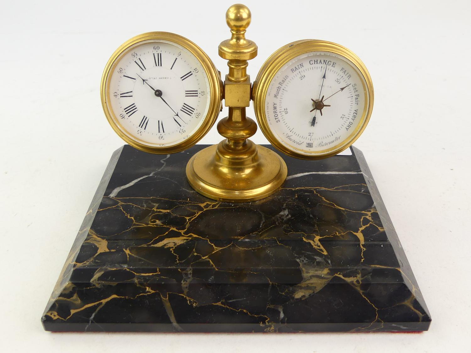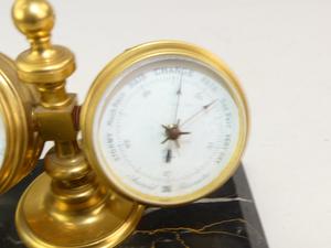 late 19th century marble pen stand mounted with clock and barometer, 4 1/2" x 7" x 5 3/4"