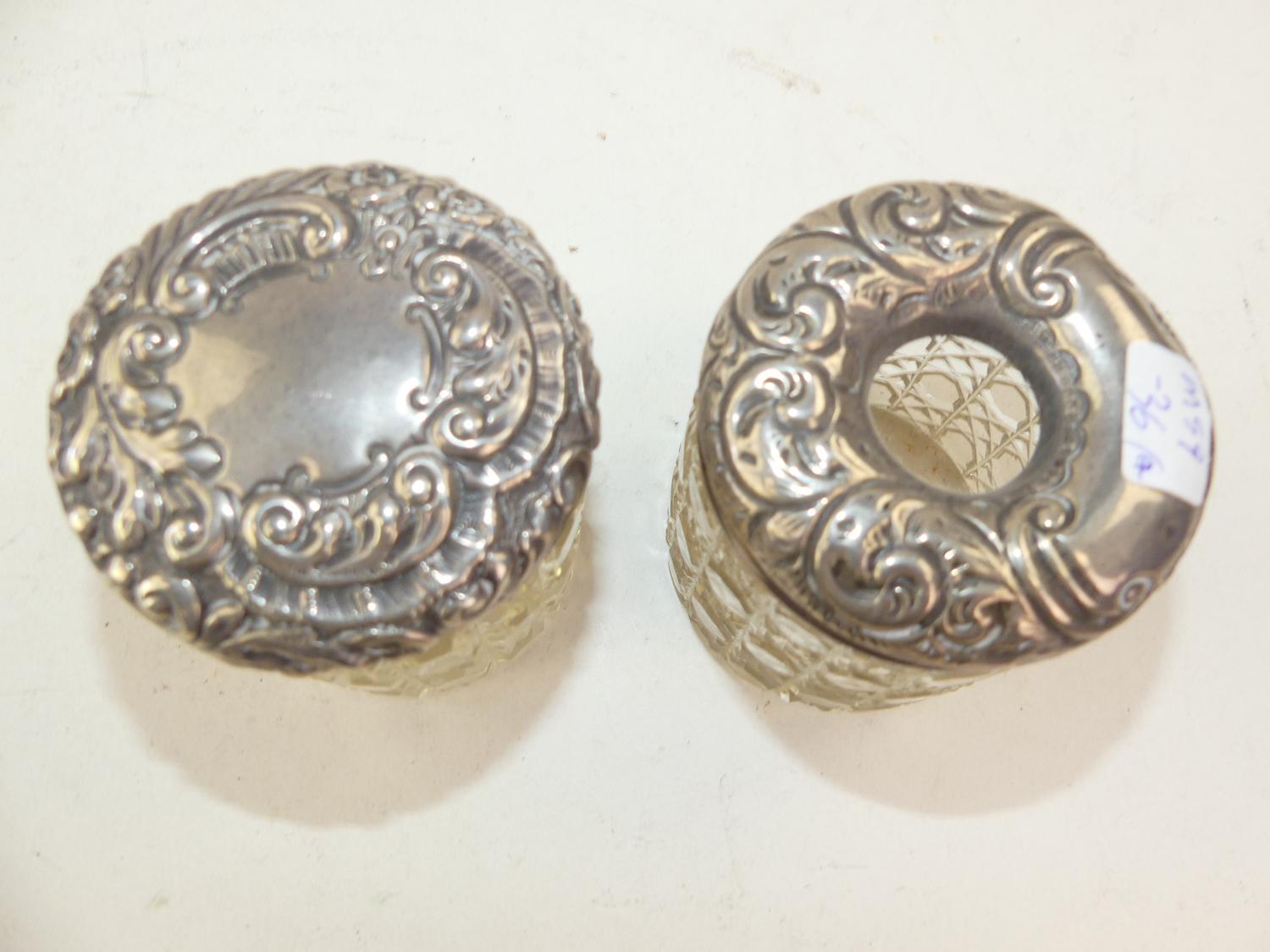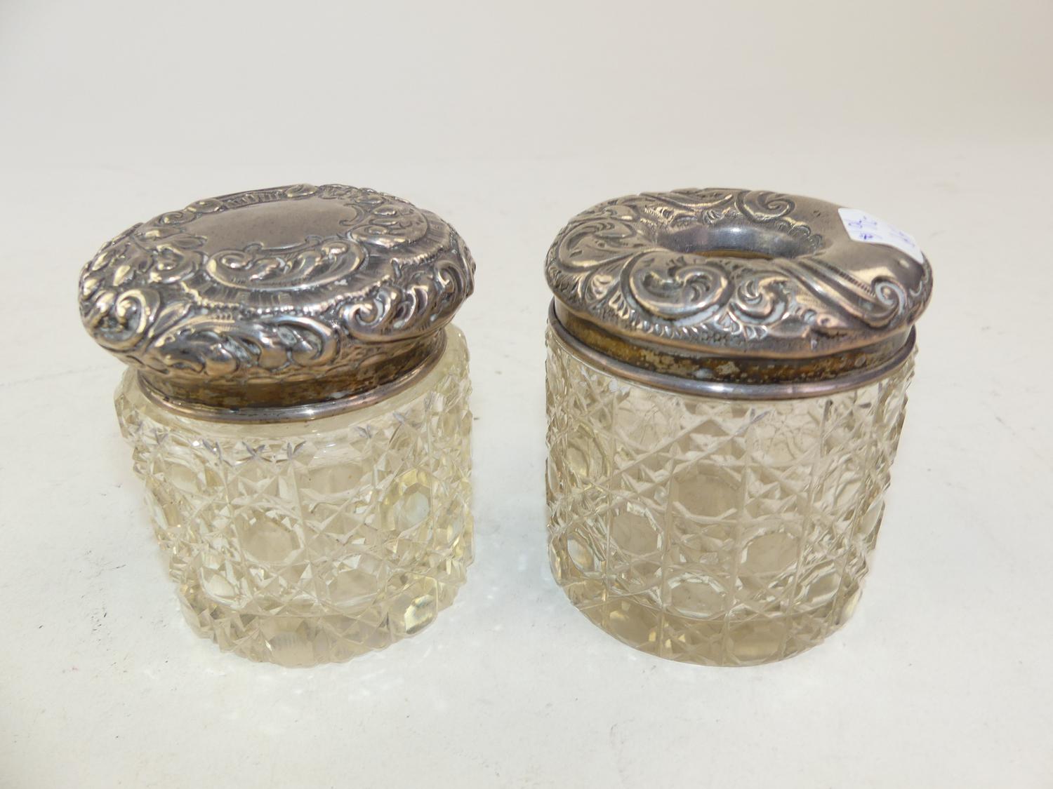 two cut crystal glass hair receivers with sterling silver tops, ht. 3"