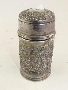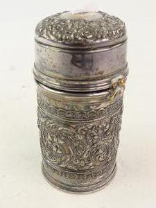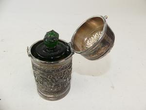 american meridian silver plate bottle case with green glass bottle, ht. 4 1/2"