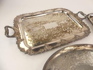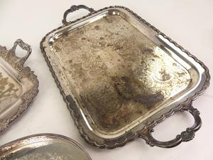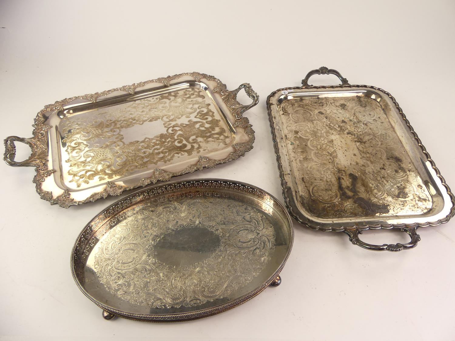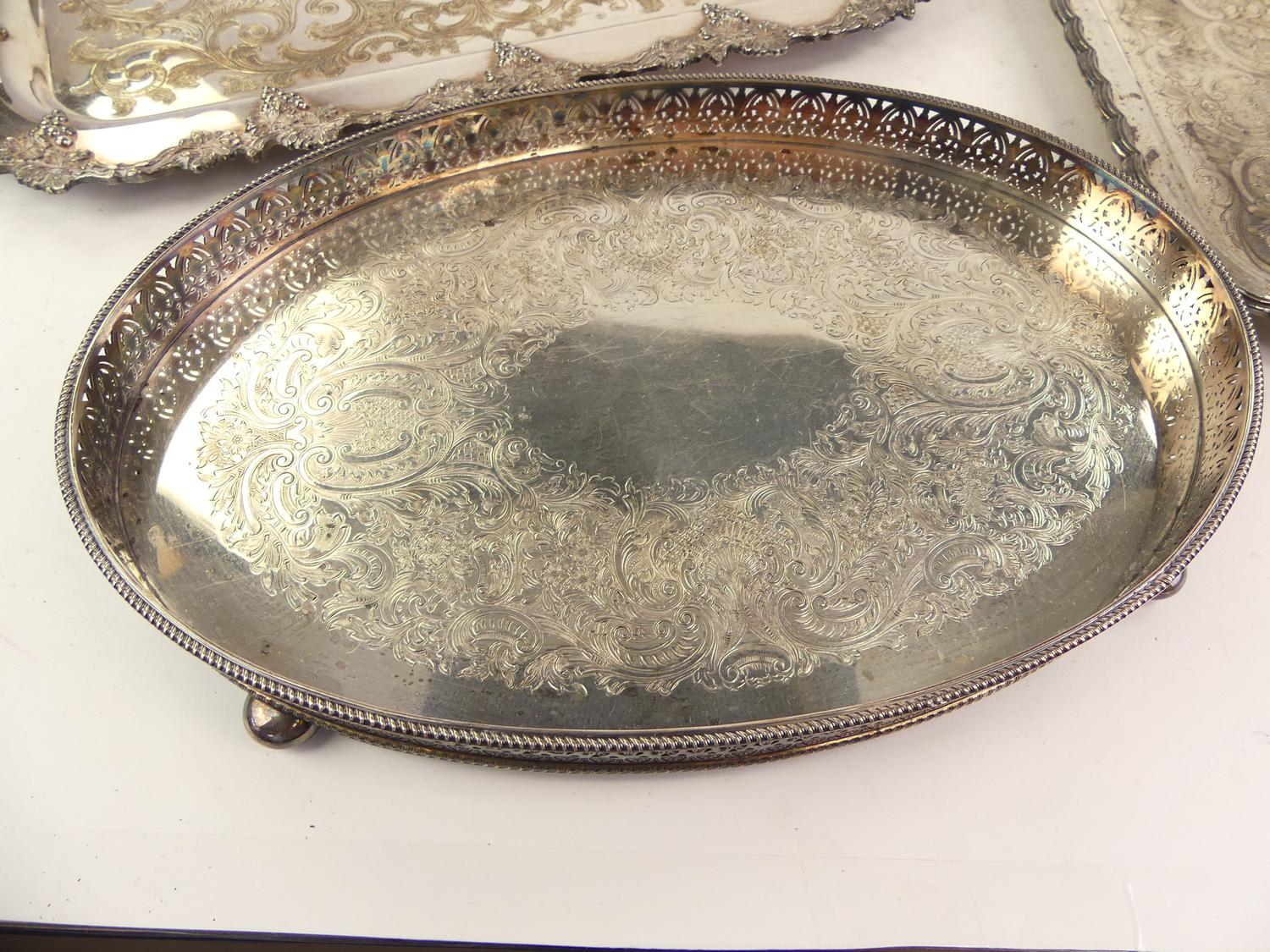birks regency plate footed gallery tray with two silver plate tea trays, length 25" and smaller