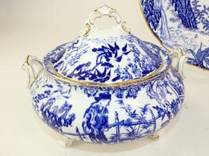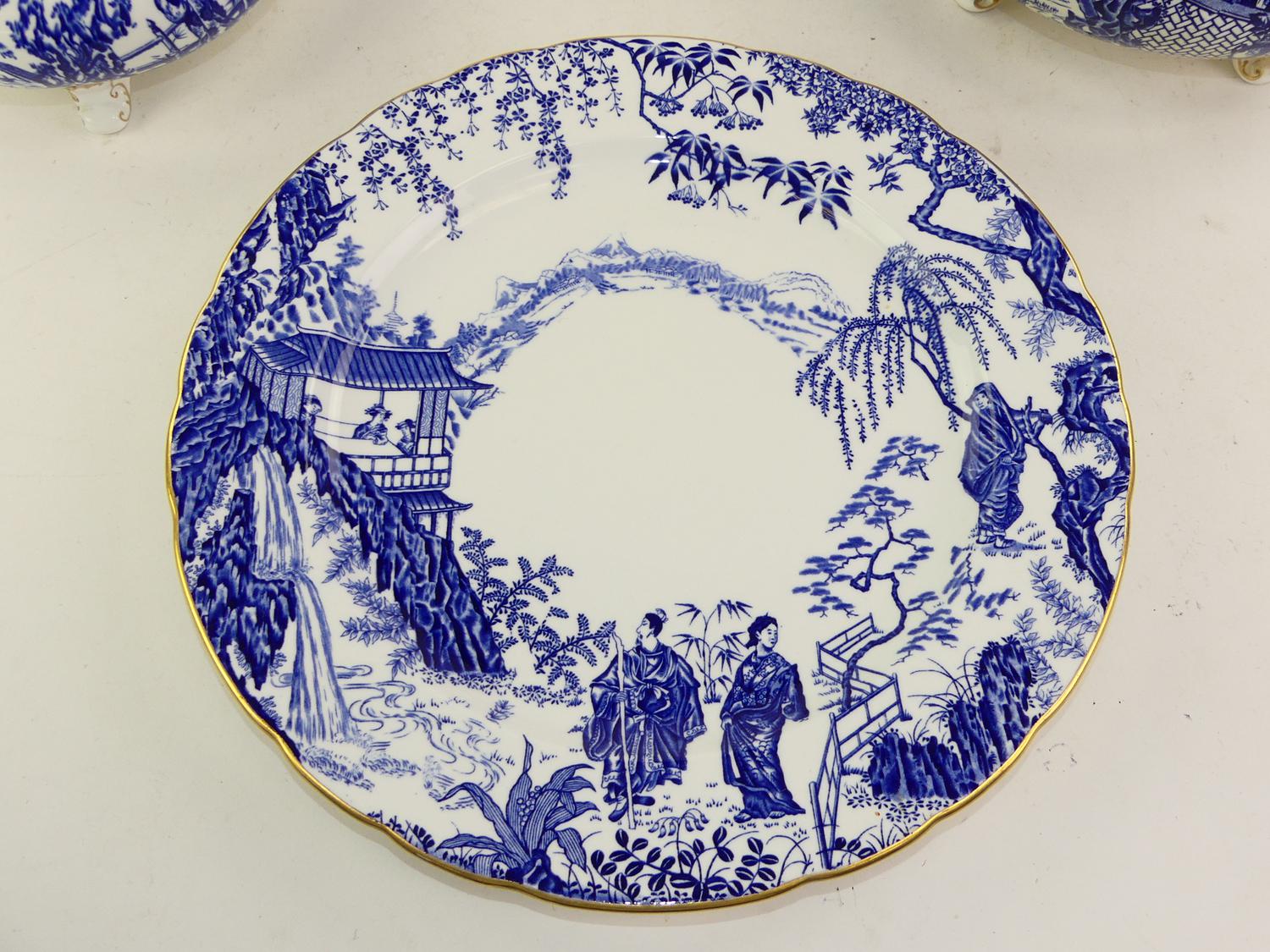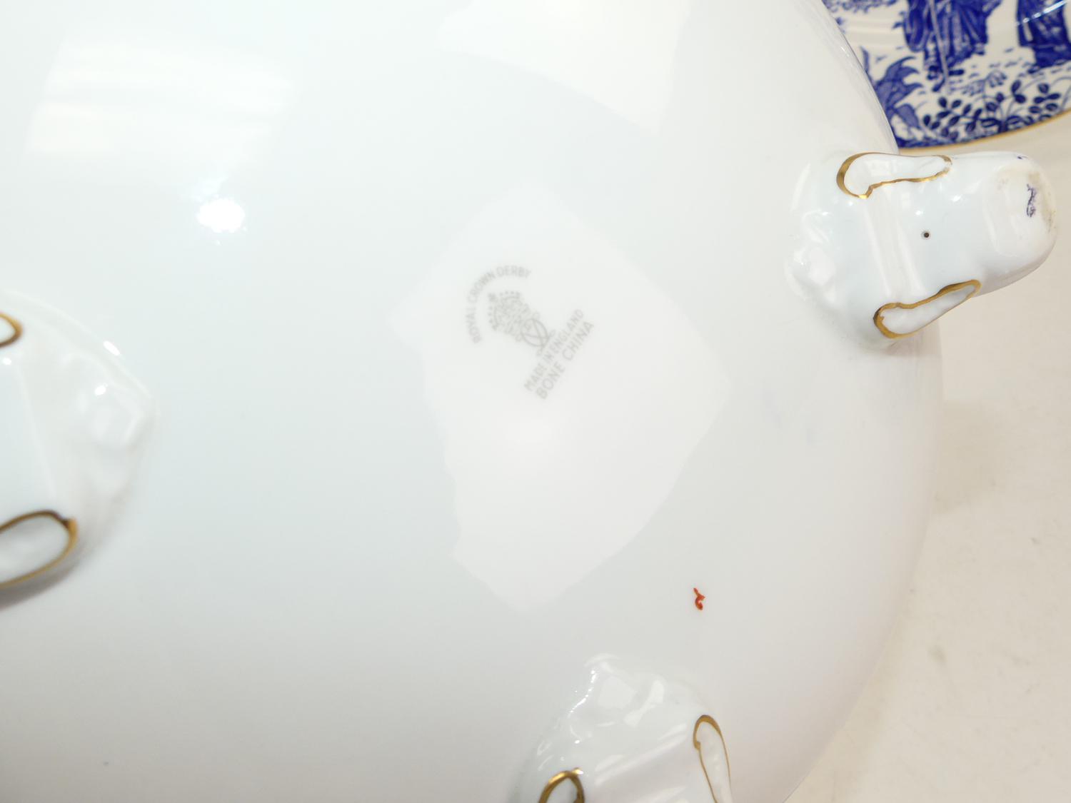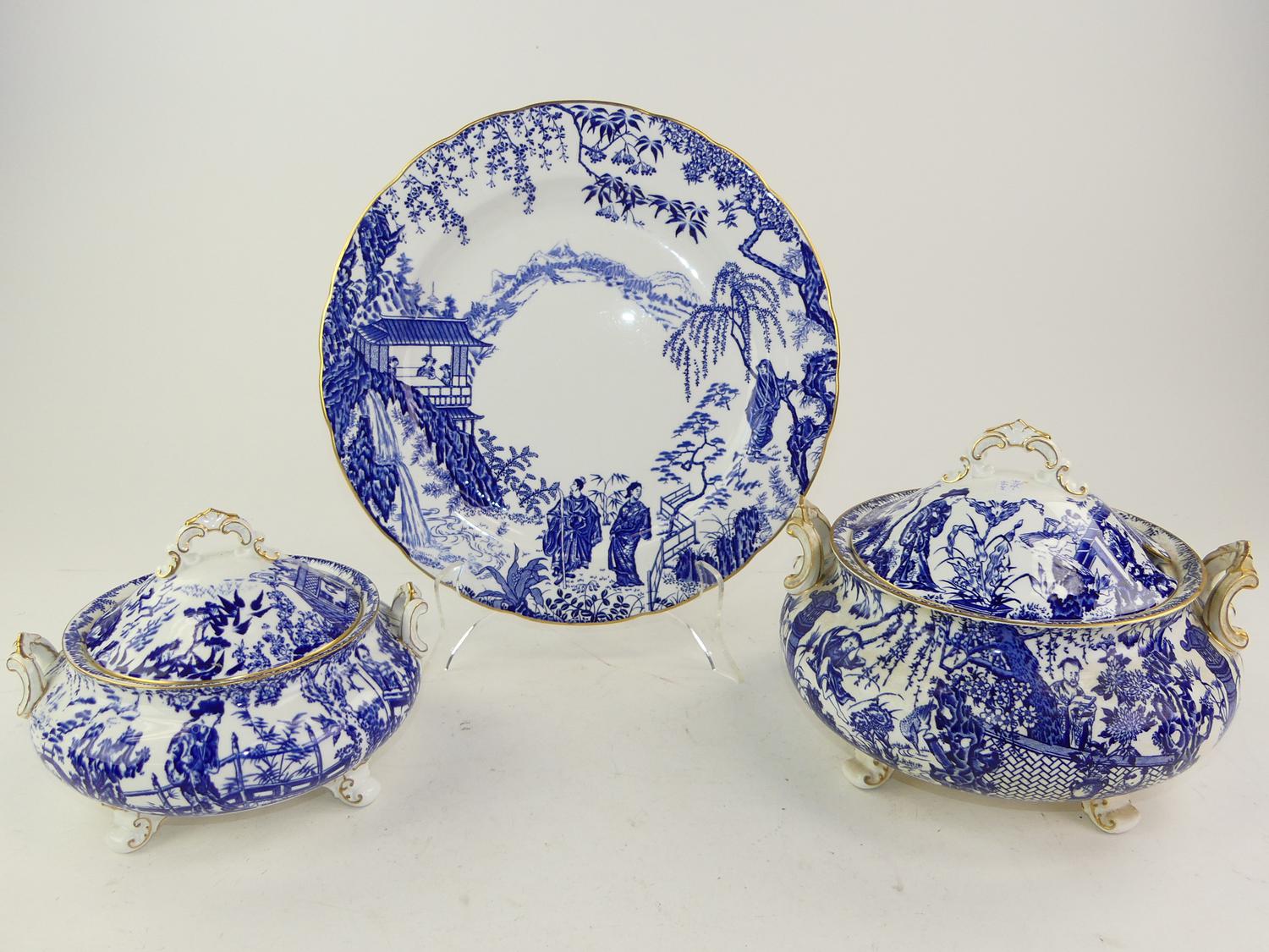 two royal crown derby mikado pattern footed tureens and a platter, condition noted on larger tureen