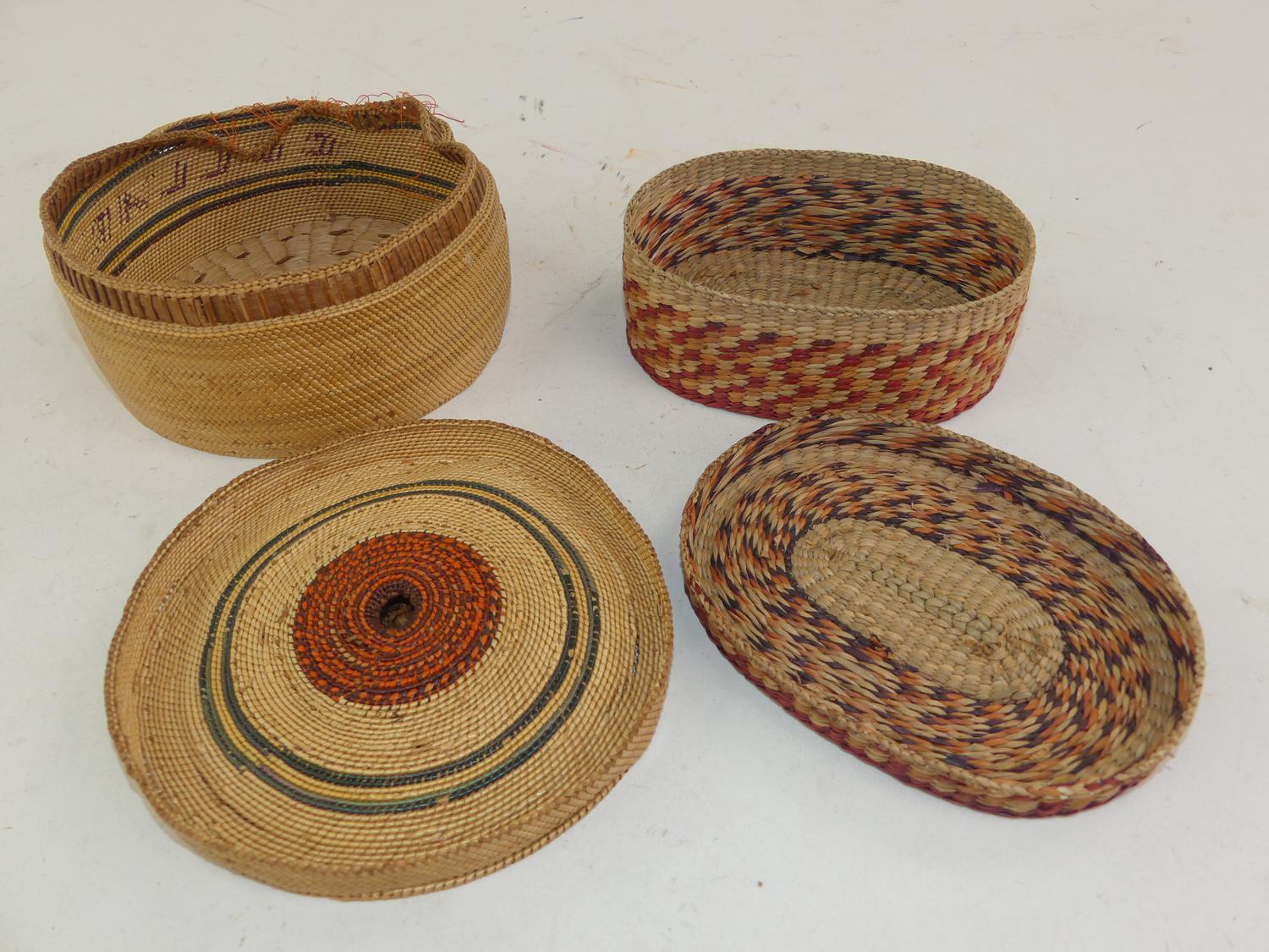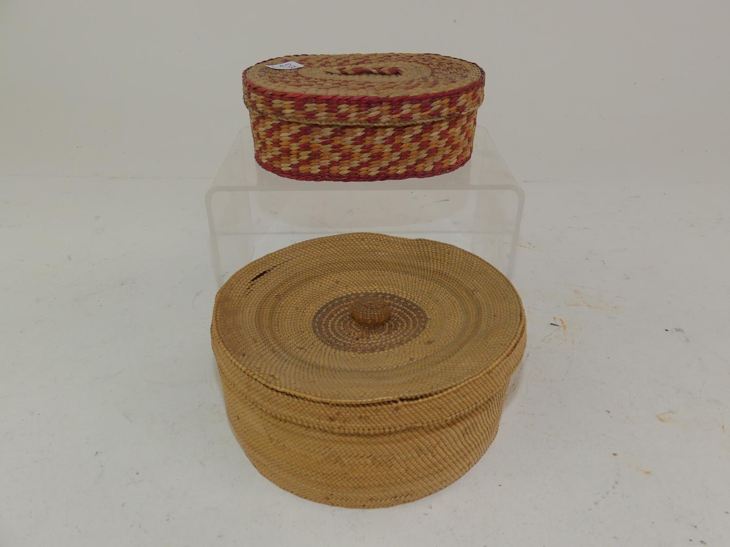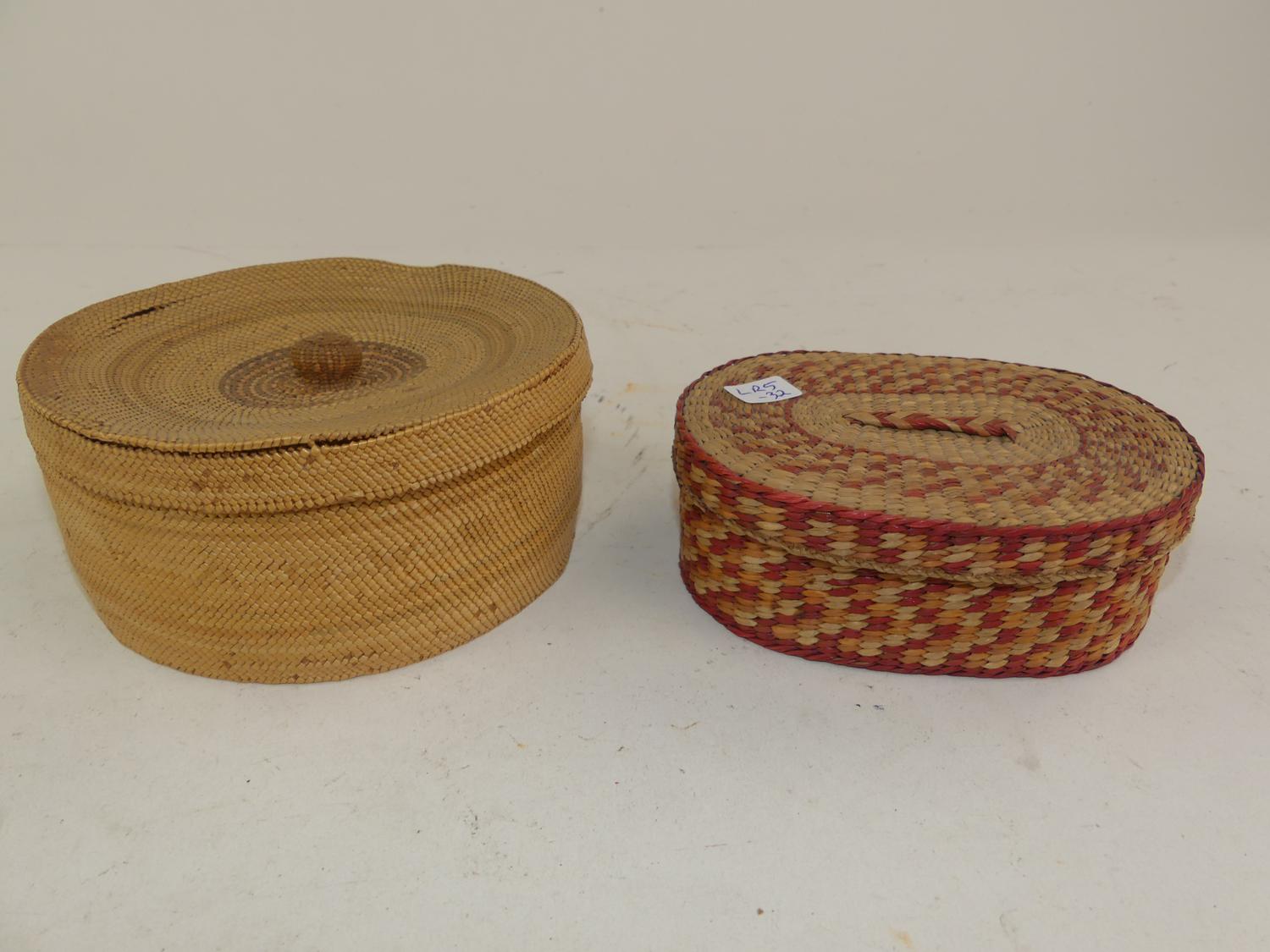 two north west coast native woven covered baskets
