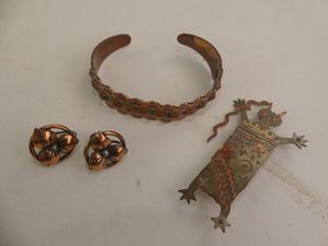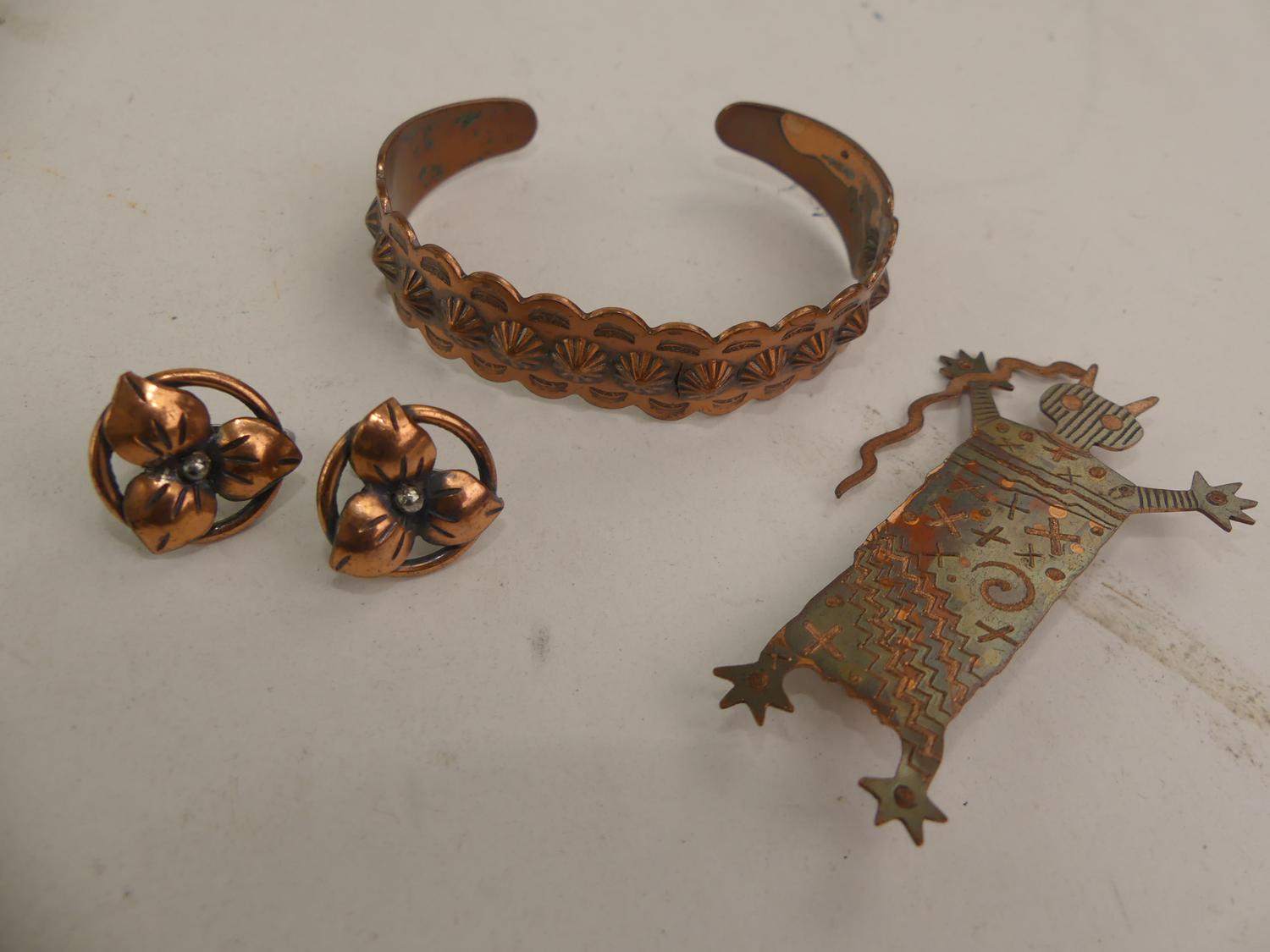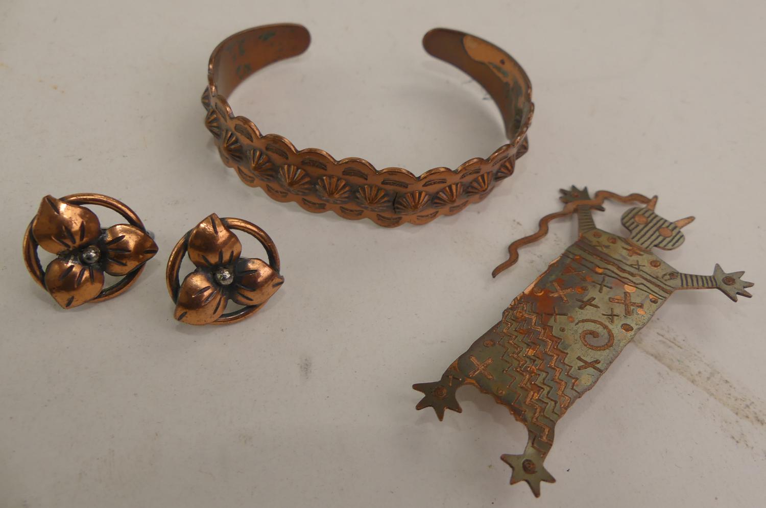 j. mcdermott figural brooch, copper bell cuff bracelet and a pair of sterling copper earrings