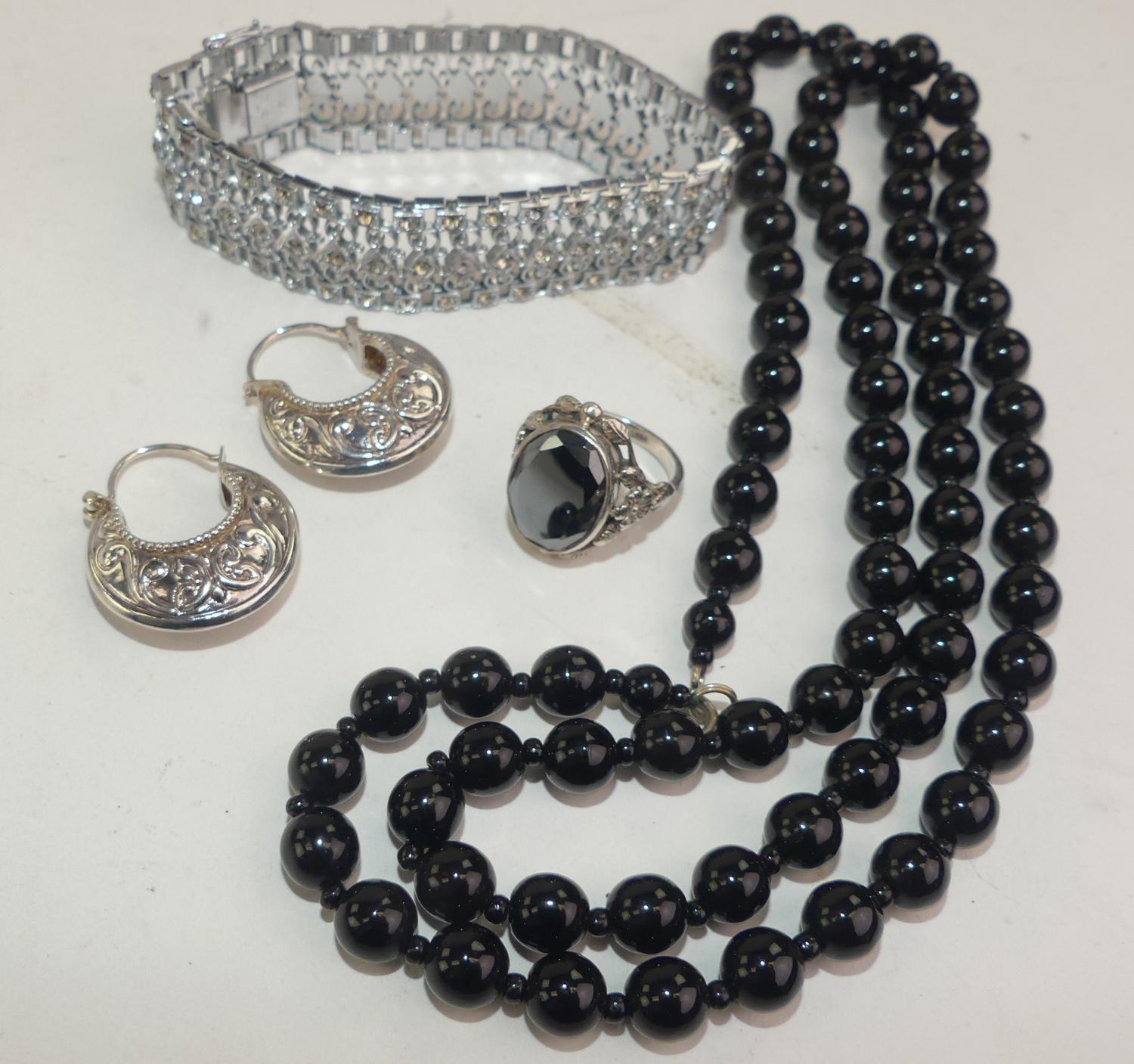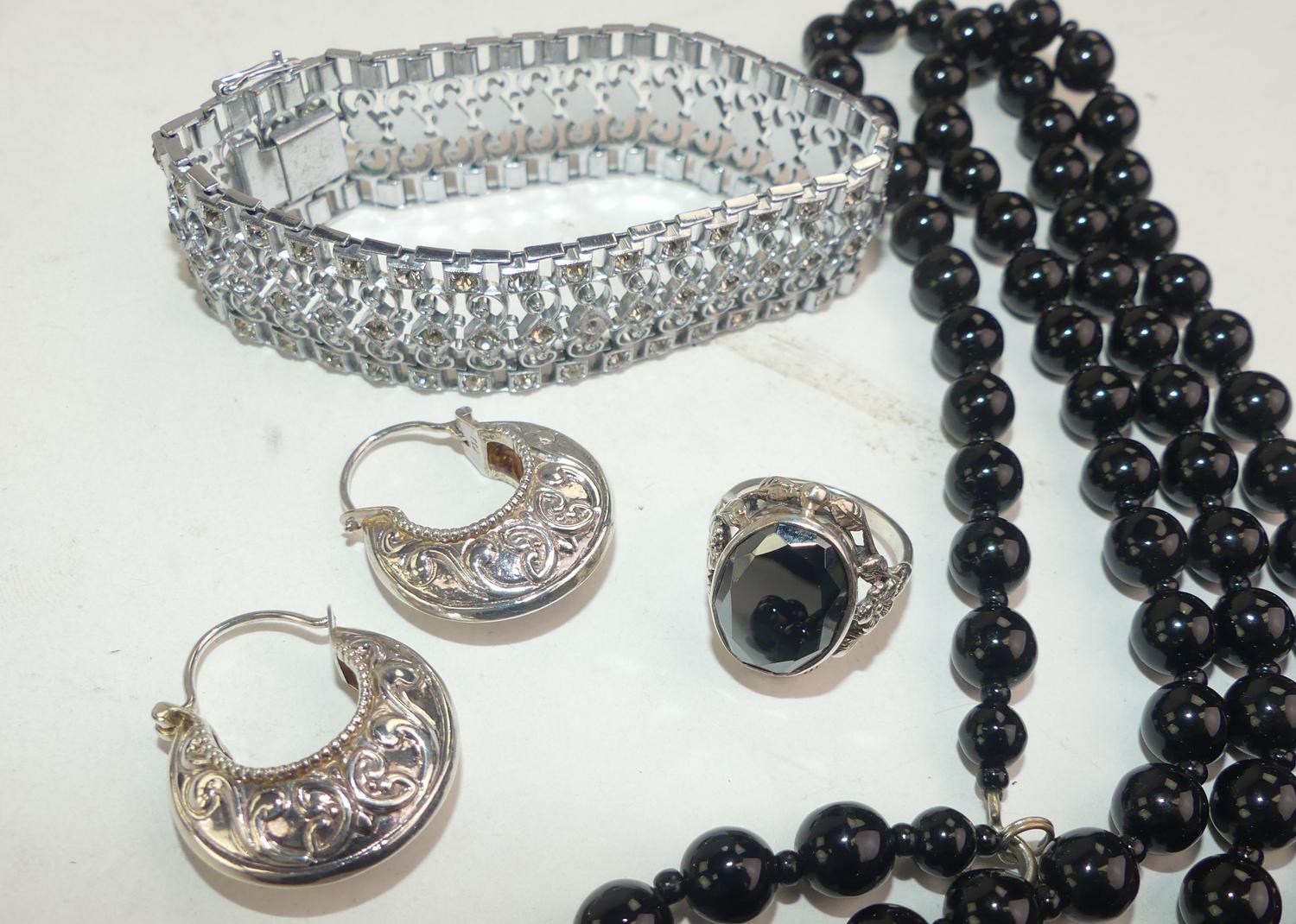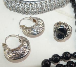 nepal sterling silver earrings, silver hemitate ring, onyx bead necklace, rhinestone bracelet