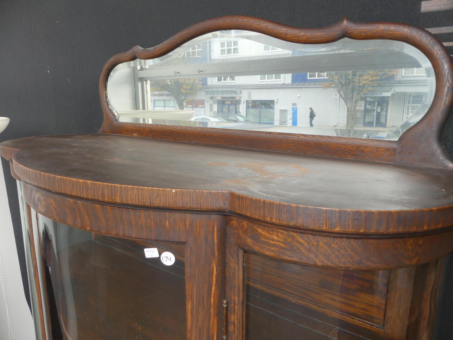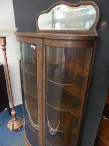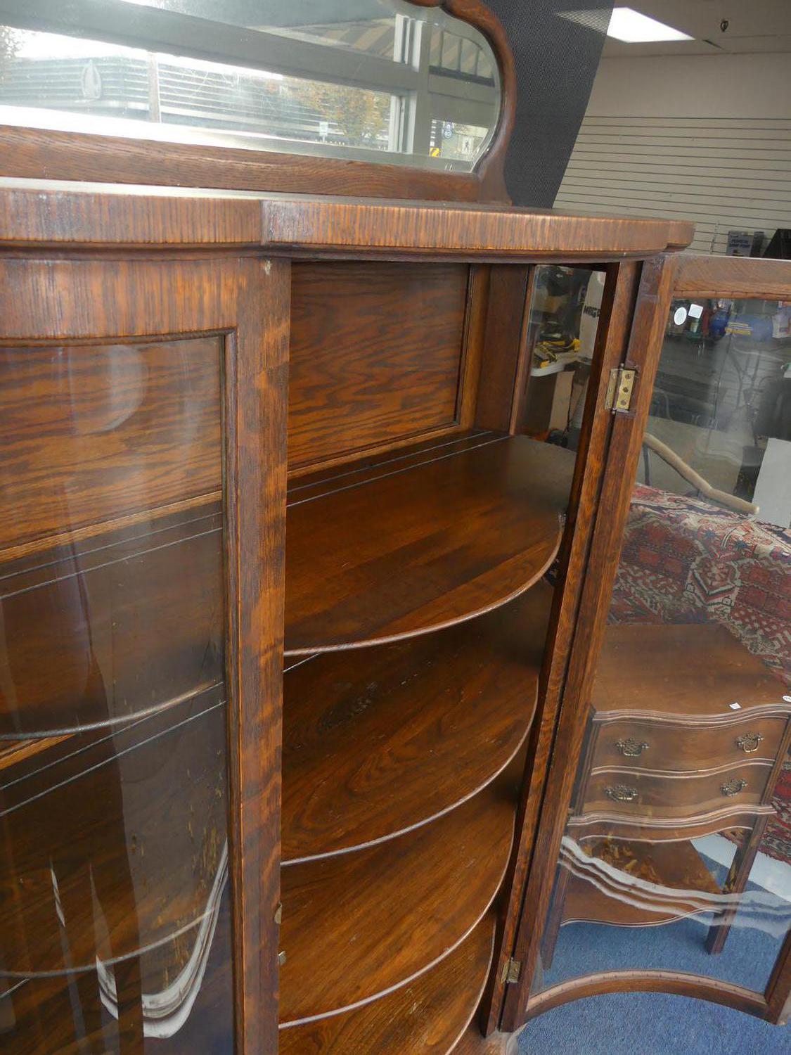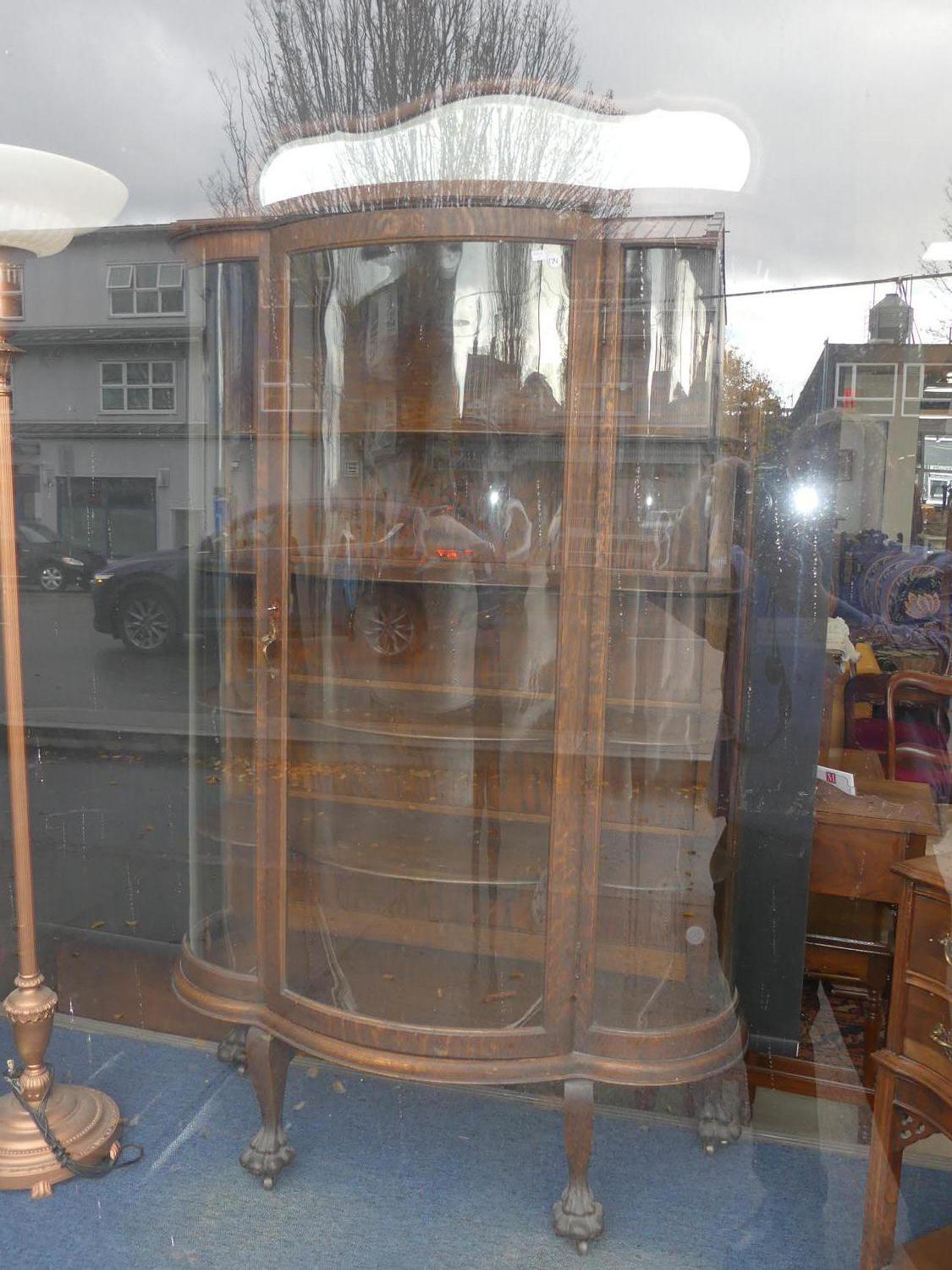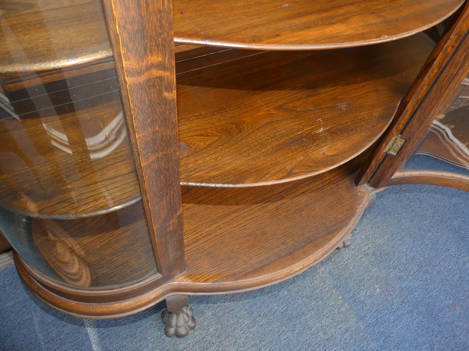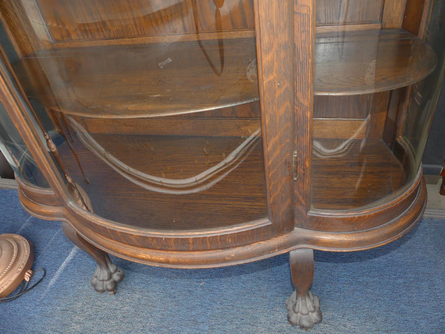edwardian oak bow front curio cabinet with lion paw feet, 74" x 41" x 17"