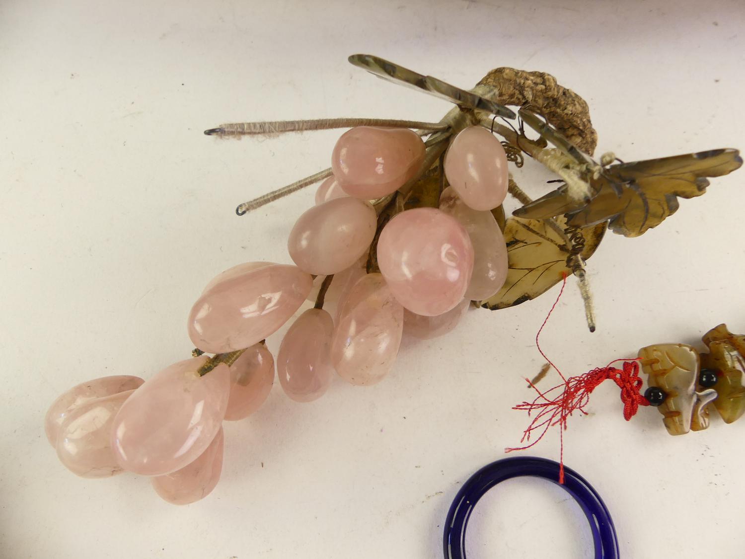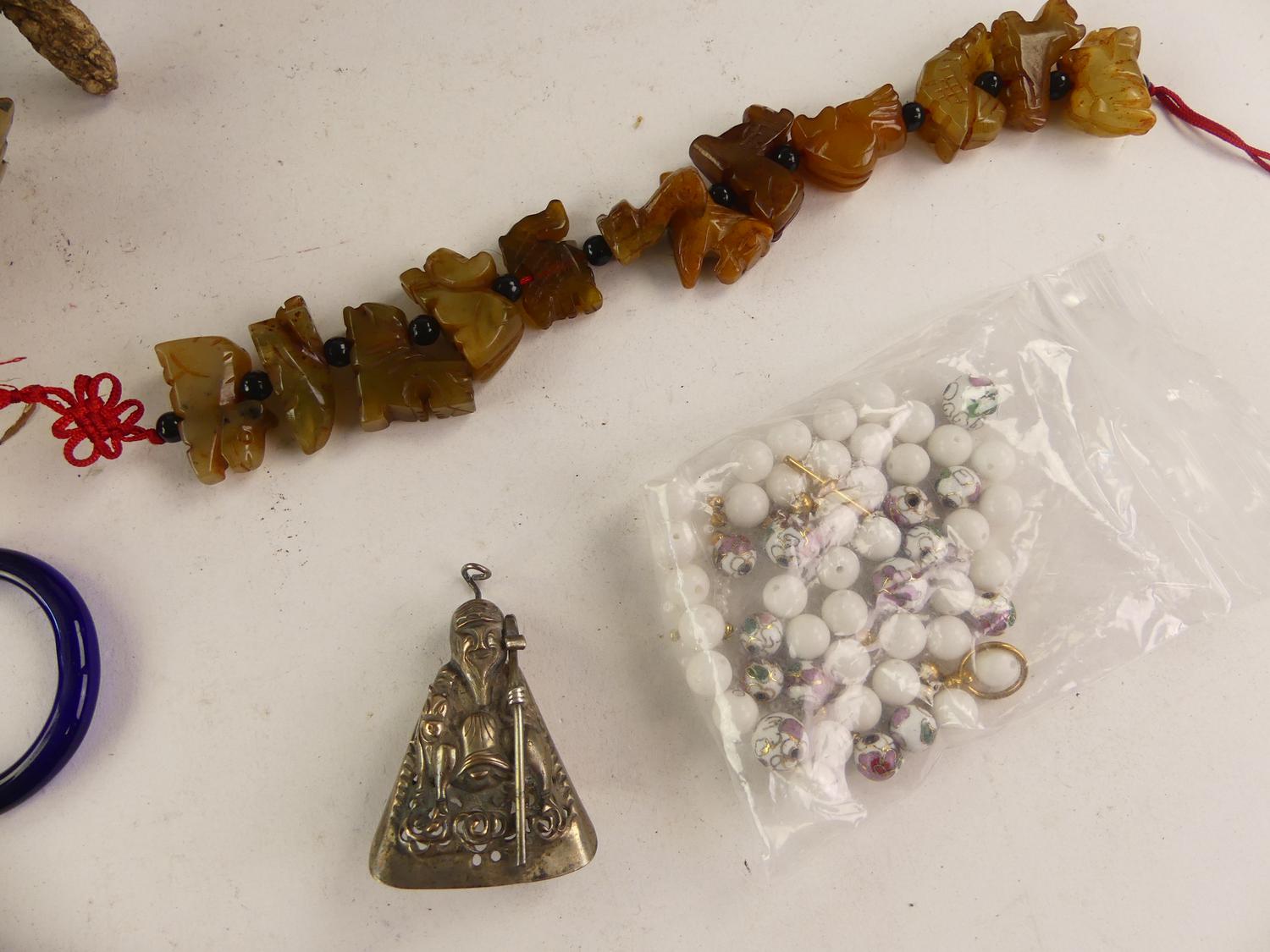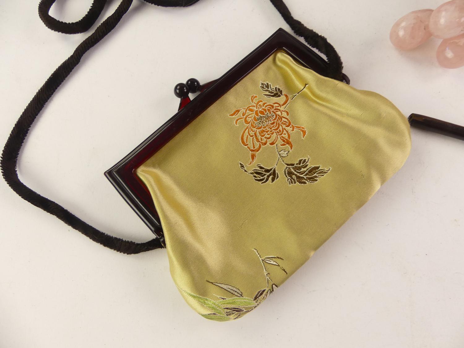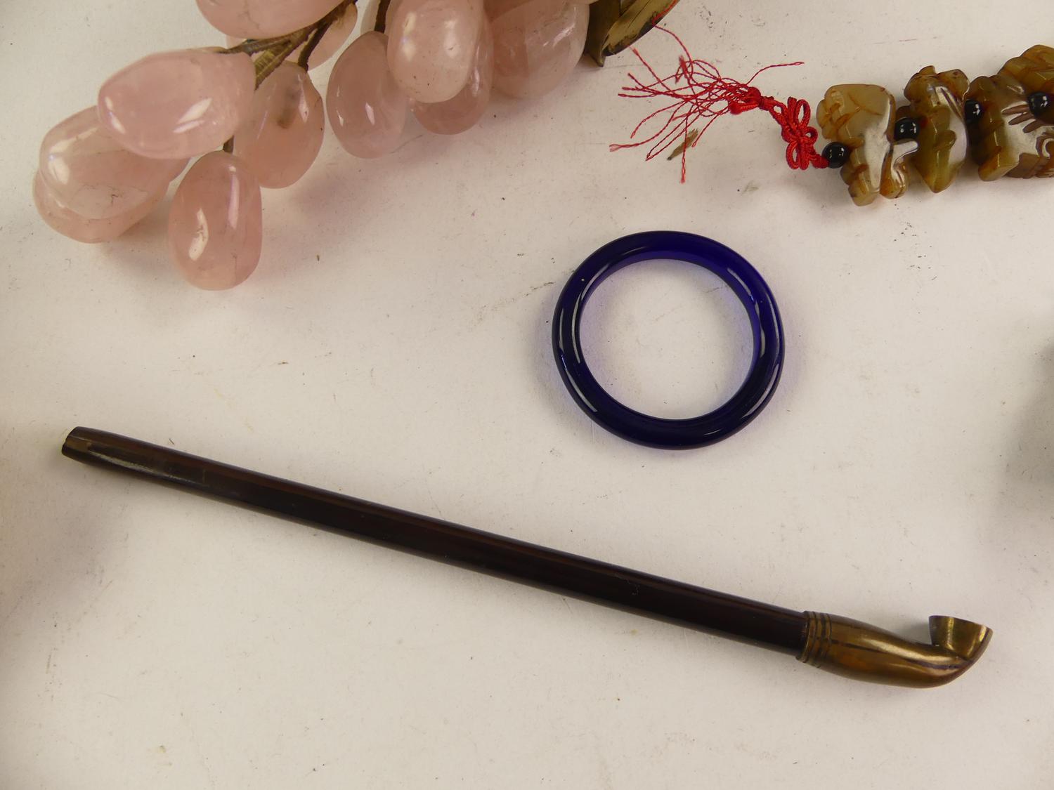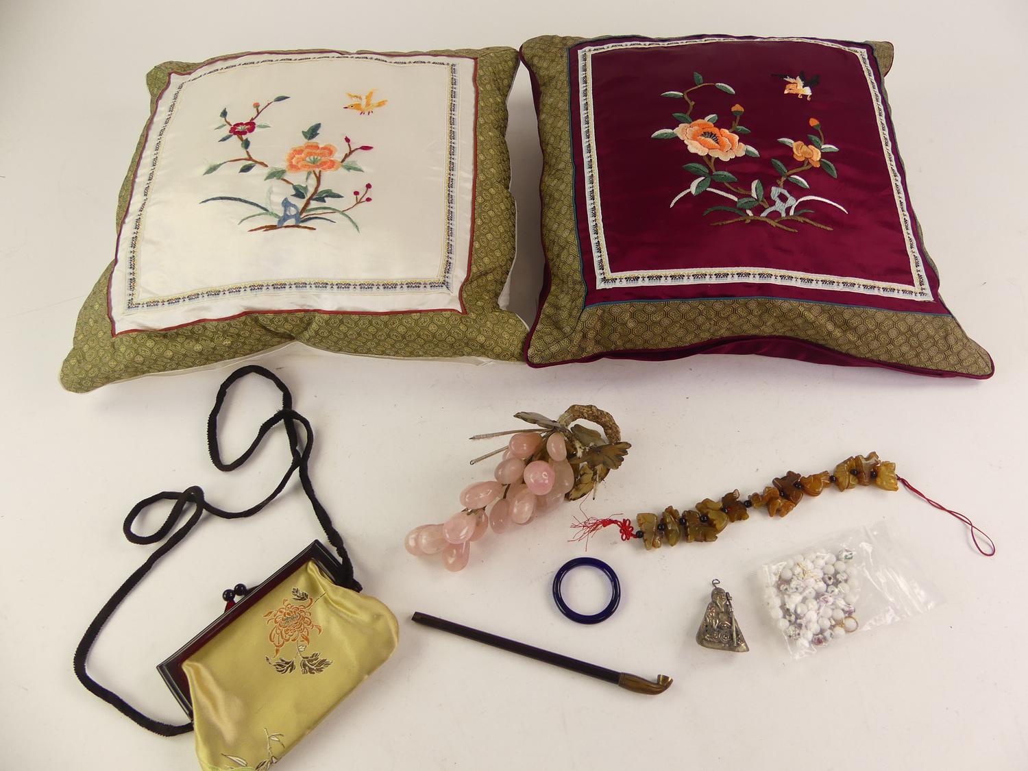 lot: embroidered pillows, jade grapes, cloisonne beads, purse, opium pipe, carved beads and buddha pendant