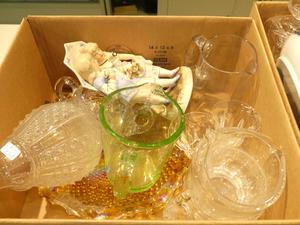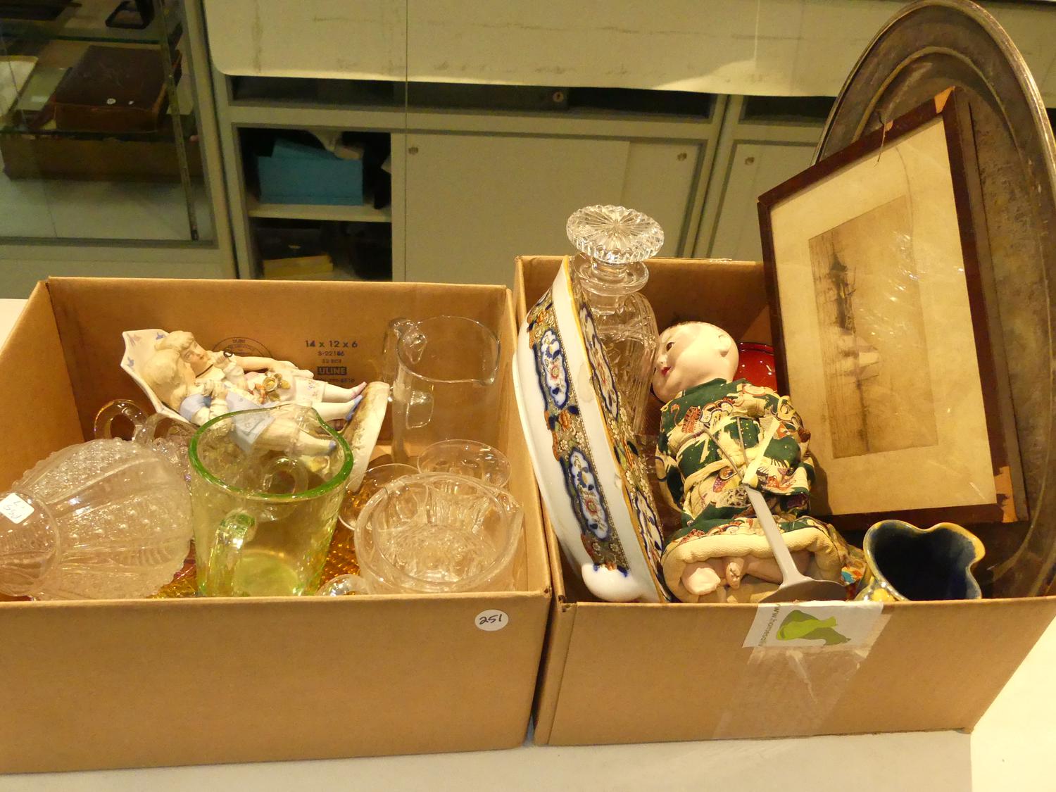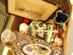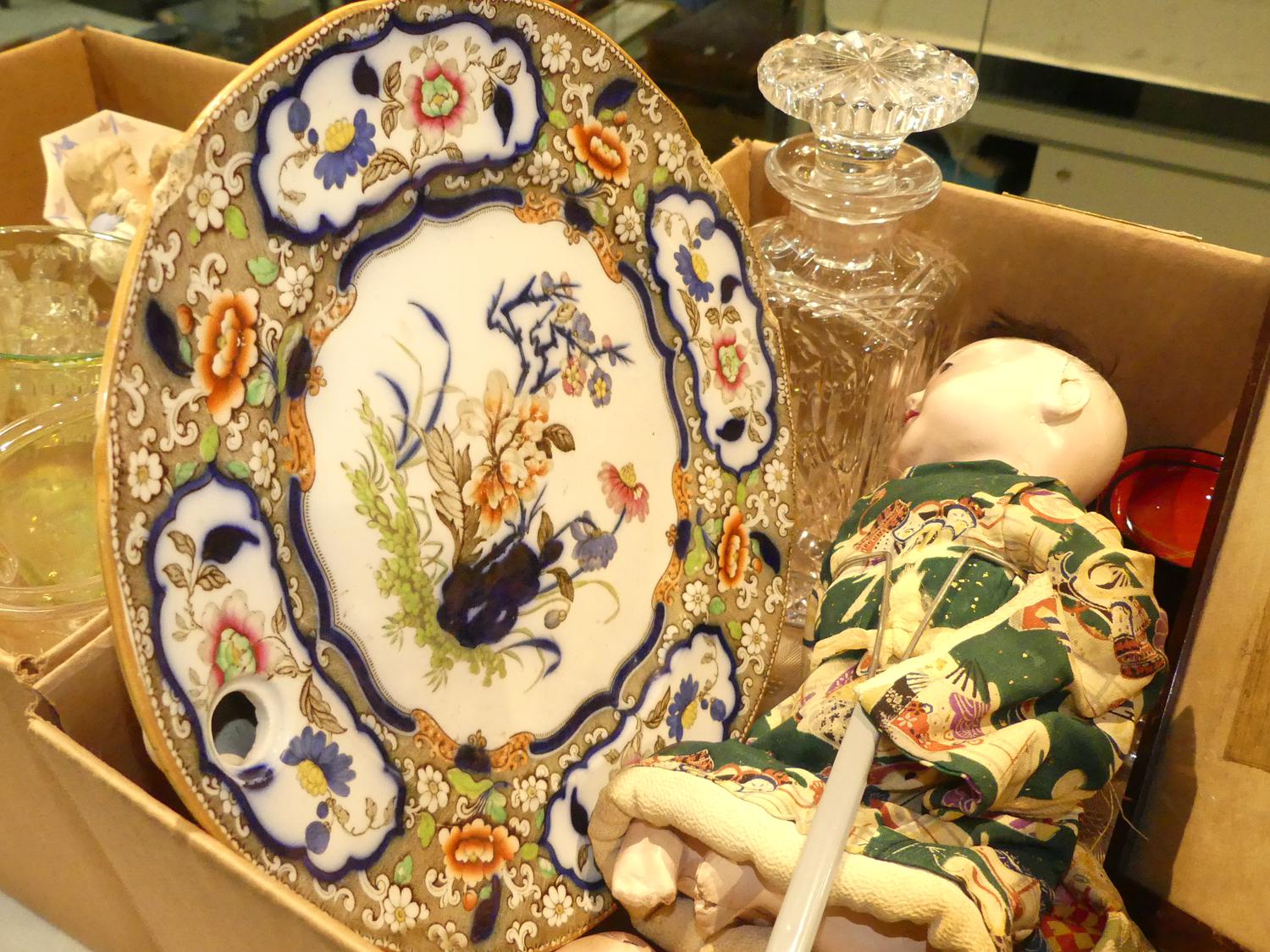 lot of antique and later crystal, dolls, ironstone, silverplate, etc.