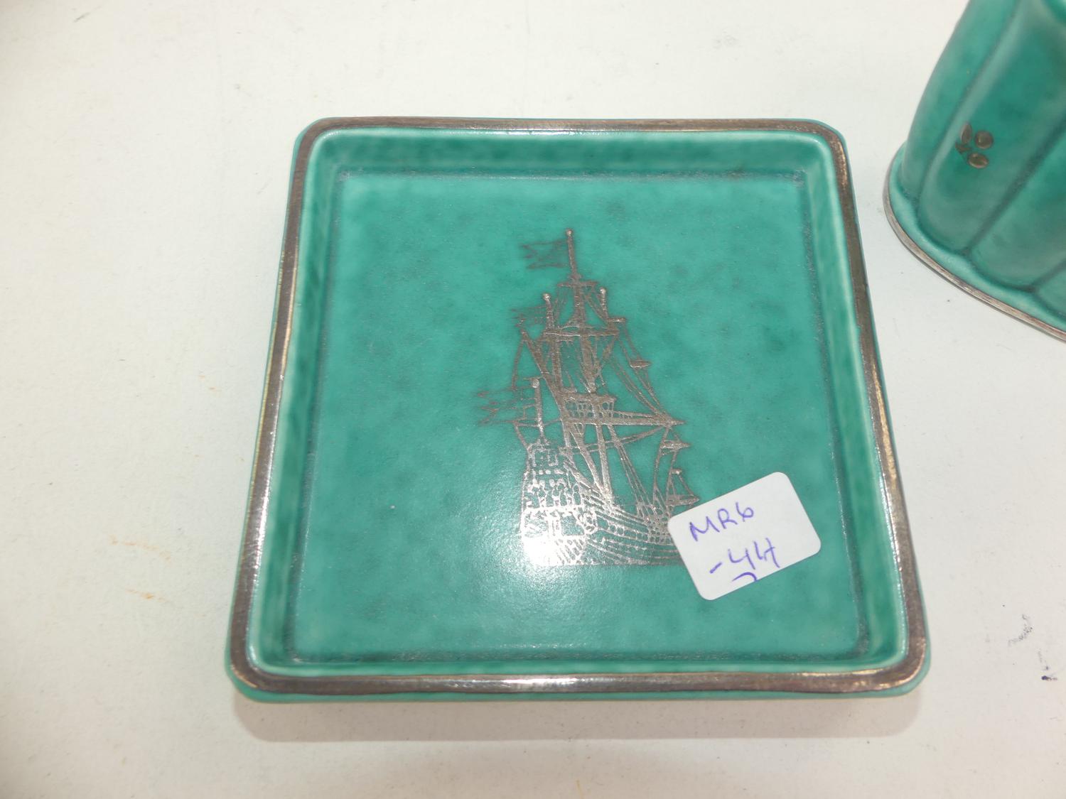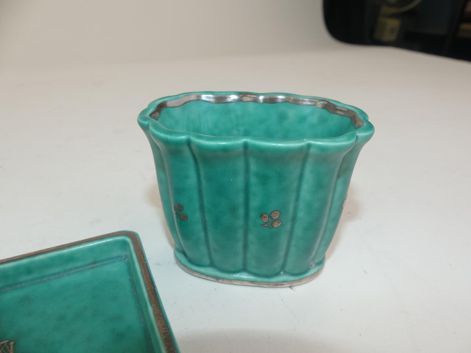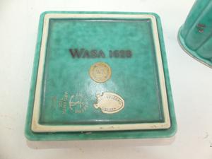 2pc gustavusberg swedish art pottery, silver inlay, "wasa 1628"