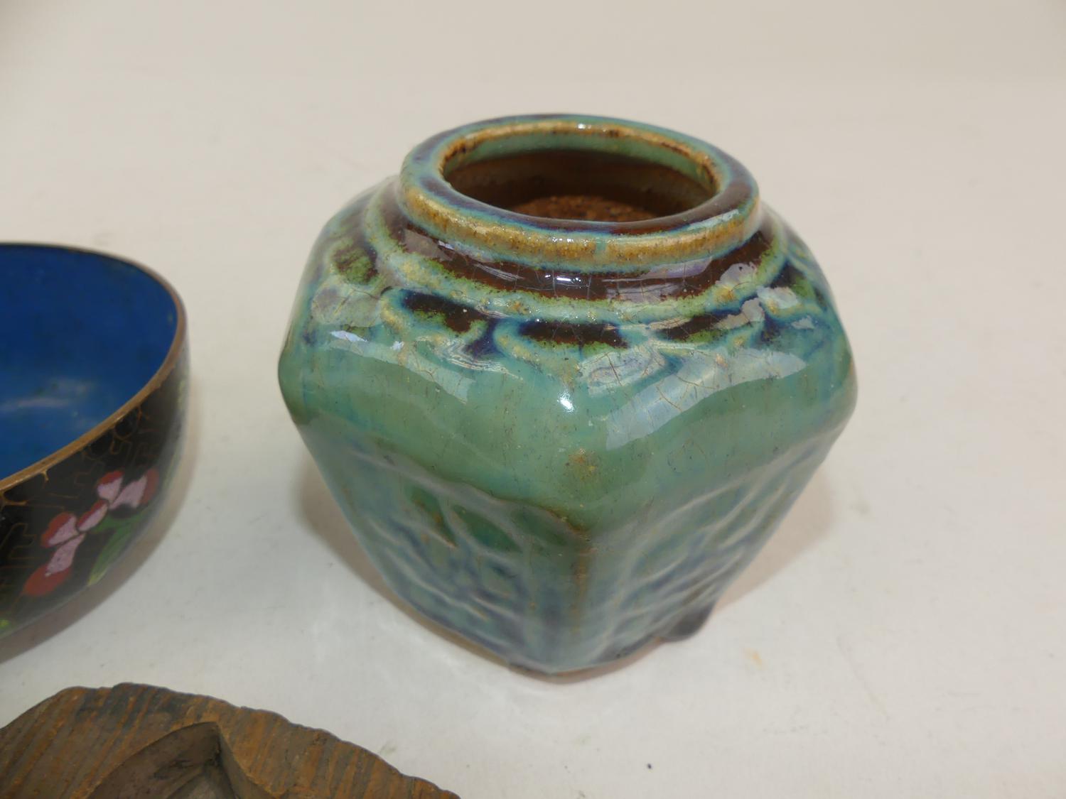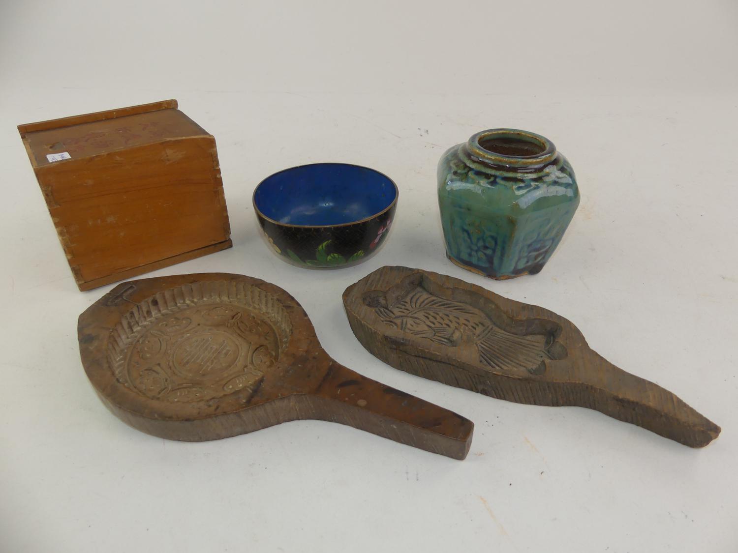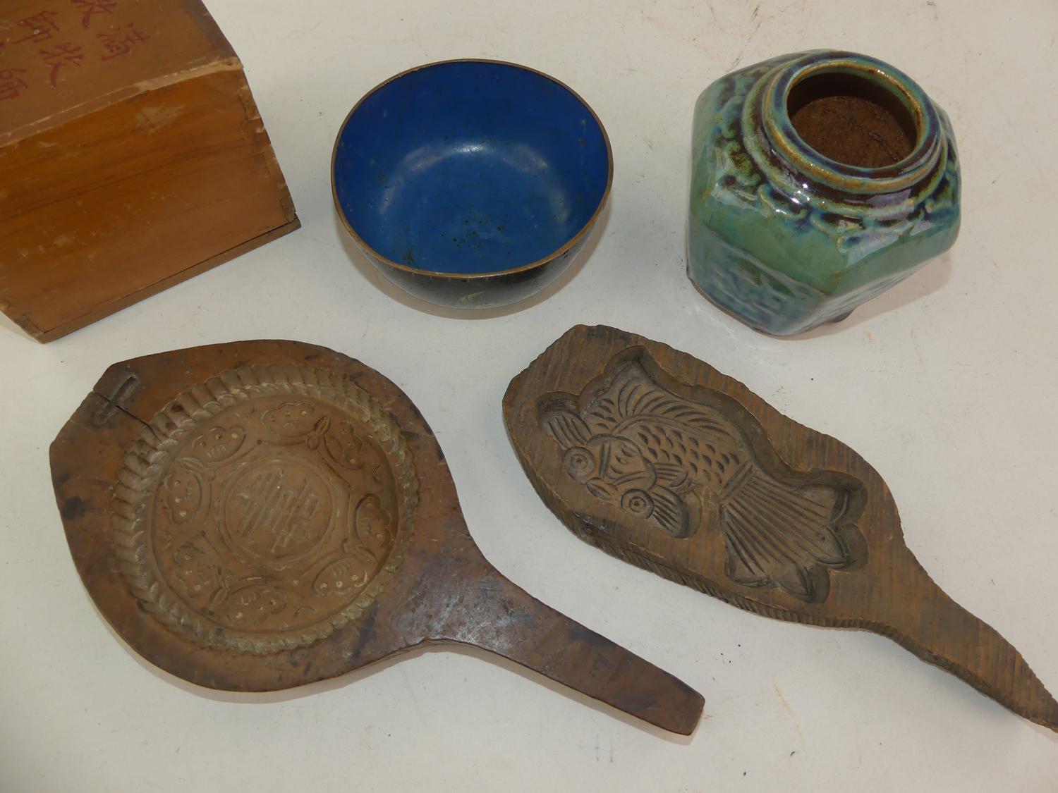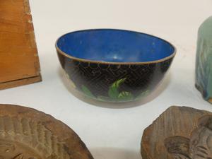 chinese cloisonne enamel bowl, mooncake molds, brush cup (5pc)