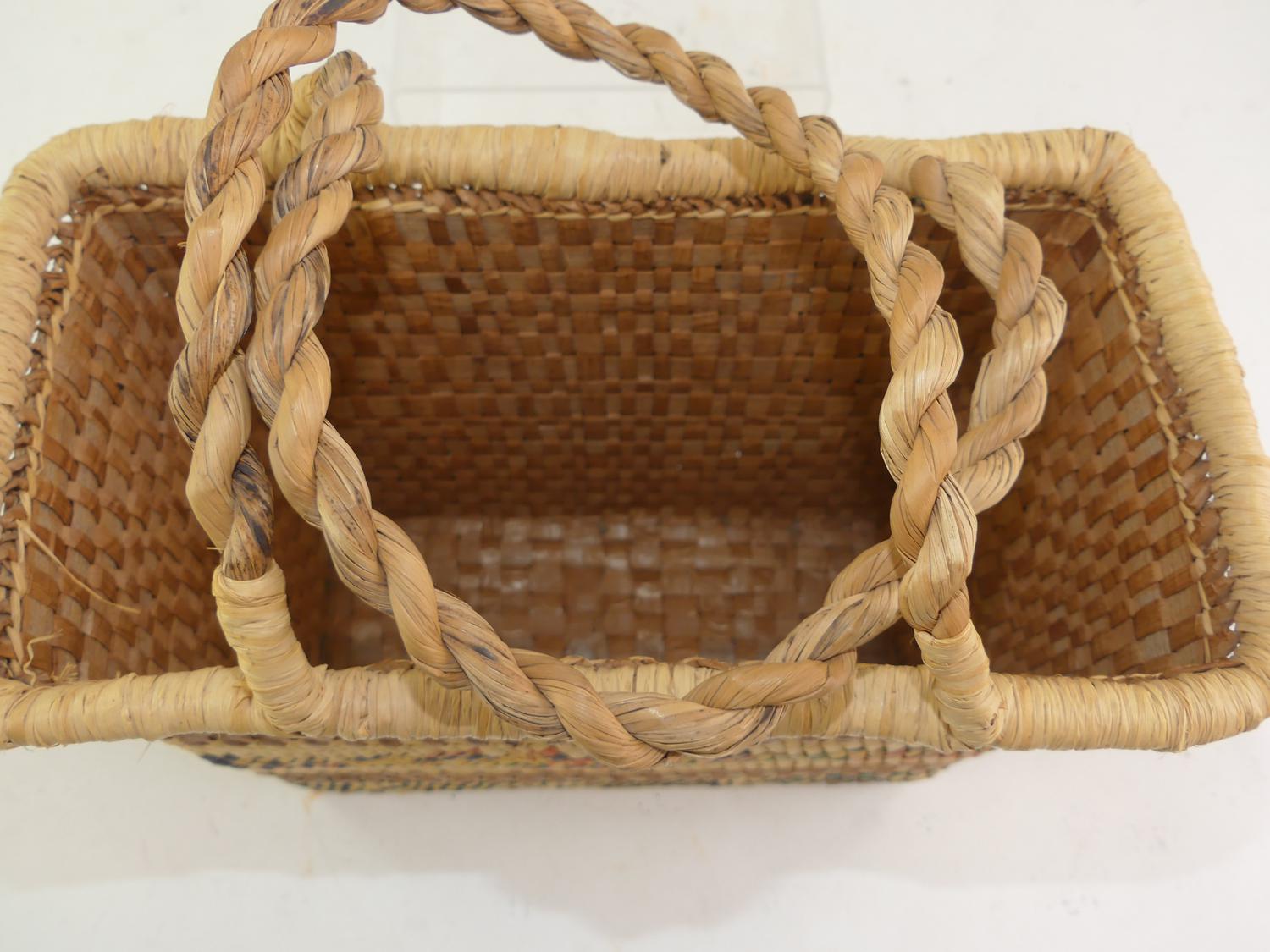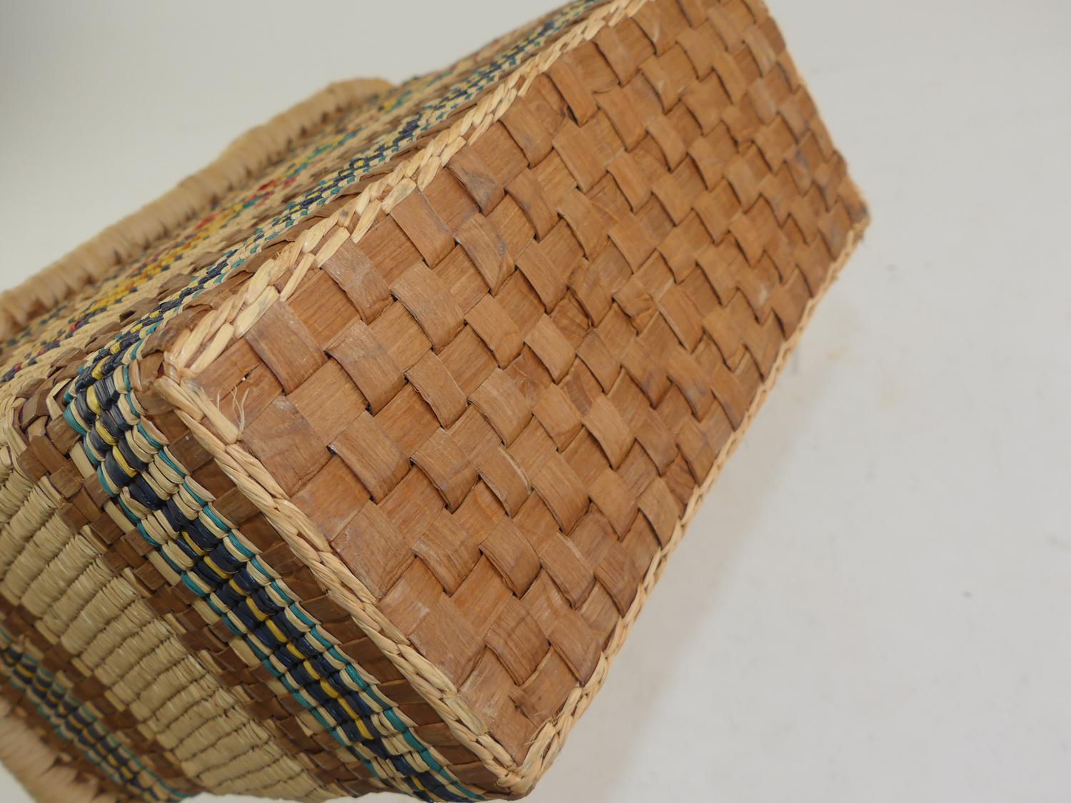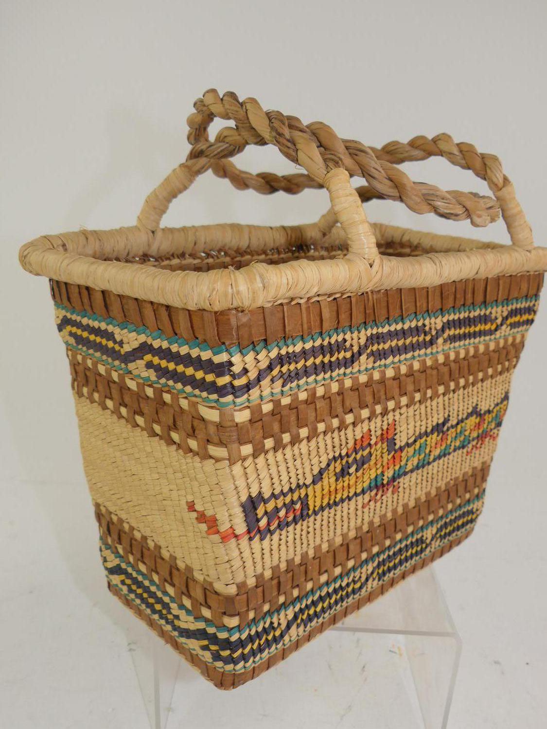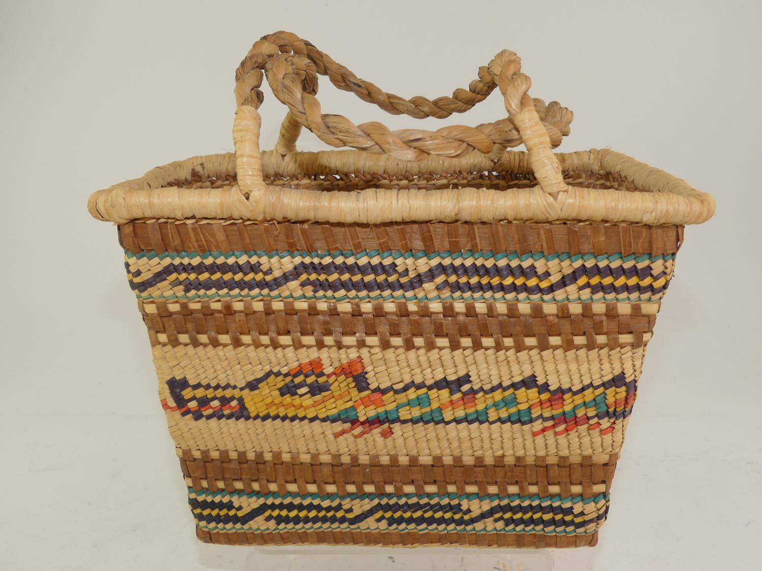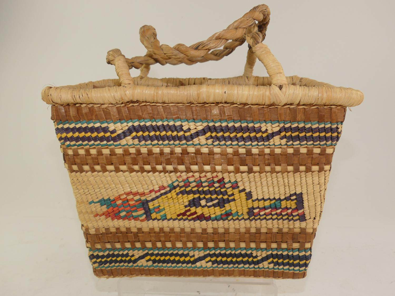 nuu-chah-nulth woven pictoral two handled basket, 15" x 12" x 6"
