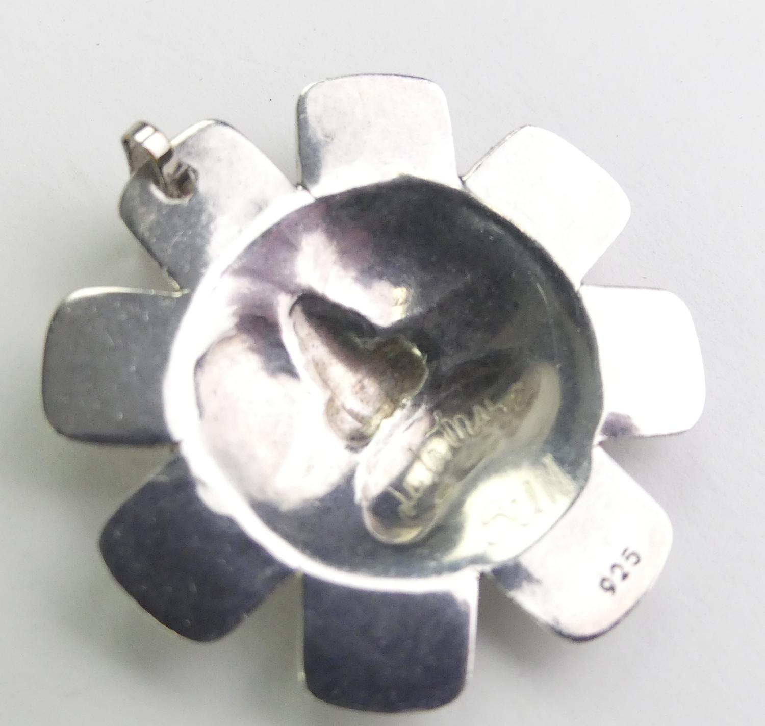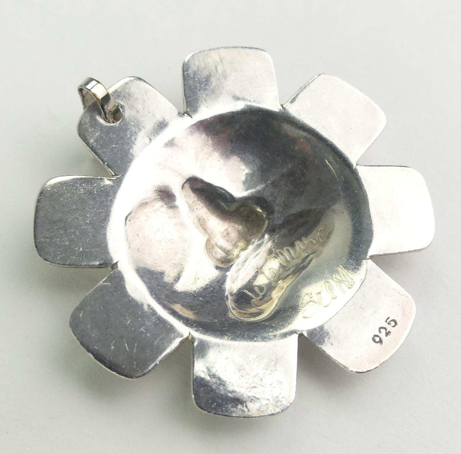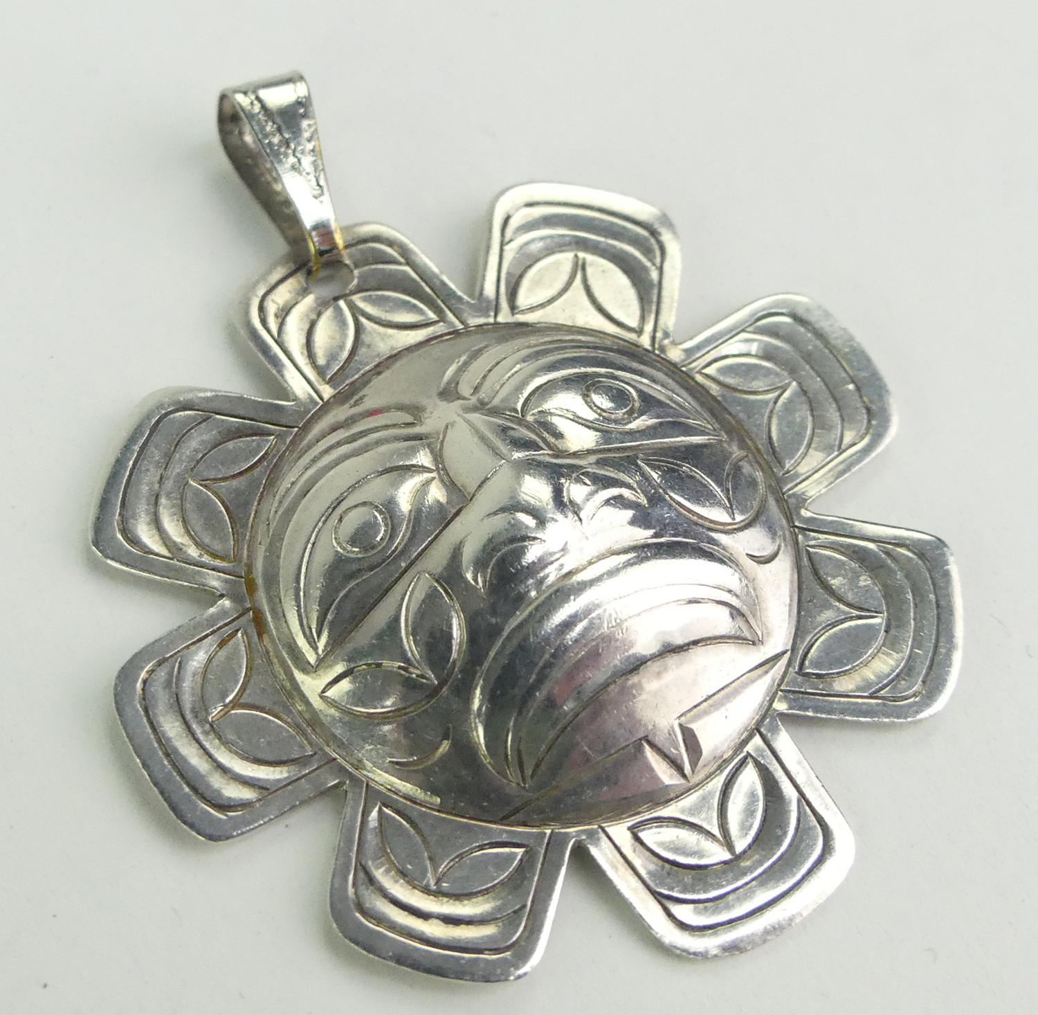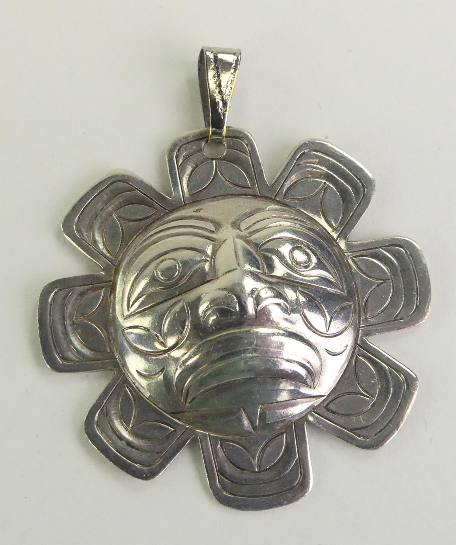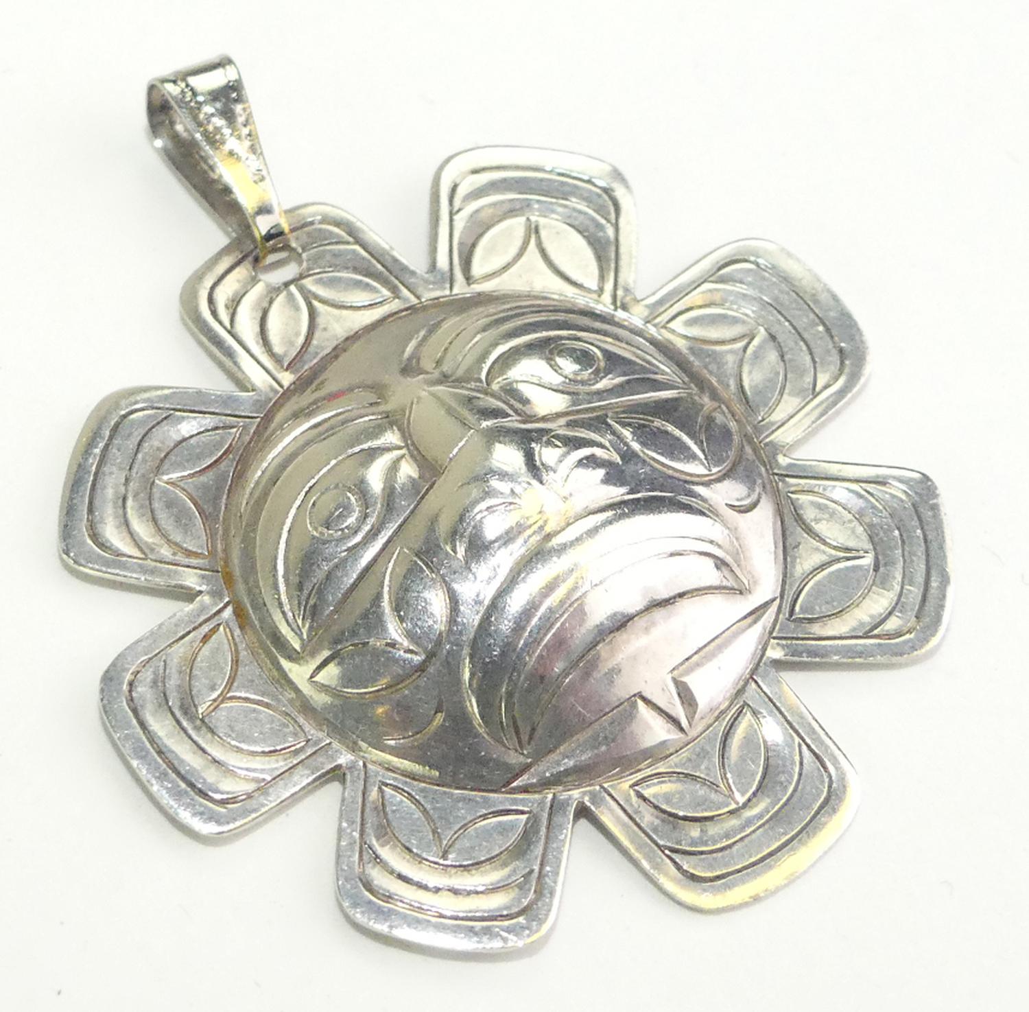 signed norman seaweed haida sterling silver de la mare pendant, 1 5/8" across